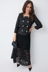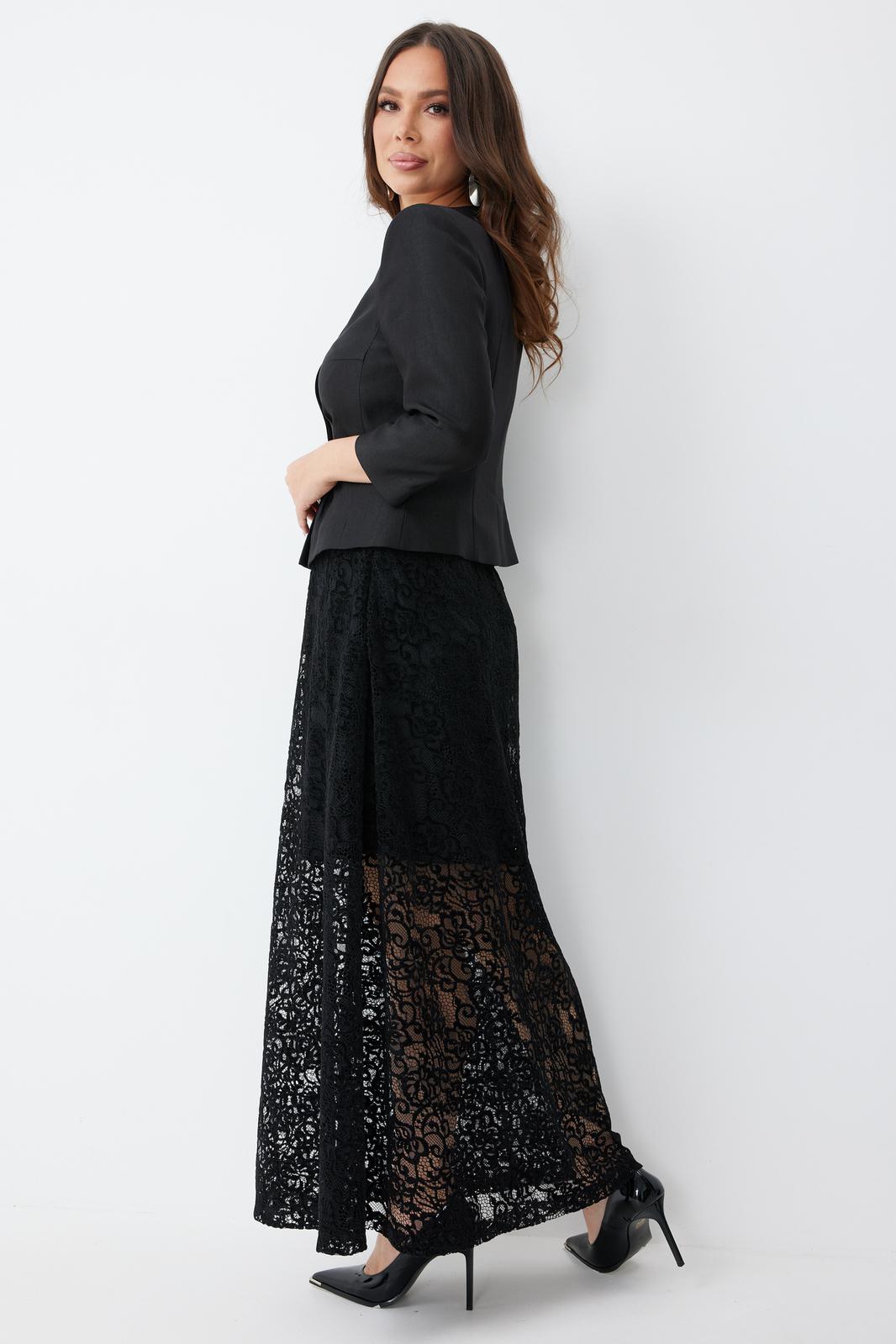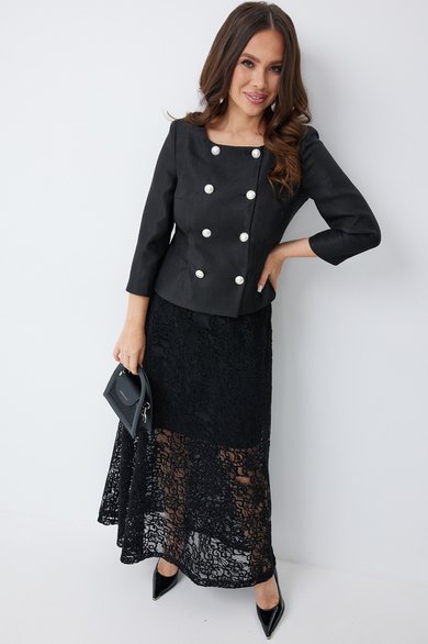 Нарядный комплект из жакета и кружевной юбки. Двубортный жакет полуприлегающего силуэта, на подкладке. Рукав длинный, втачной. Центральная застежка на красивые пришивные пуговицы. Юбка А-образного силуэта. Выполнена из красивого бархатного кружева на комфортной к телу подкладке. Юбка с притачным поясом, дополненным эластичной тесьмой. Застежка на потайную молнию и пуговицу. Длина жакета от плечевого шва 53см. Длина рукава 54см. Длина юбки 94см.