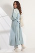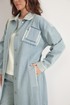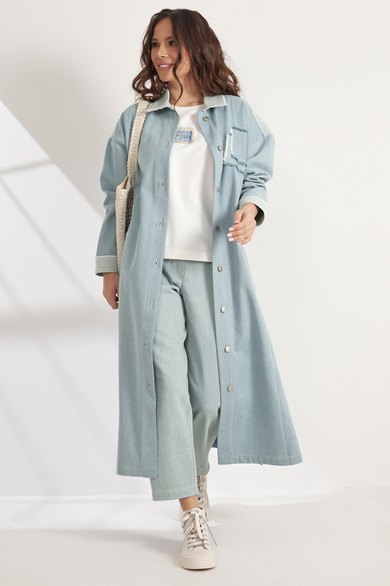 Стильных и универсальный предмет гардероба - джинсовый плащ (тренч) свободного кроя, без подкладки, с центральной застежкой на металлические пуговицы. Выполнен из качественного джинсового полотна. Плащ дополнен съемным поясом, выполненным из основной ткани, а так же удобными боковыми карманами. Рукав спущен. Длина плаща от плечевого шва 125 см. Длина рукава 61 см.