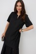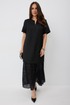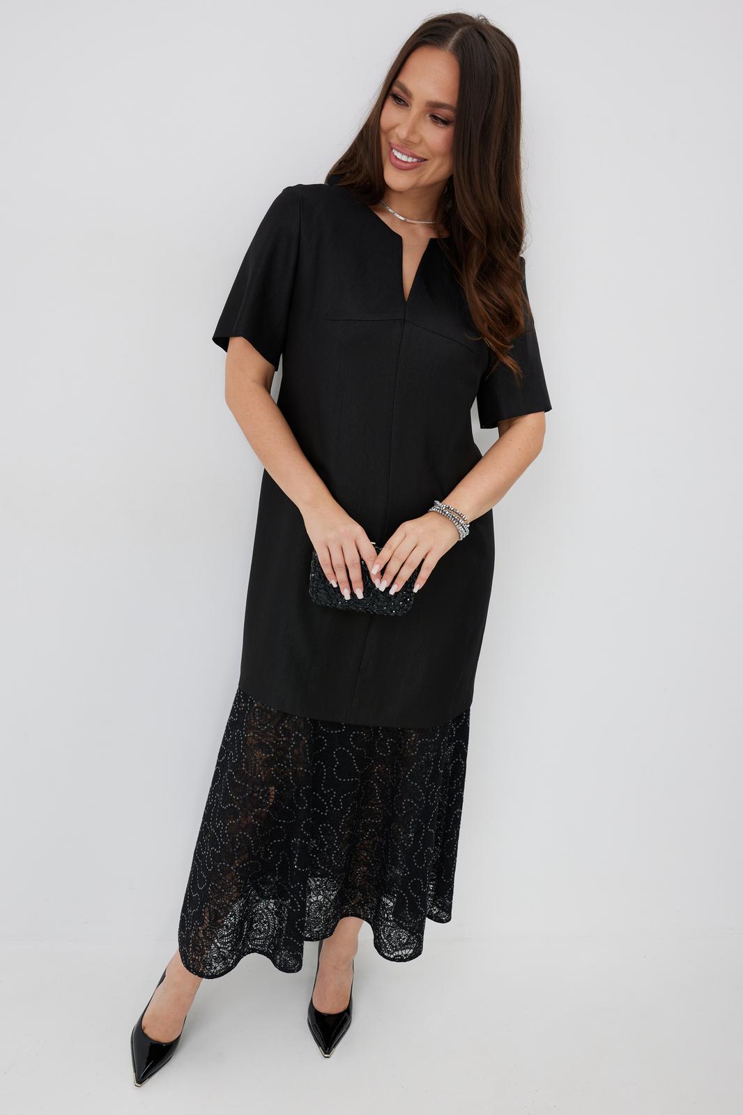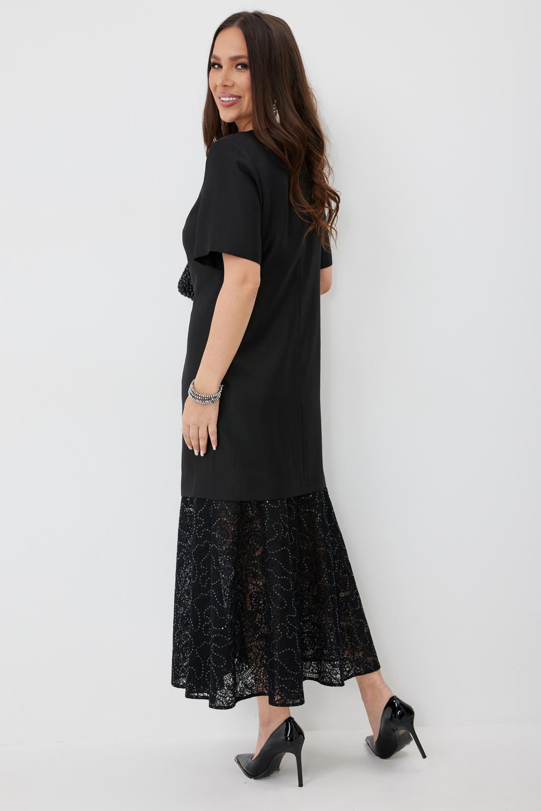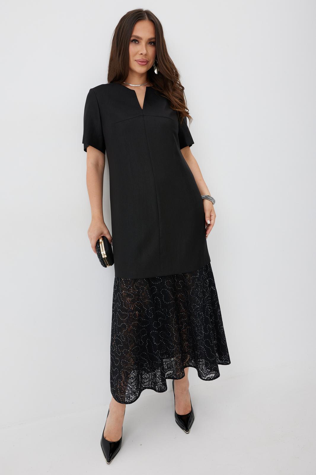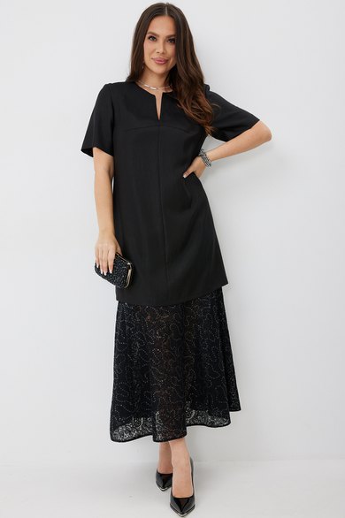 Элегантное платье свободного силуэта. Платье представлено, как нижнее платье из нежной подкладочной ткани, дополненной по низу притачным воланом из красивого кружева с пайетками, и верхнего короткого платья-туники из гладкой костюмной ткани. Застежка по спинке на потайную молнию. Длина верхнего платья от плечевого шва 85см. Длина рукава 25см. Длина нижнего платья от плечевого шва 123см.