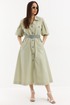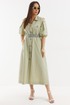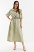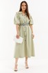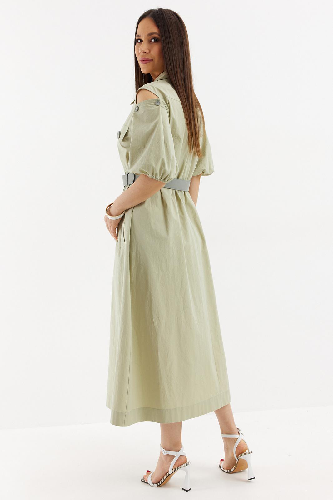 Легкое и воздушное платье из натуральной хлопковой ткани средней плотности с легким эффектом жатки, которая не просвечивает и прекрасно держит форму. Платье А-образного силуэта с центральной застежкой на пришивные пуговицы. Дополнено съемным ремнем с пряжкой. Горловина обработана отложным воротником. Объемный рукав присборен на эластичную тесьму. Дополнен красивыми вырезами. Удобные карманы расположены в боковых швах. Длина платья от плечевого шва 125 см. Длина рукава 36 см.