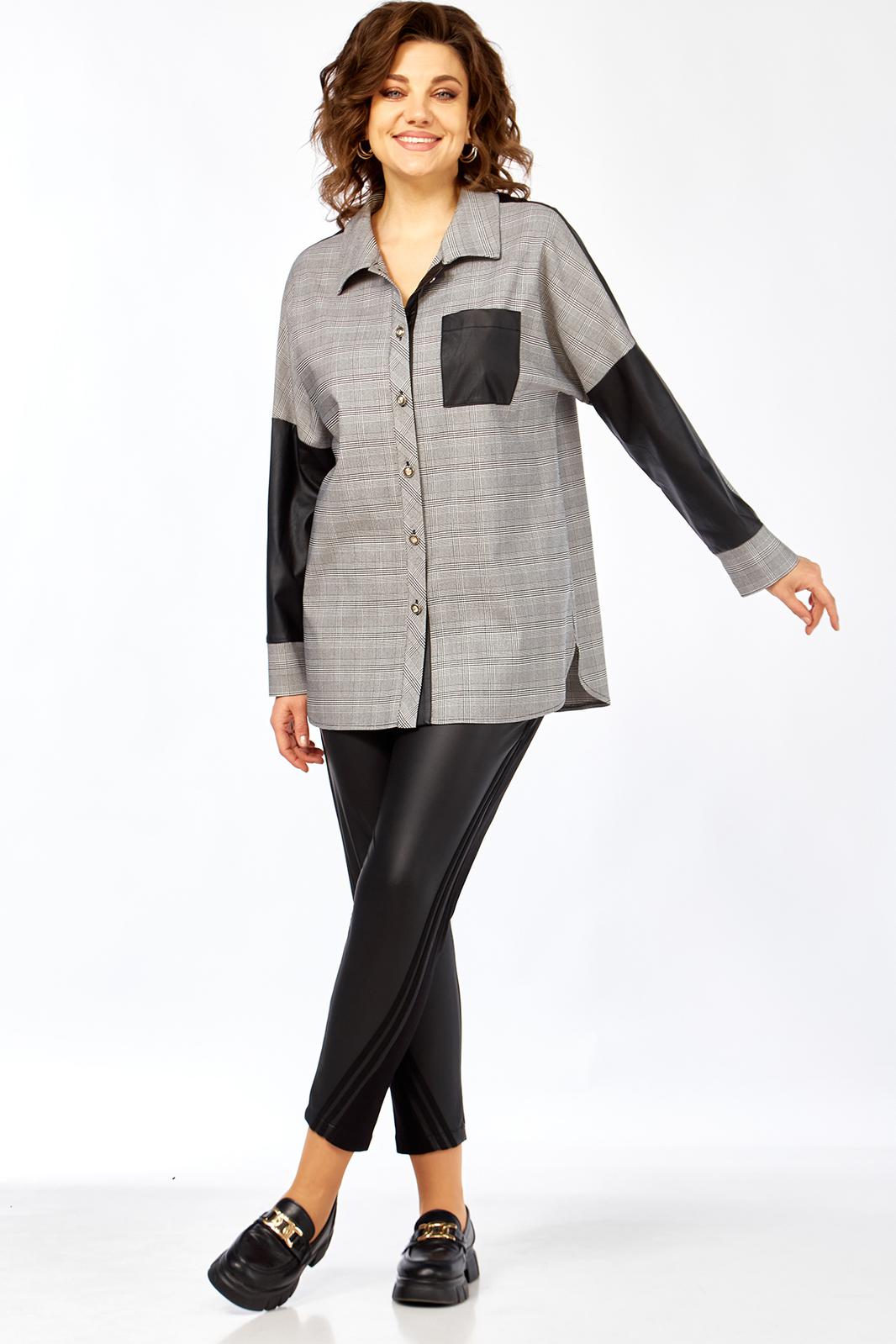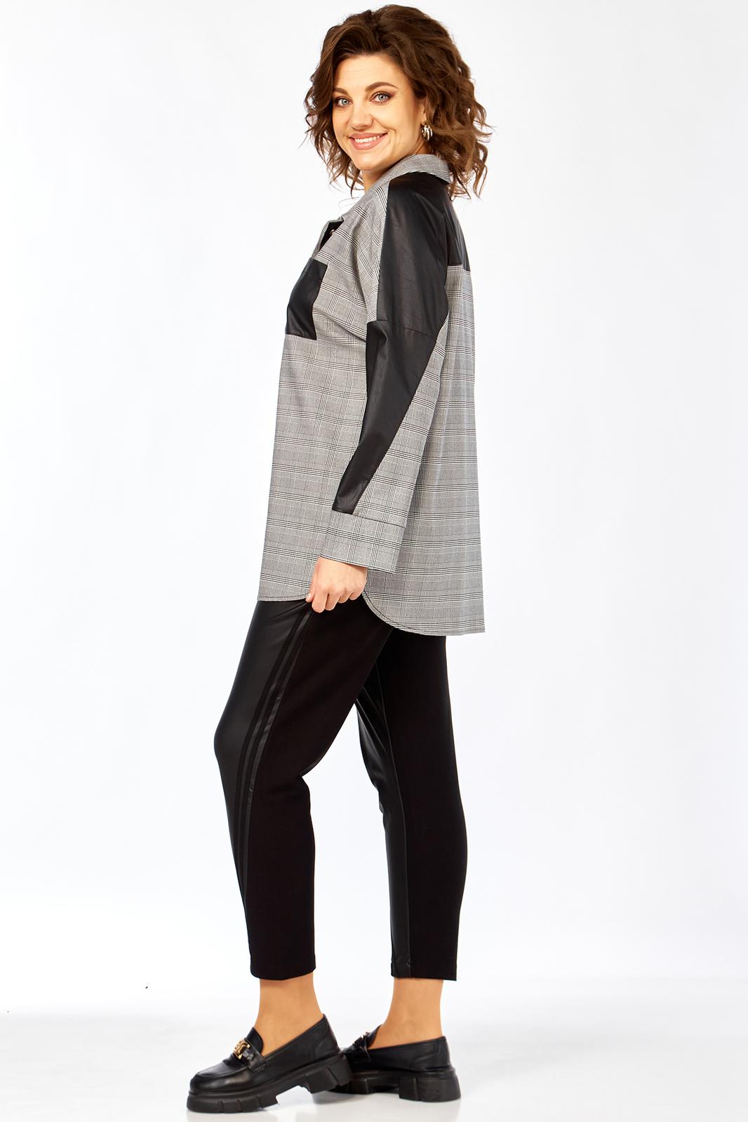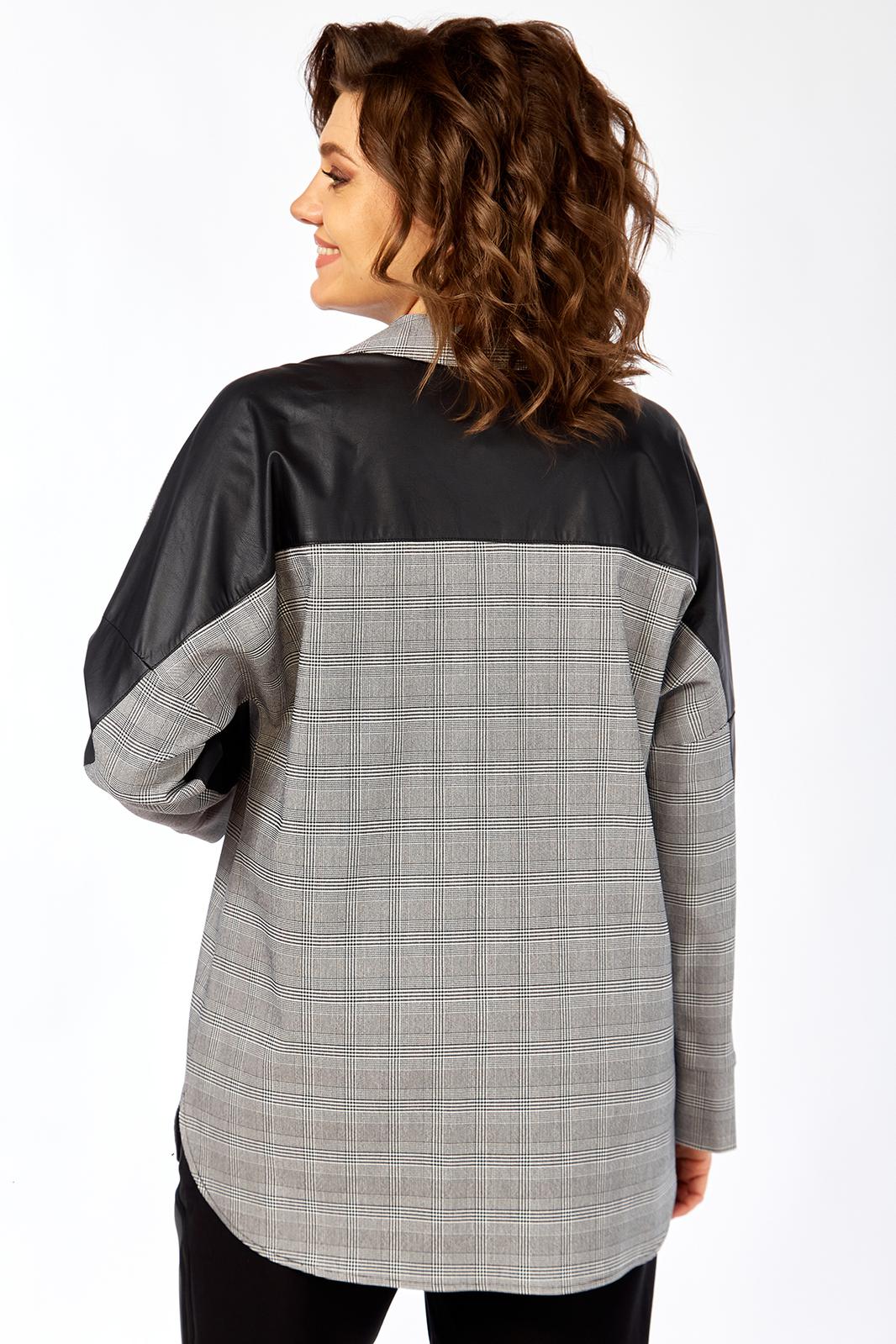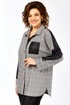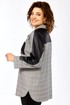Блузон женский прямого силуэта, комбинированный из 2-х видов ткани: клетка+кожа. Перед блузона на центральной застежке: петли-пуговицы с притачными планками. воротник рубашечный. На левой полочке накладной карман из отделочной ткани. спинка с отрезной кокеткой из отделочной ткани. В боковых швах выполнены карманы. Рукав рубашечный со спущенной линий плеча и притачной манжетой.