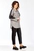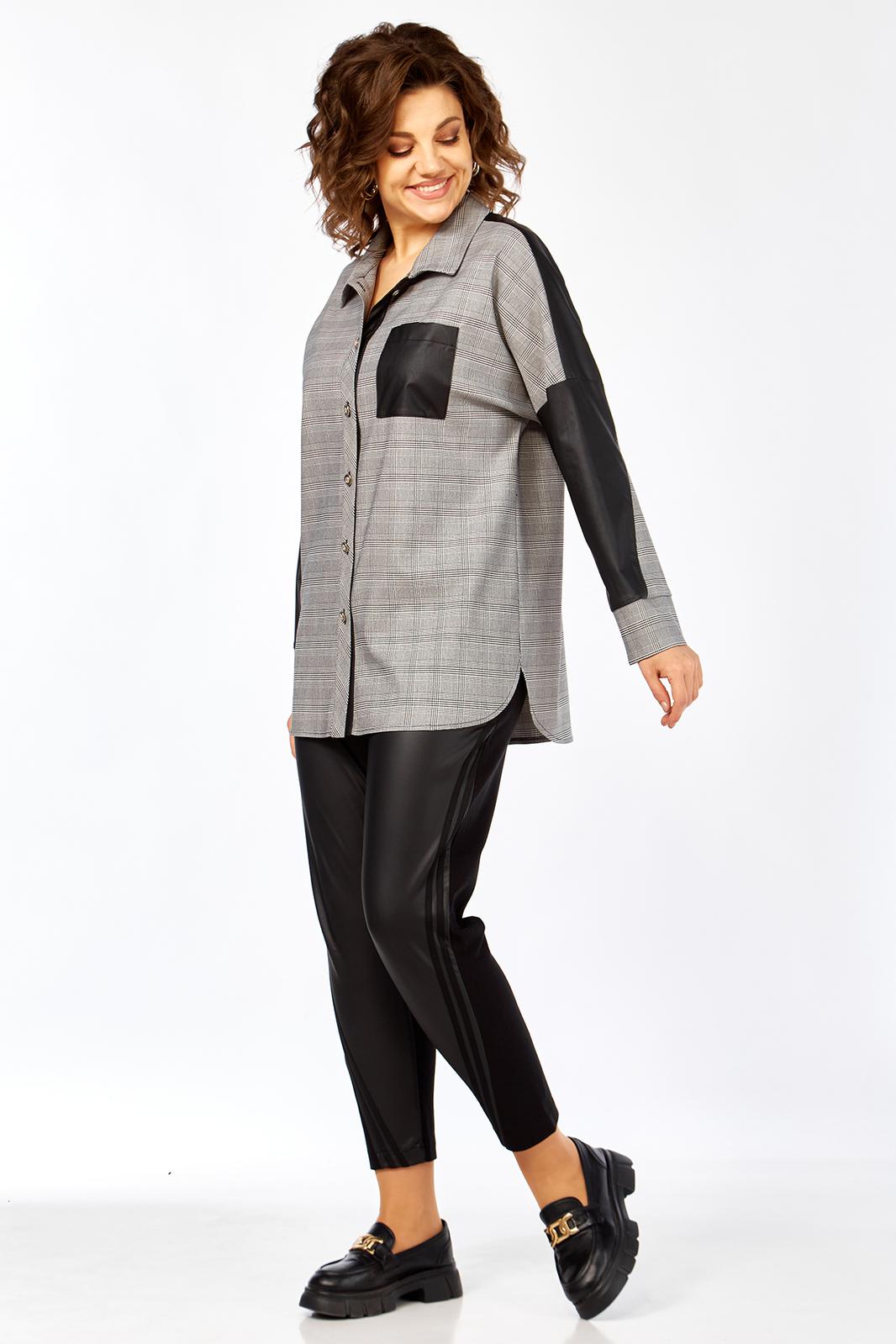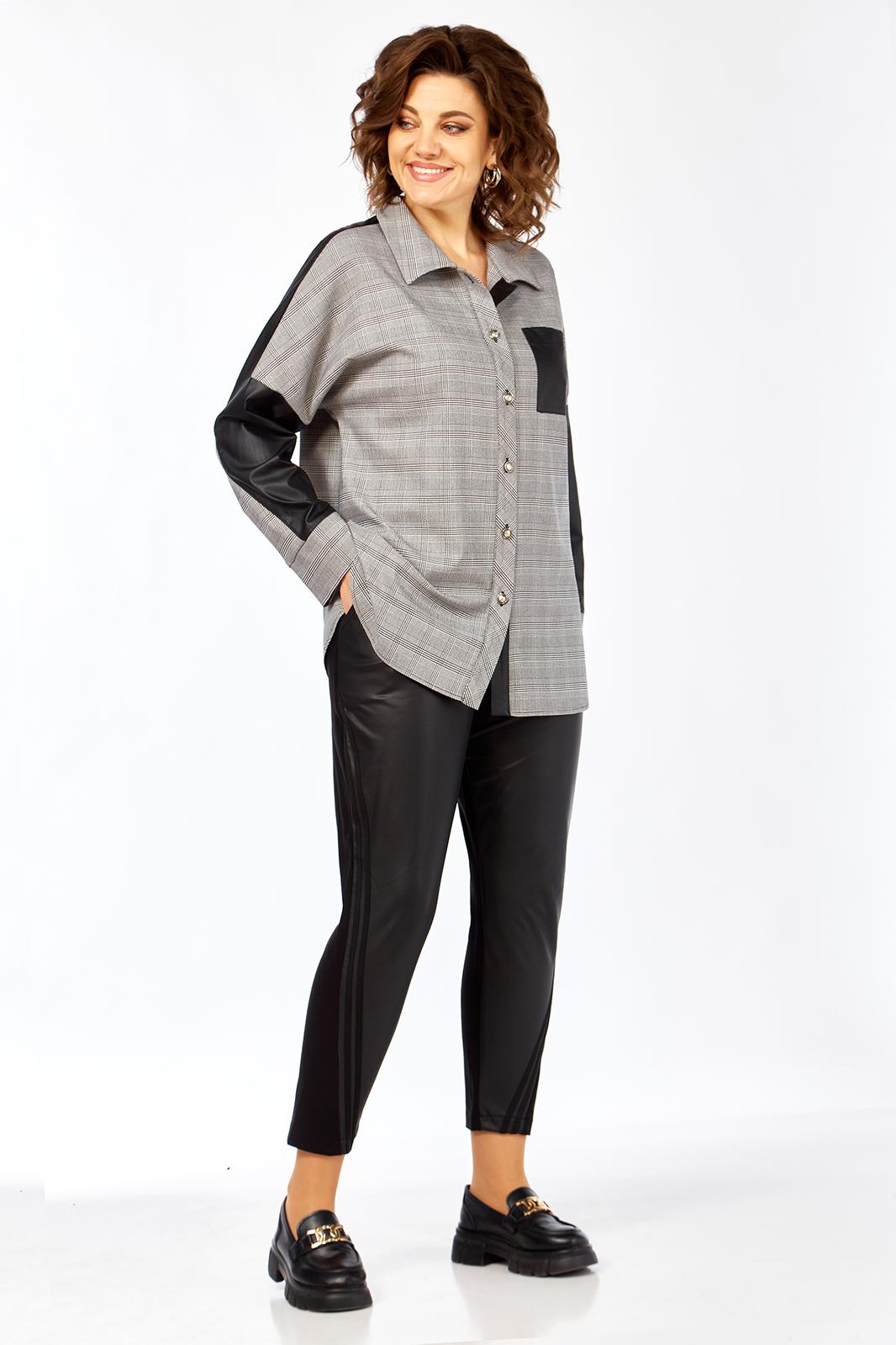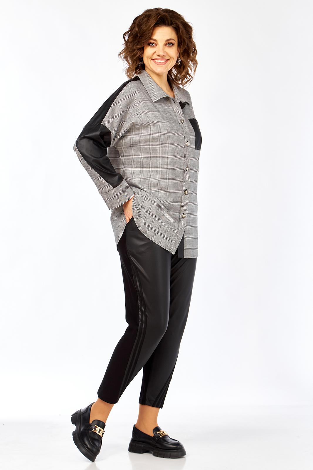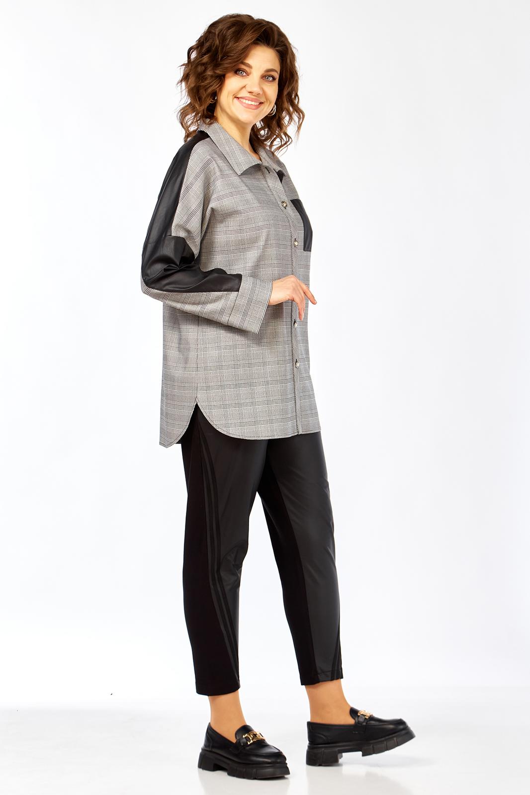 Блузон женский прямого силуэта, комбинированный из 2-х видов ткани: клетка+кожа. Перед блузона на центральной застежке: петли-пуговицы с притачными планками. воротник рубашечный. На левой полочке накладной карман из отделочной ткани. спинка с отрезной кокеткой из отделочной ткани. В боковых швах выполнены карманы. Рукав рубашечный со спущенной линий плеча и притачной манжетой.