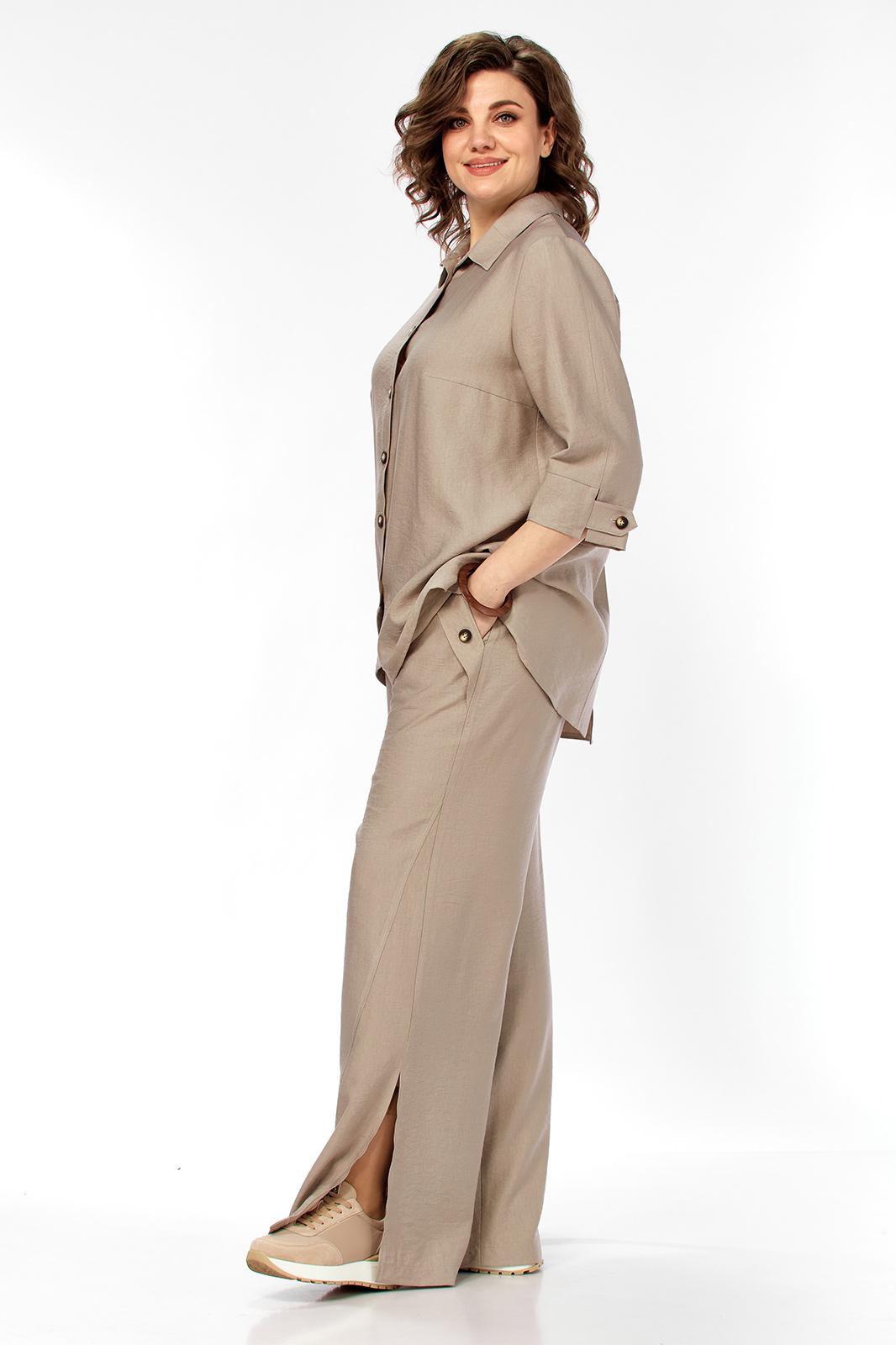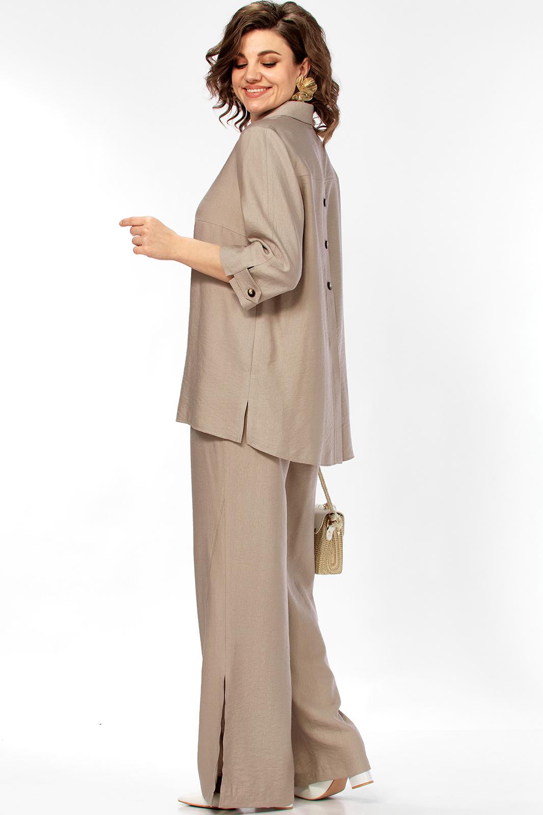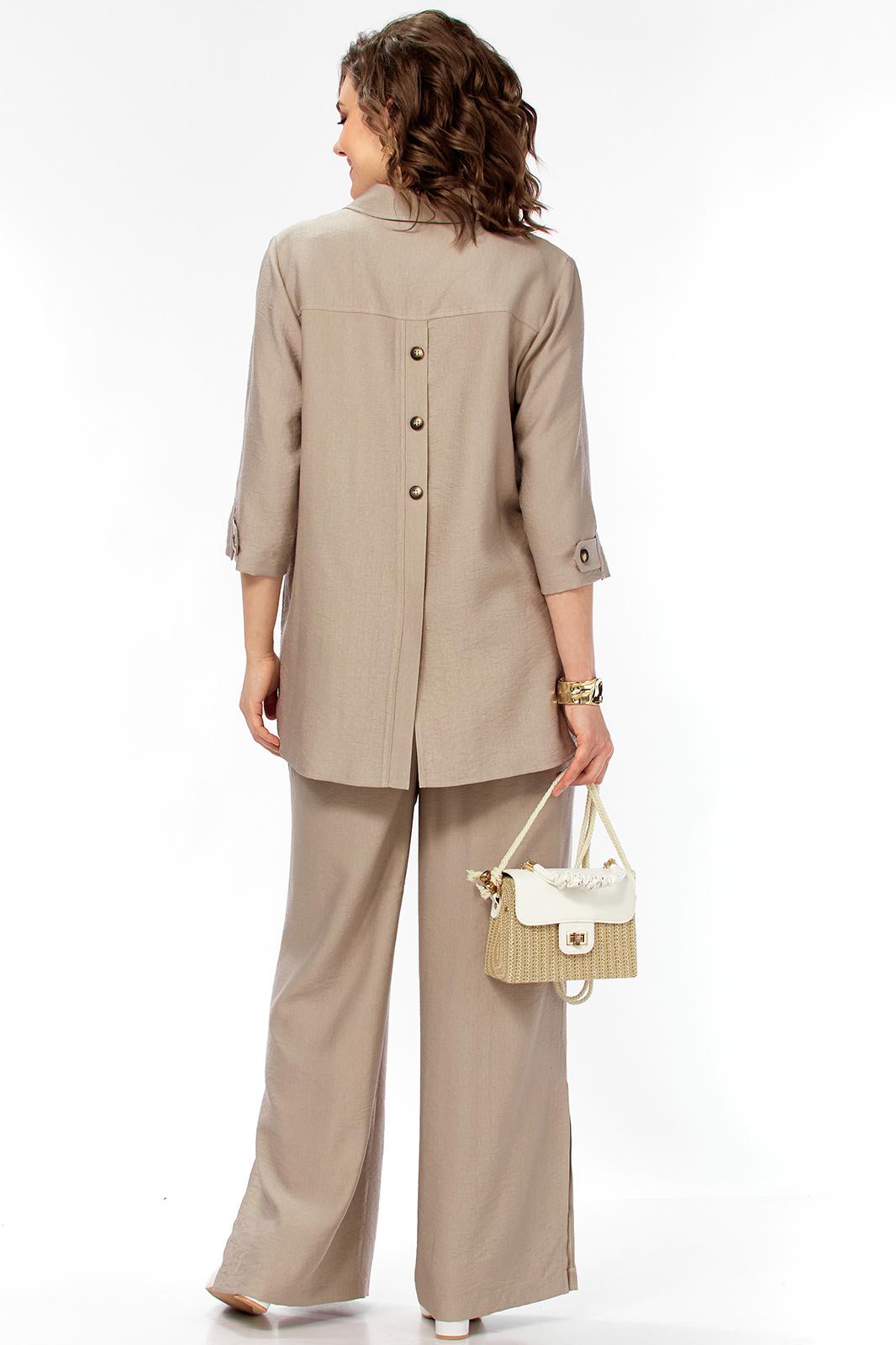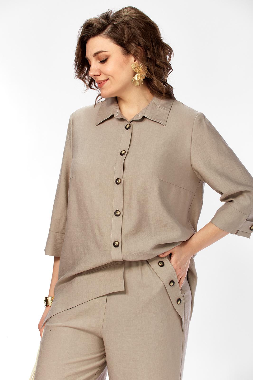 Комплект женский 2х предметный, состоящий из брюк и блузона. Брюки свободного кроя, на круговой резинке, с карманами в боковых швах и разрезами в боковых. По низу брюк имеются декоративные подрезы. Блузон свободного кроя. Перед на отрезной планке с застежкой на петли-пуговицы. Низ блузона по переду ассиметричен, имеется подрез на правой полочке. Перед с нагрудными вытачками из боковых швов. Воротник рубашечный на отрезной стойке. Спинка с отрезной кокеткой, по среднему шву имеется отрезная планка с декоративными пуговицами. Разрезы в боковых швах. Рукав втачной, одношовный, длиной 3/4, с отрезной манжетой по низу. Манжета с декоративной патой на петлю-пуговицу.