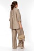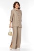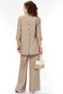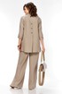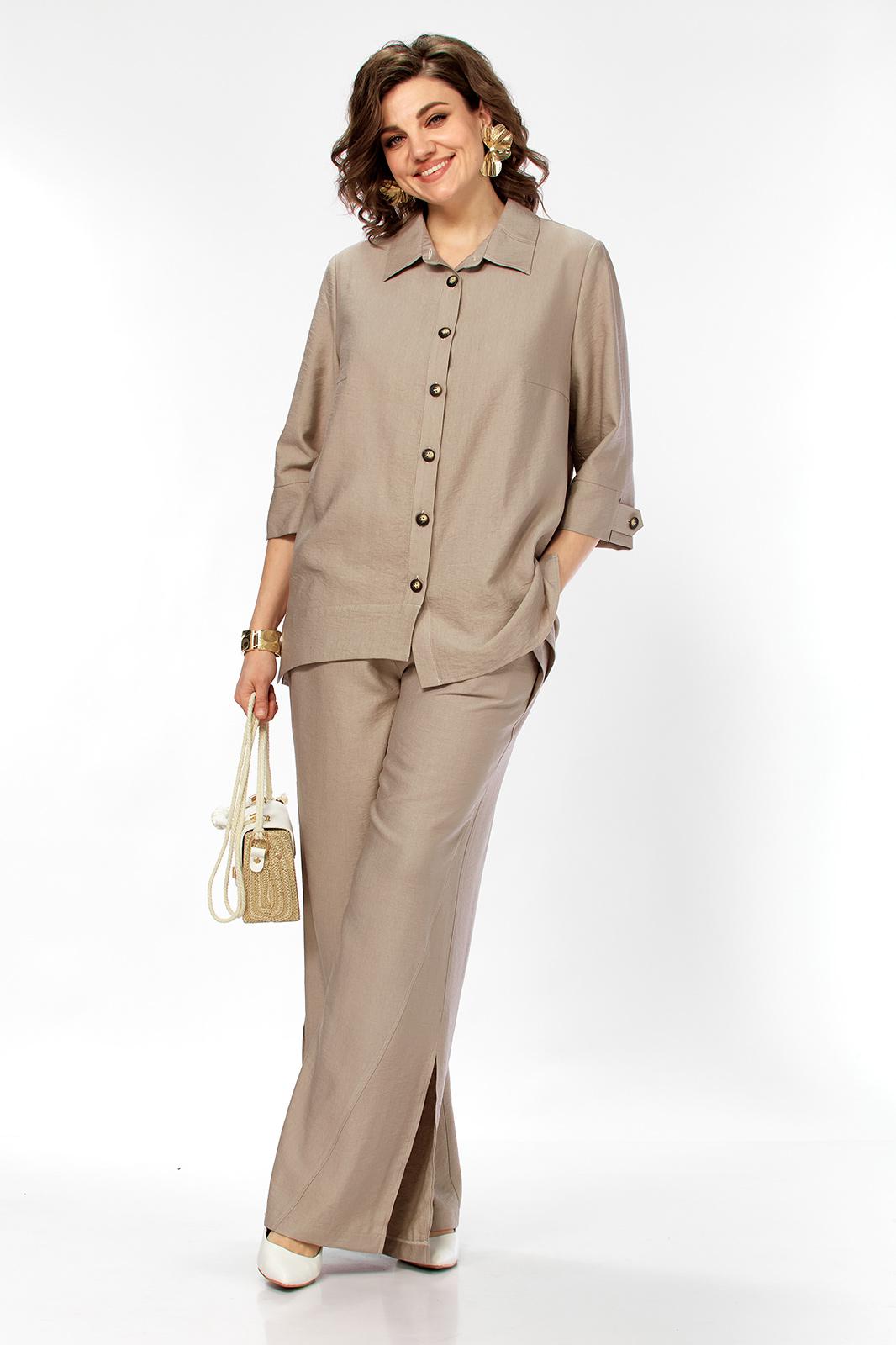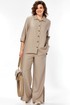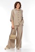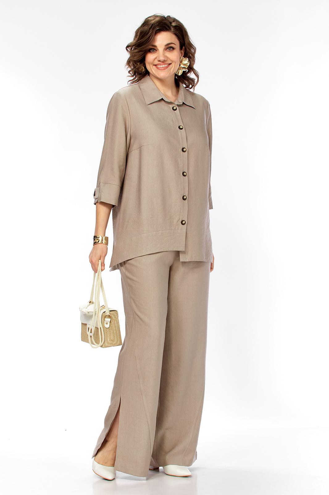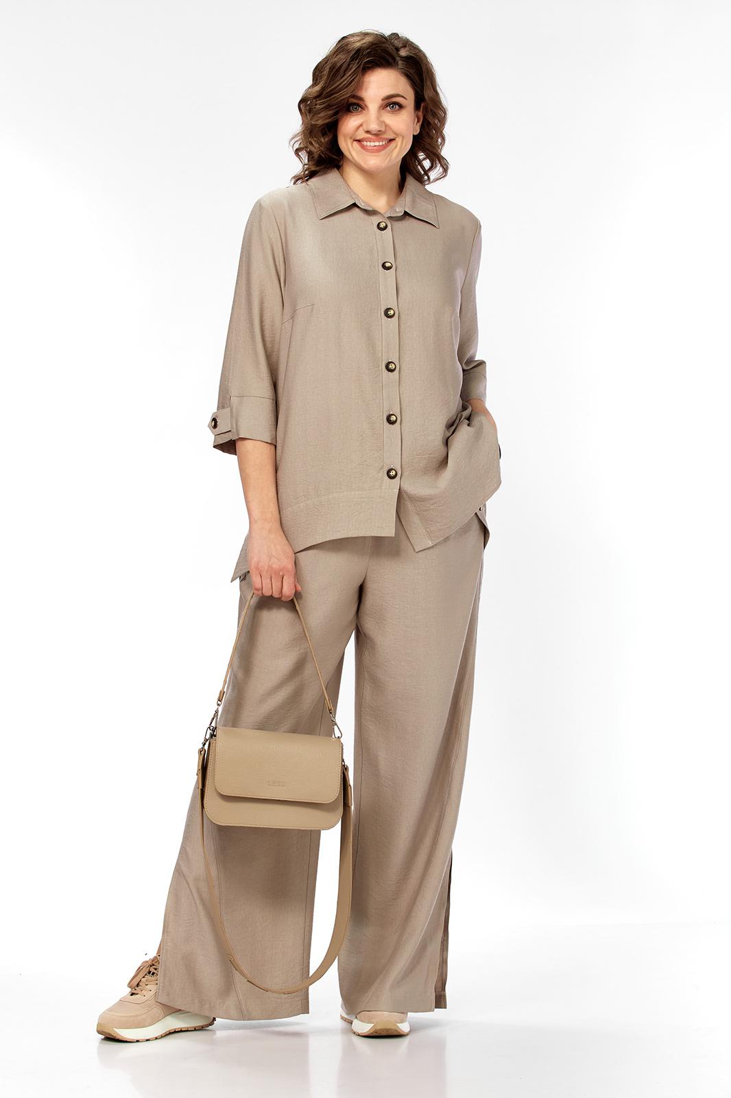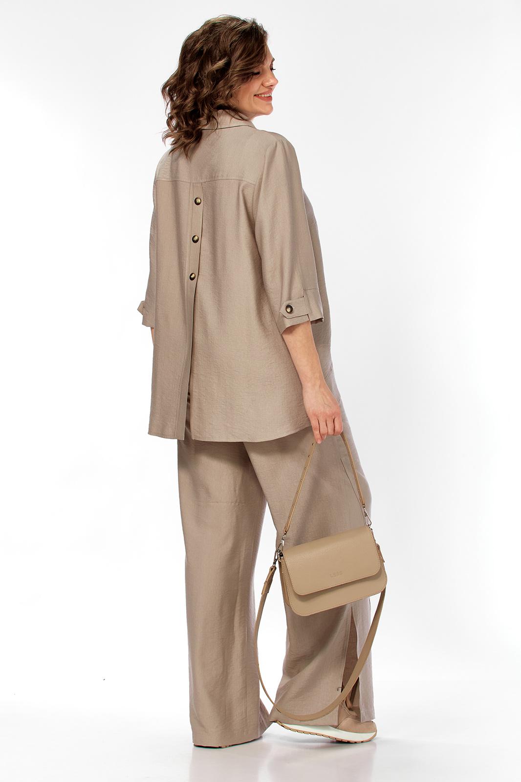 Комплект женский 2х предметный, состоящий из брюк и блузона. Брюки свободного кроя, на круговой резинке, с карманами в боковых швах и разрезами в боковых. По низу брюк имеются декоративные подрезы. Блузон свободного кроя. Перед на отрезной планке с застежкой на петли-пуговицы. Низ блузона по переду ассиметричен, имеется подрез на правой полочке. Перед с нагрудными вытачками из боковых швов. Воротник рубашечный на отрезной стойке. Спинка с отрезной кокеткой, по среднему шву имеется отрезная планка с декоративными пуговицами. Разрезы в боковых швах. Рукав втачной, одношовный, длиной 3/4, с отрезной манжетой по низу. Манжета с декоративной патой на петлю-пуговицу.