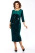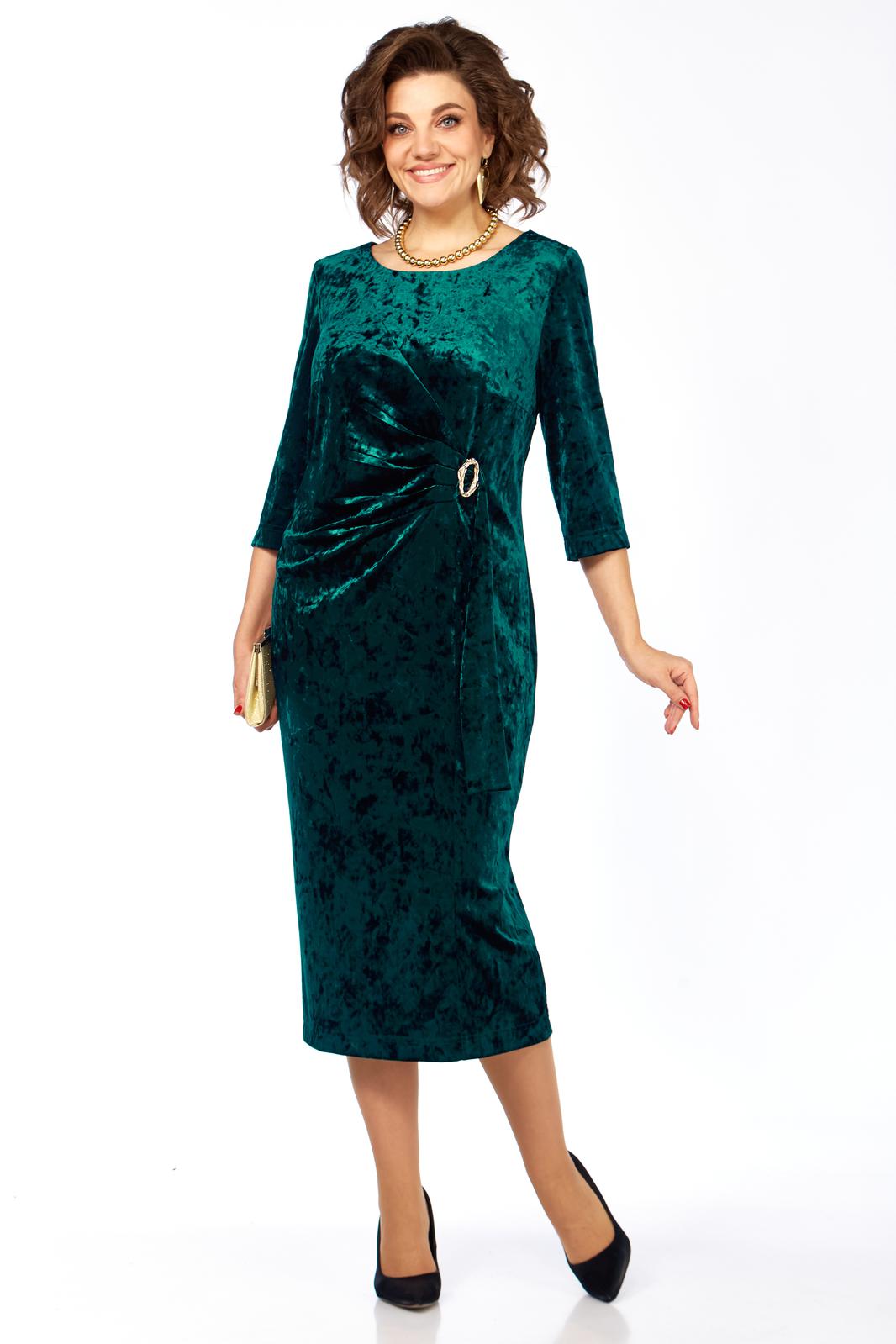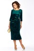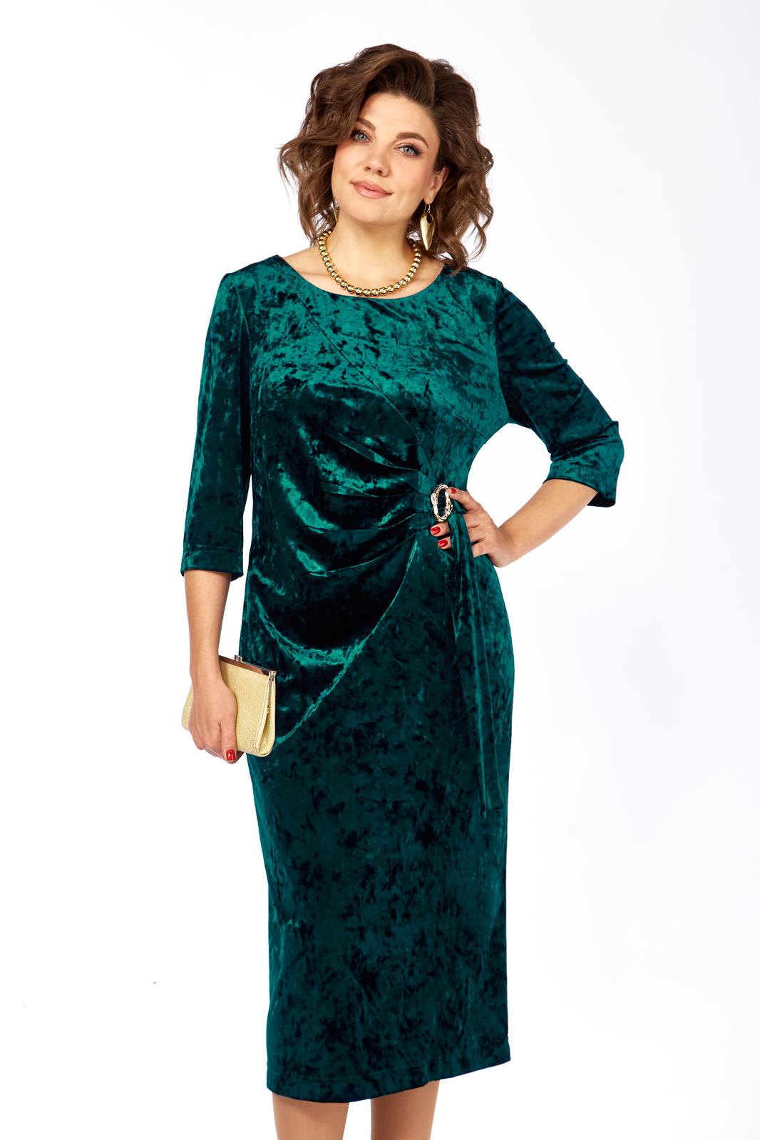 Платье женское, выполнено из бархатного полотна, длиной миди. Спинка со средним швом, шлицей на движение и потайной тесьмой-молнией. Перед с нагрудными вытачками из боковых швов, округлым вырезом горловины, и подрезом от правого плеча. Правая деталь переда присобирается в драпировку в области талии и закреплена декоративной пряжкой. Рукав втачной одношовный, длиной 3/4.