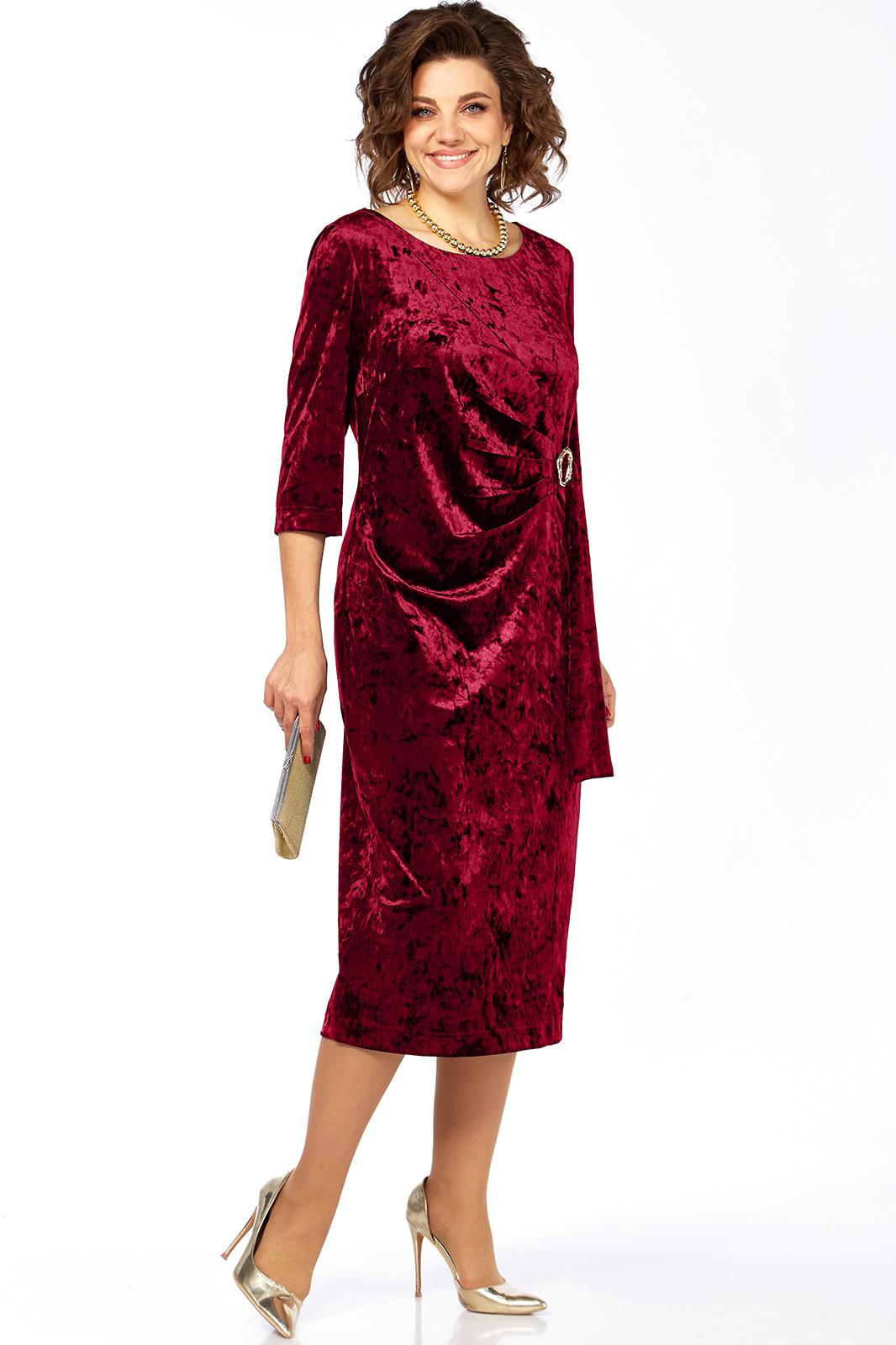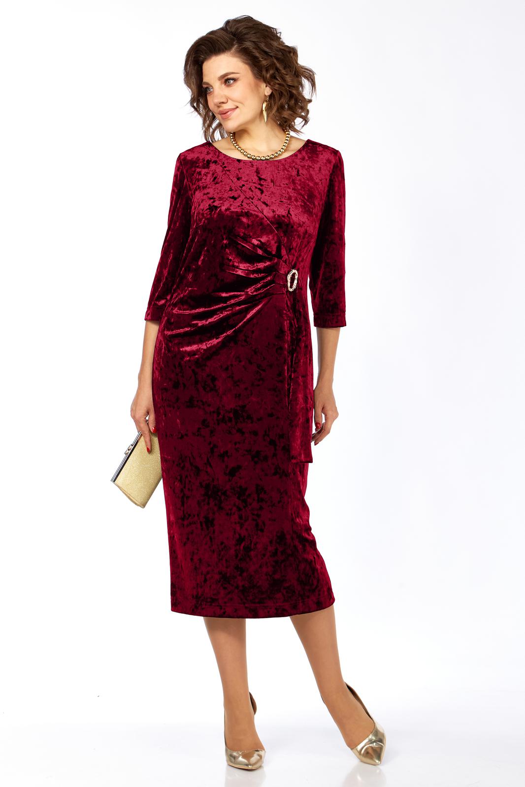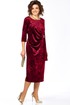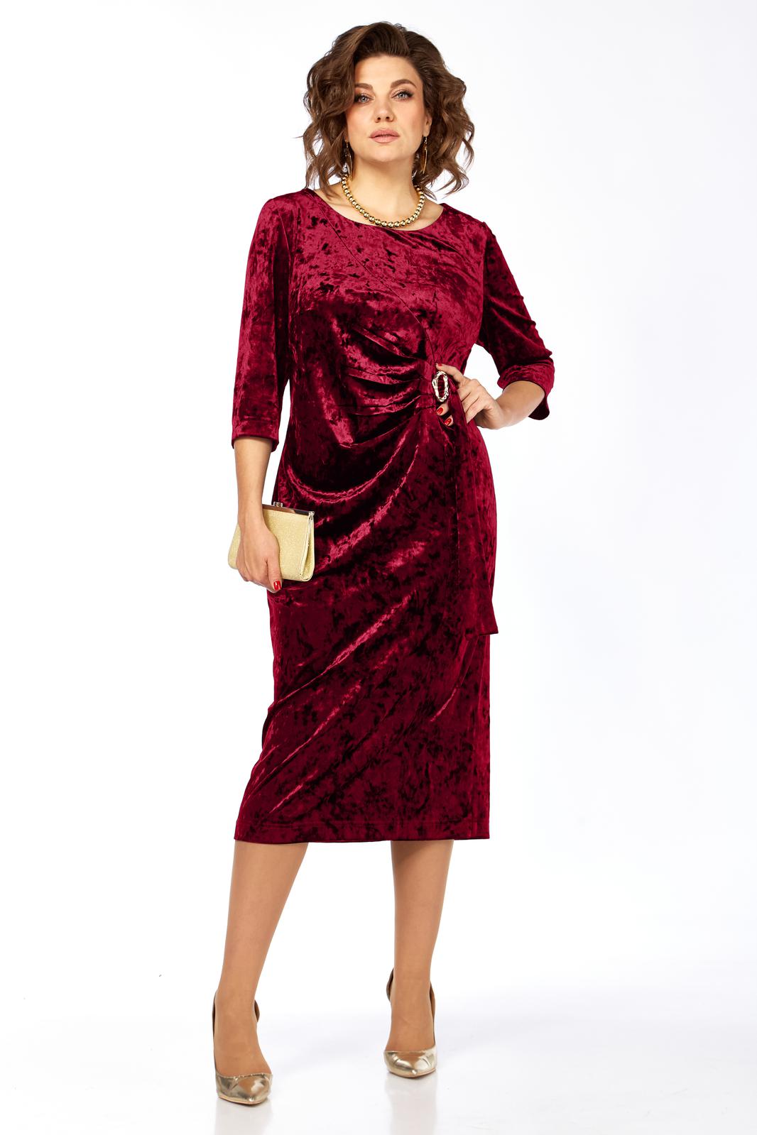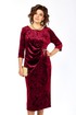 Платье женское, выполнено из бархатного полотна, длиной миди. Спинка со средним швом, шлицей на движение и потайной тесьмой-молнией. Перед с нагрудными вытачками из боковых швов, округлым вырезом горловины, и подрезом от правого плеча. Правая деталь переда присобирается в драпировку в области талии и закреплена декоративной пряжкой. Рукав втачной одношовный, длиной 3/4.