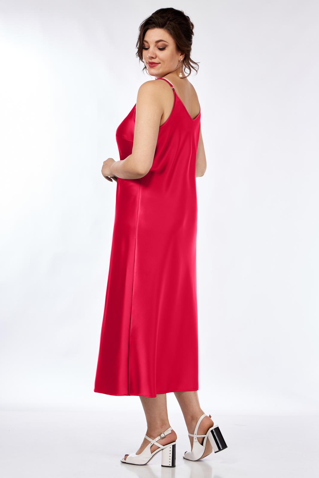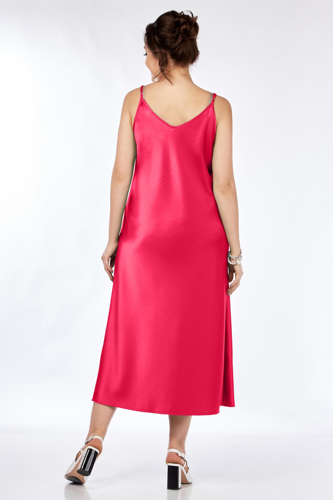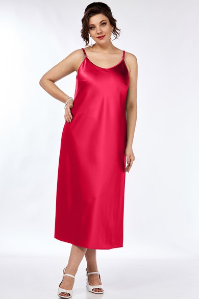 Платье полуприлегающего силуэта, из плотной атласной ткани. Длина миди, с нагрудными вытачками из боковых швов и с округлым вырезом горловины по переду и спинке, на тонких регулирующихся бретелях