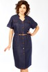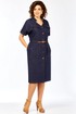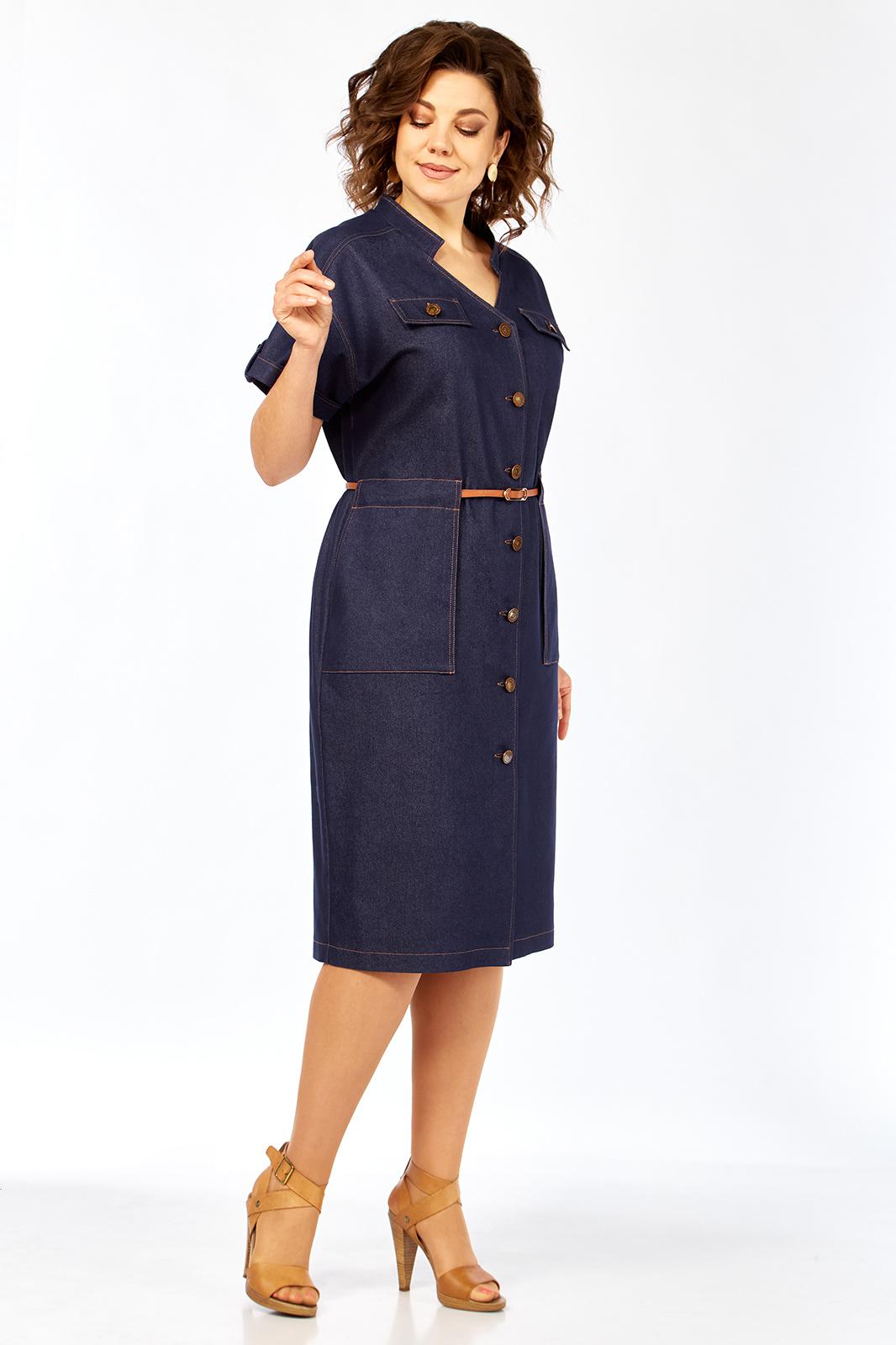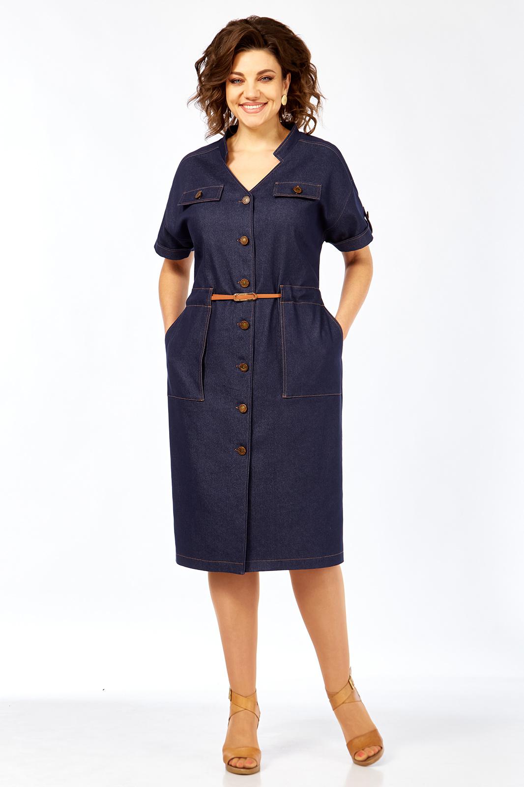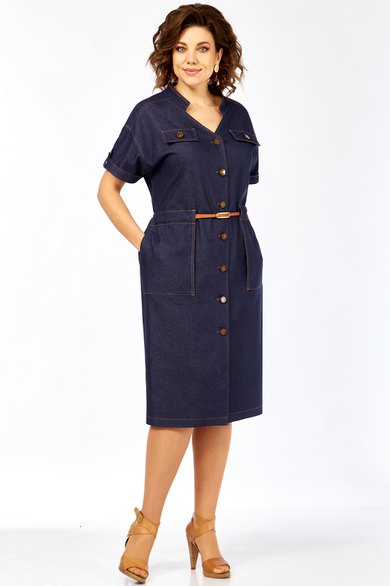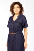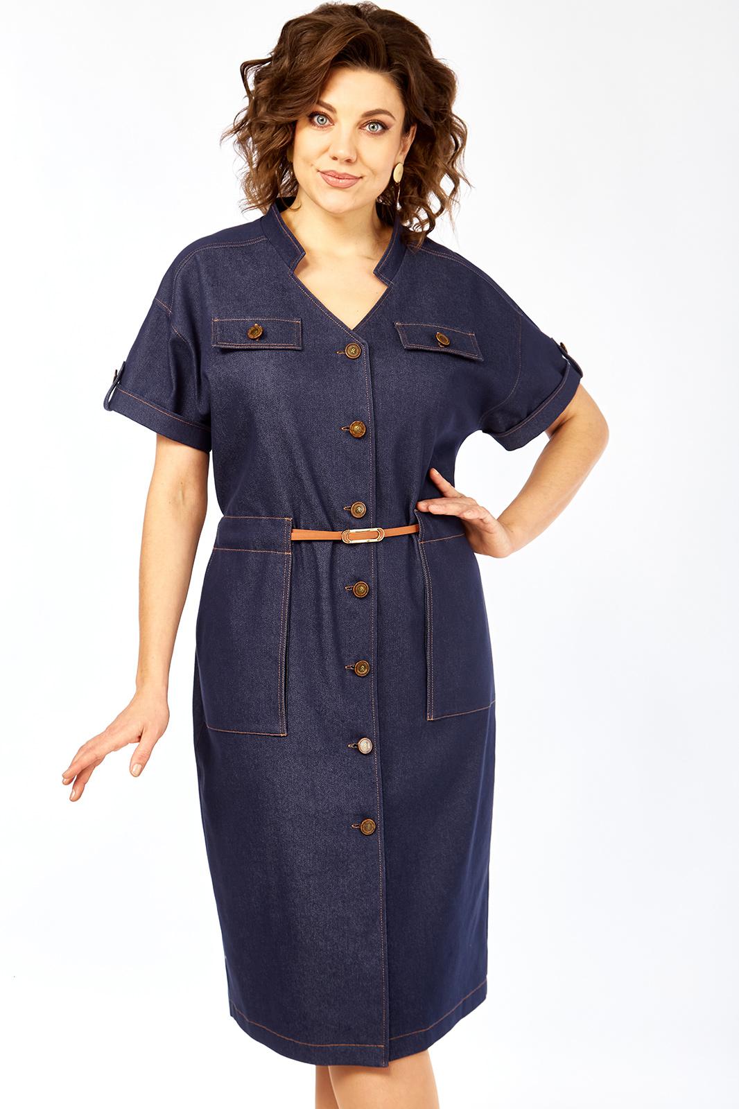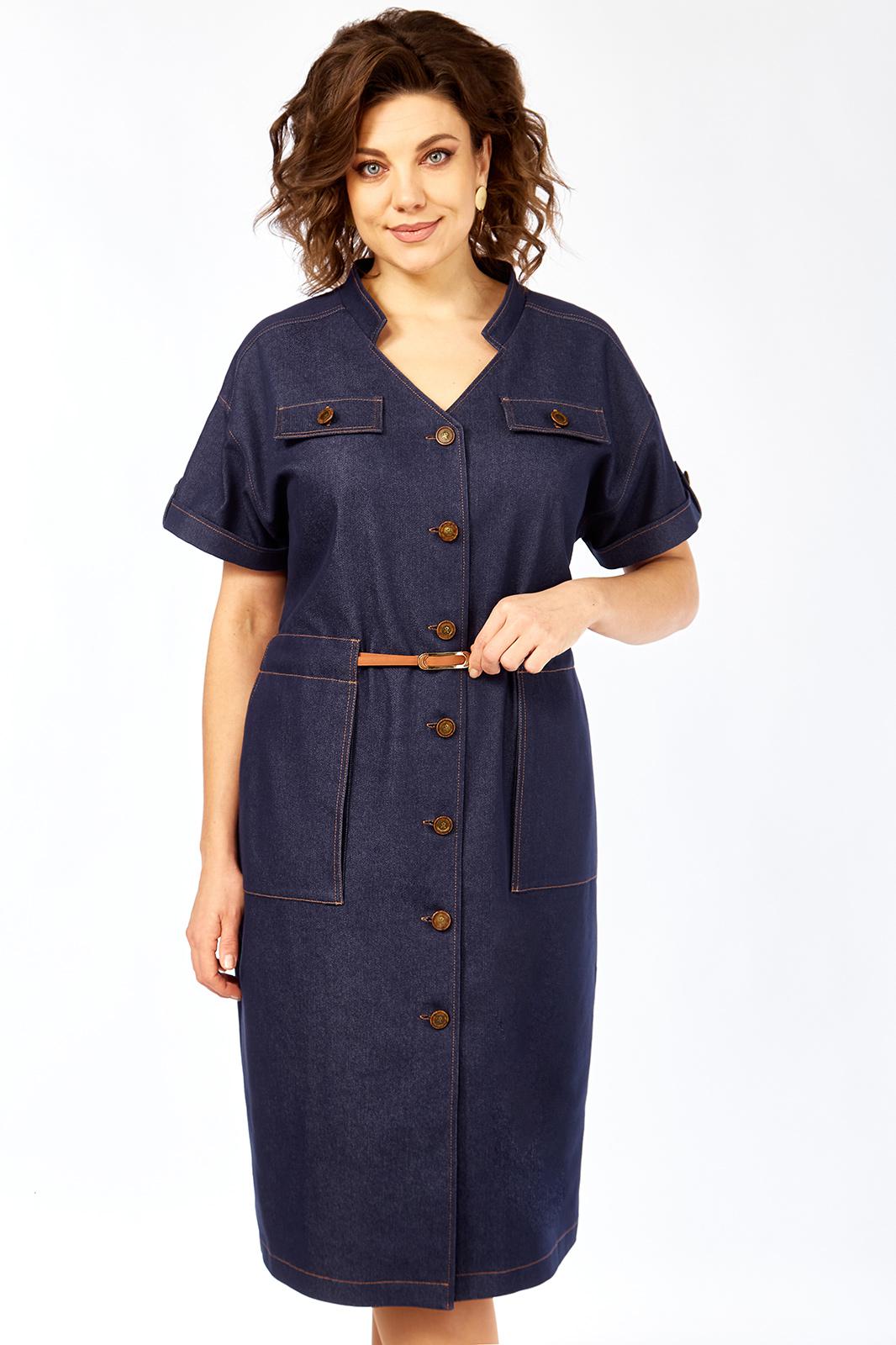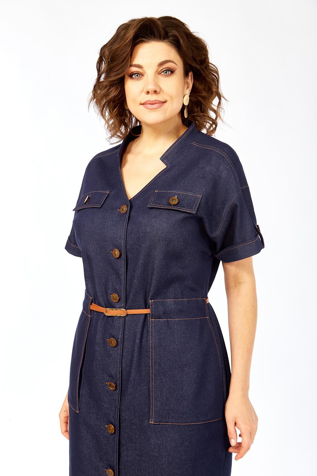 Платье женское прямого силуэта с коротким рукавом, рубашечного типа со спущенной линией плеча. Рукав с небольшим отворотом и патой. В плечевом обрезная кокетка. Перед платья с центральной бортовой застежкой на 7 пуговиц. Горловина платья V-образной формы с воротником стойкой. По переду расположены 2 клапана на линии груди и 2 накладных кармана на линии бедер. На клапанах, патах и рукавах пришиты пуговицы. Сквозь накладных карманов по линии талии продевается съемный пояс.
