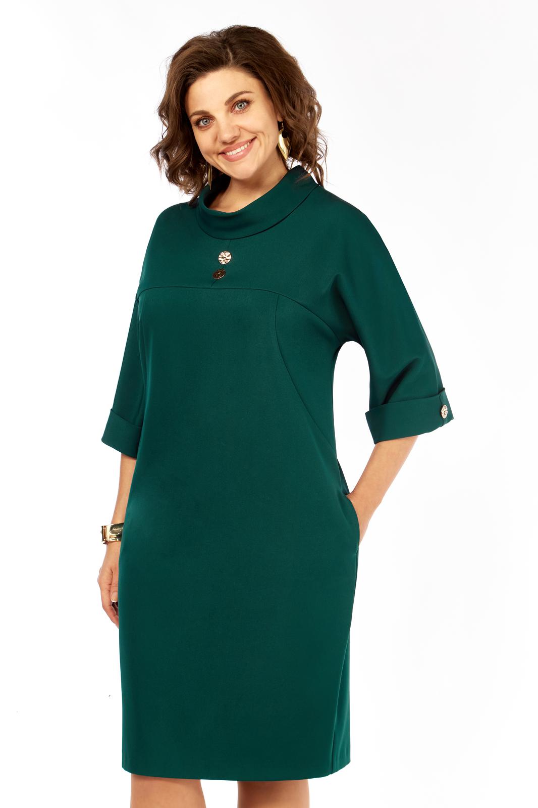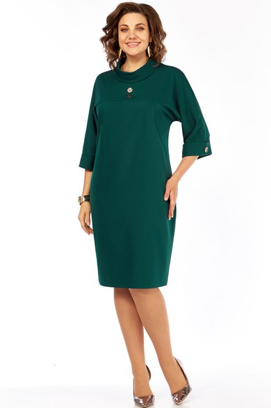 Платье женское выполнено из гладкокрашенной плательной ткани. По переду платья кокетка со средним швом, на которой расположены декоративные украшения. По спинке платья кокетка и средний шов. В боковых швах-внутренние карманы. По горловине платья-воротник хомут. По низу рукавов отложные манжеты, закрепленные декоративным украшением.