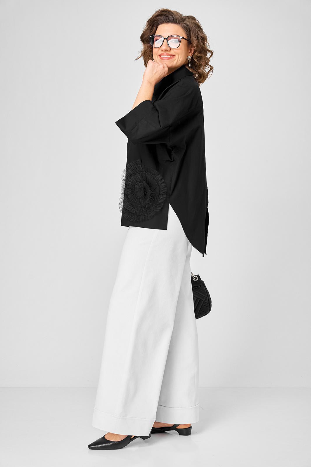 Женская хлопковая блуза в стиле «бохо» прекрасно вольется в повседневную жизнь и станет одной из любимых базовых вещей в Вашем гардеробе. Блуза свободного кроя. Перед цельный с планкой-застежкой до груди. Спинка с плечевой кокеткой, переходящей в рукав. Рукав 3/4 с притачной манжетой по низу. Из-под кокетки спинки — запах из двух нижних деталей блузы, фигурный низ, по бокам изделия разрезы. По низу переда широкая подгибка. Декорирована блуза настрочным цветком из сетки. Изделие хорошо сочетается как с брюками, так и с юбками, с классической и спортивной обувью. Длина изделия по спинке 74 (+/- 1 см). Длина рукава от горловины 55 (+/- 1 см).