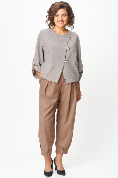Универсальный костюм, который выглядит дорого и современно, но при этом дарит комфорт и лёгкость. Его можно носить как комплект или по отдельности: жакет с асимметричной застёжкой и акцентными пуговицами легко сочетается с джинсами, а брюки свободного кроя идеально смотрятся с блузой или футболкой.