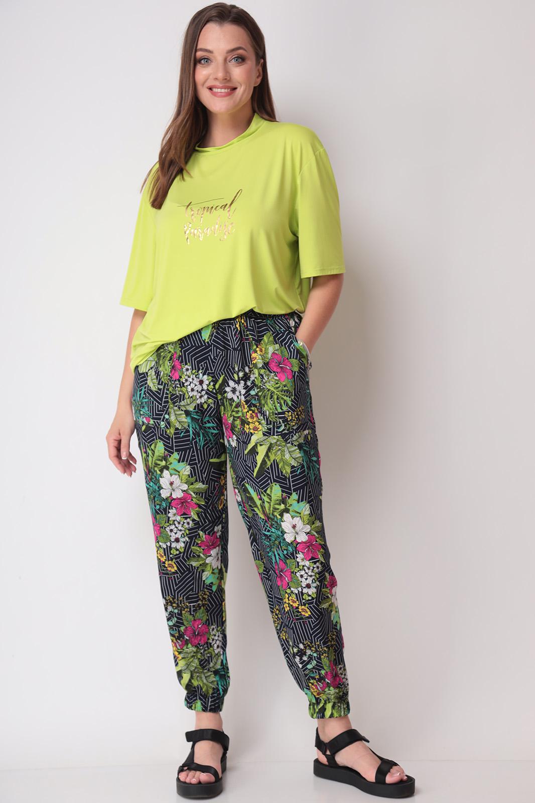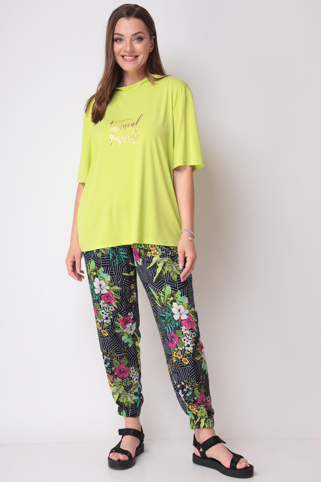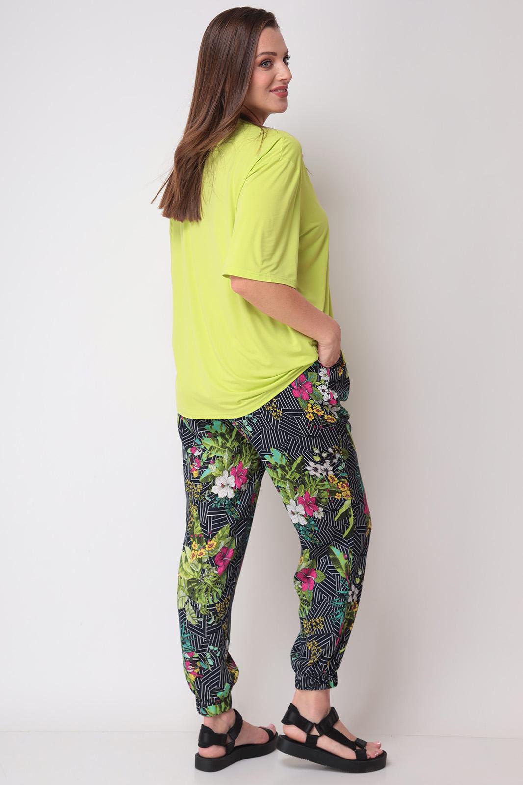 Отличный универсальный костюм на каждый день, где каждая вещь самостоятельная и может носиться с другими изделиями Вашего гардероба. Брюки из натуральной вискозной ткани, высокой посадки, свободного кроя, пояс на резинке, с боковыми карманами, снизу на резинке. Объемная футболка свободного кроя, прекрасно носится как навыпуск, так и заправленной. Выполнена из вискозного трикотажа, по переду нанесен контрастный принт, рукава укорочены. Длина футболки от горловины 73 см, длина рукава 29 см. Длина брюк по боковому шву 101 ( ± 1 см), по шаговому 70 ( ± 1 см). Изделие подойдет на рост 170 см