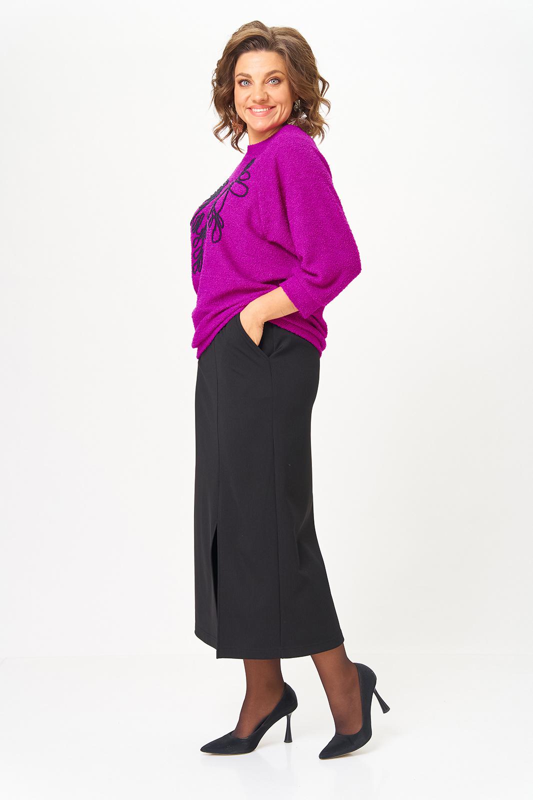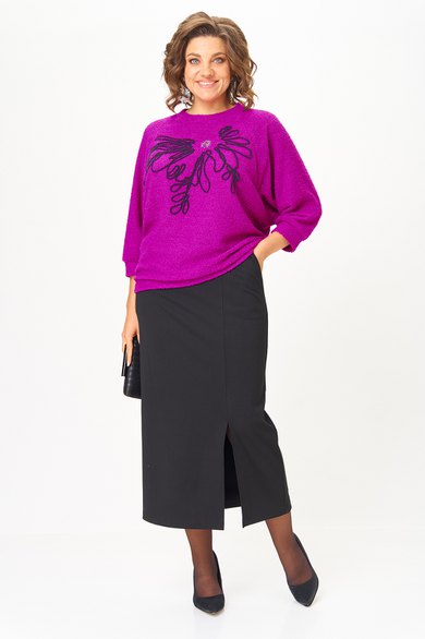 Универсальный и удобный женский юбочный комплект. Данный комплект отличный вариант как для повседневной носки, так и для торжеств. Изделие состоит из джемпера и длинной юбки. Джемпер свободного кроя выполнен из плотного трикотажа. По переду украшен вышивкой, благодаря чему изделие смотрится нарядно. Горловина круглая, рукав реглан летучая мышь. Низ и рукава на манжете из основной ткани. Прямая удлиненная юбка с декоративной молнией по переду. Изделие на притачном поясе с резинкой и двумя функциональными карманами в боковых швах. Благодаря своей универсальности этот комплект займет важное место в вашем осенне-зимнем гардеробе. Длина джемпера по спинке 65 см (±1 см), длина рукава от горловины 62 см. Длина юбки по боковому шву 92 см.