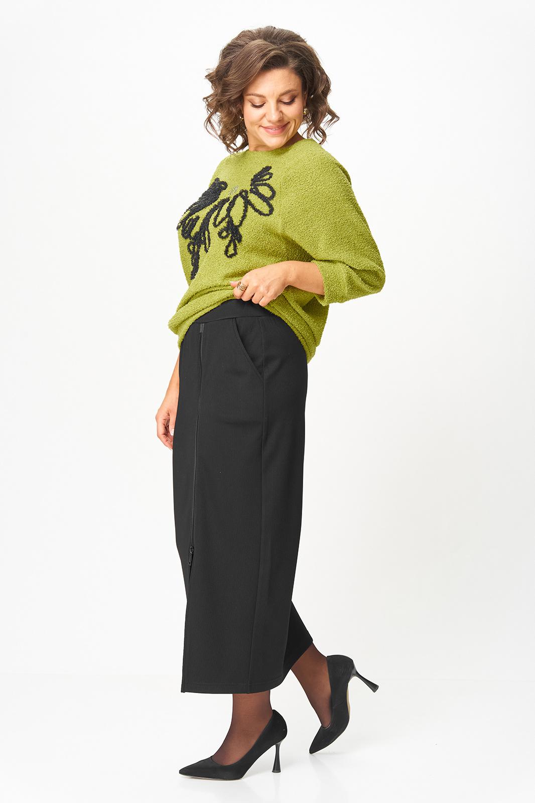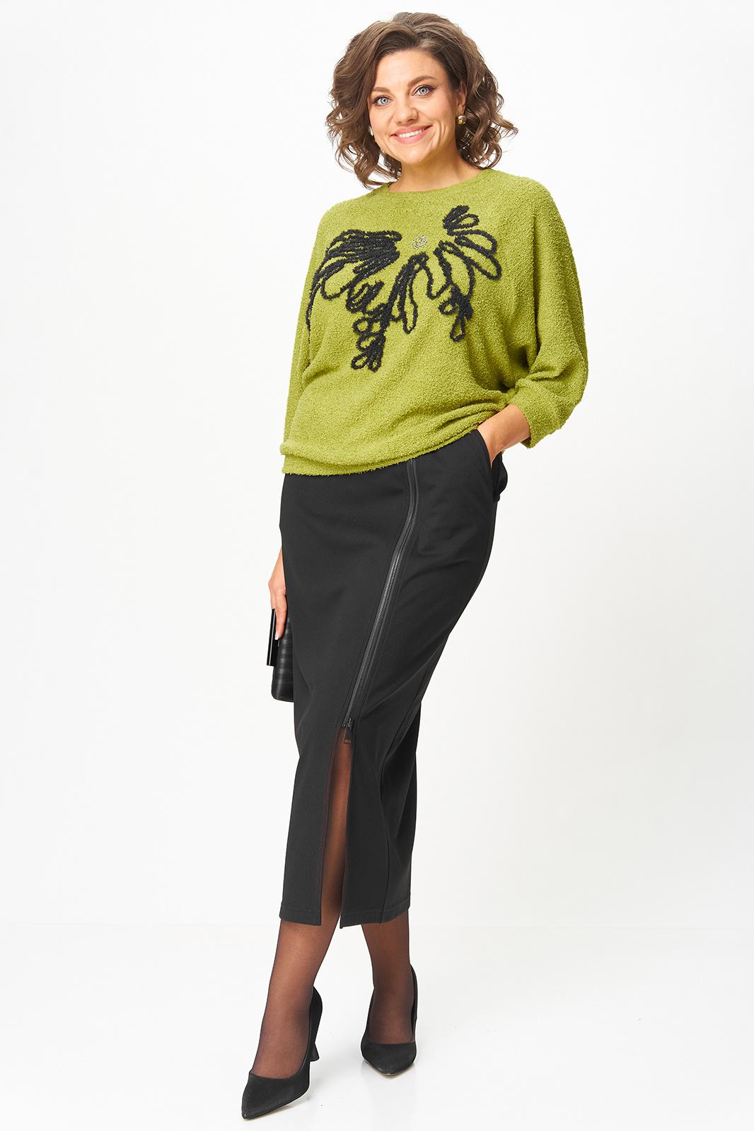 Универсальный и удобный женский юбочный комплект. Данный комплект отличный вариант как для повседневной носки, так и для торжеств. Изделие состоит из джемпера и длинной юбки. Джемпер свободного кроя выполнен из плотного трикотажа. По переду украшен вышивкой, благодаря чему изделие смотрится нарядно. Горловина круглая, рукав реглан летучая мышь. Низ и рукава на манжете из основной ткани. Прямая удлиненная юбка с декоративной молнией по переду. Изделие на притачном поясе с резинкой и двумя функциональными карманами в боковых швах. Благодаря своей универсальности этот комплект займет важное место в вашем осенне-зимнем гардеробе. Длина джемпера по спинке 65 см (±1 см), длина рукава от горловины 62 см. Длина юбки по боковому шву 92 см.