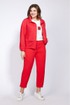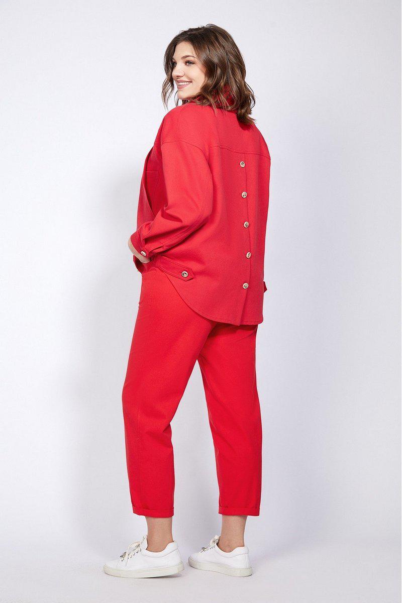 Комплект женский, состоящий из джинсовки, футболки и брюк. Джинсовка свободного силуэта, со спущенным рукавом, на манжете-с застёжкой на петлю-пуговицу. По переду накладные фигурные карманы. По спинке кокетка и декоративная застёжка с пуговицами. Джинсовка с застёжкой на петли-пуговицы, с фигурным низом, по переду-на резинке. Футболка свободного силуэта, рукав короткий, втачной, с манжетой. Округлый вырез горловины. Брюки-бананы, по переду карманы хулиганы, сзади на кокетке. Пояс на резинке. По переду застёжка на тесьму-молнию и пуговицу. Длина по спинке джинсовки-70см, длина рукава от горловины-69см. Длина по спинке футболки-61см, длина рукава-24см. Длина брюк-98см.