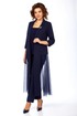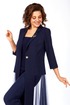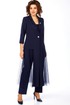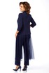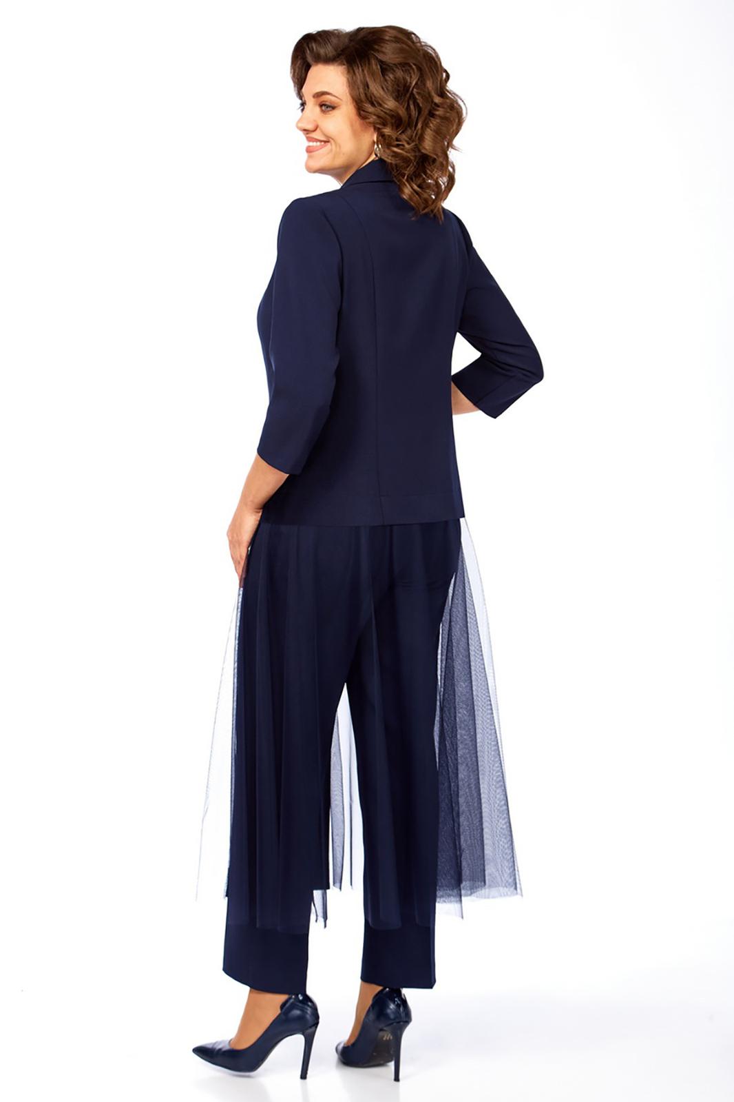 Комплект женский, состоящий из топа, накидки-жакета и брюк. Накидка – жакет полуприлегающего силуэта, без подкладки, с воротником пиджачного типа. По переду и спинке - рельеф от плеча. Рукав втачной, из основной ткани. Нижняя часть из отделочной ткани, полусолнце. Спереди застёжка на пуговицу.