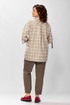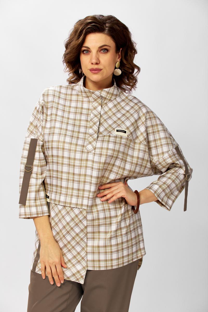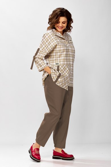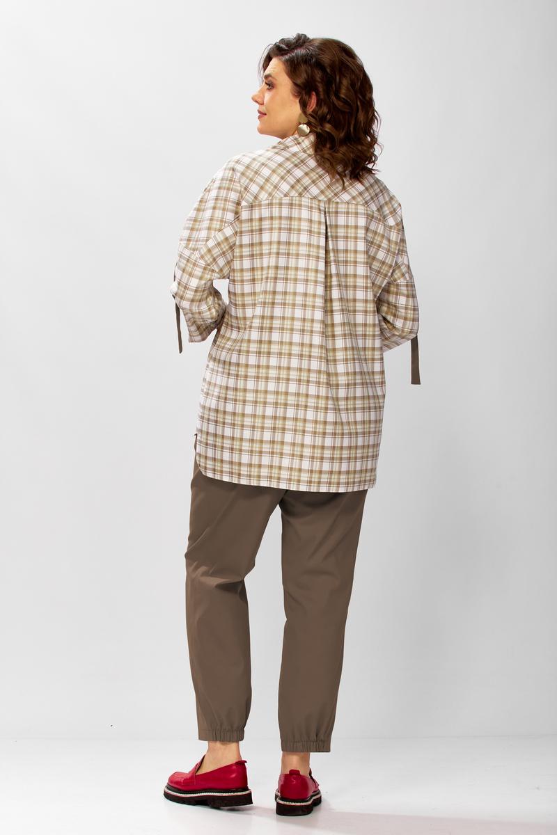 Комплект состоящий из рубашки и брюк. Рубашка свободного силуэта, воротник - стойка, рукав спущенный, с декоративными патами. Низ рубашки ассиметричный. По спинке - кокетка со складкой. Брюки-бананы, без застежки, пояс притачной на резинке по талии, в задней половинке брюк низ на резинке, в боковых швах - карманы.