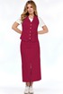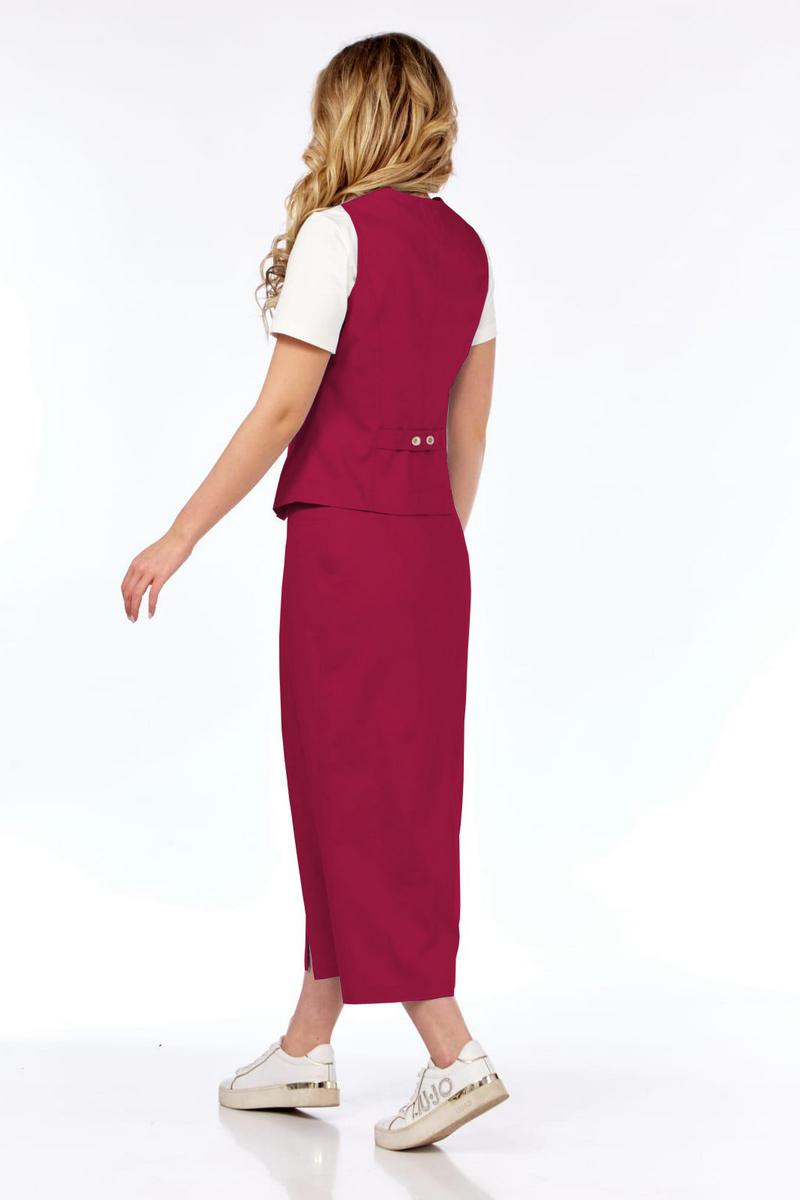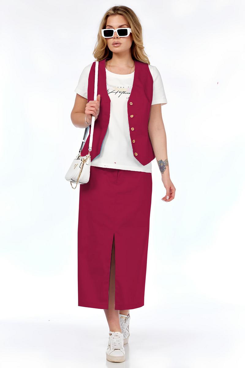 Комплект женский, состоящий из жилета, футболки и юбки. Жилет приталенного силуэта, без рукава, по переду с застёжкой на пуговицы, отделан двойными строчками. В области талии на спинке - декоративный хлястик. Футболка свободного силуэта. Округлый вырез горловины, рукав втачной, короткий. По переду декоративная печать. Юбка длинная с фиксированным поясом, застёжка на пуговицу с молнией. Имитация карманов. По переду разрез для удобства при ходьбе.