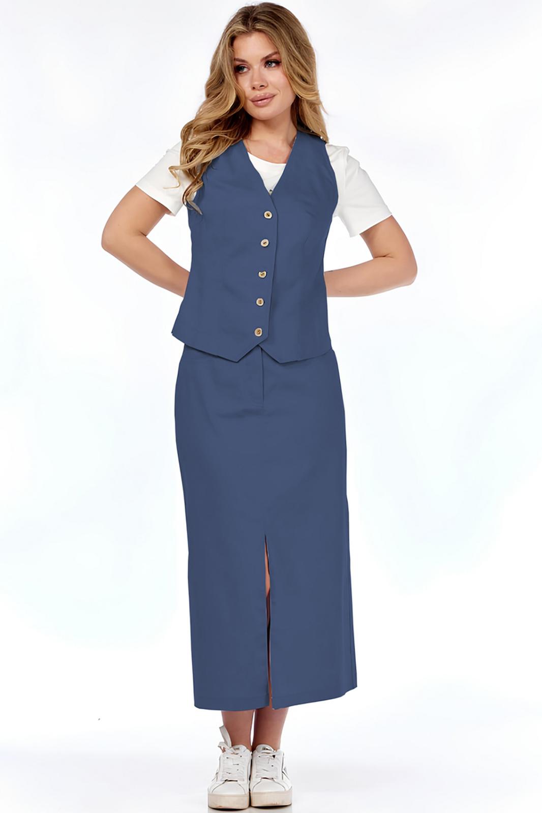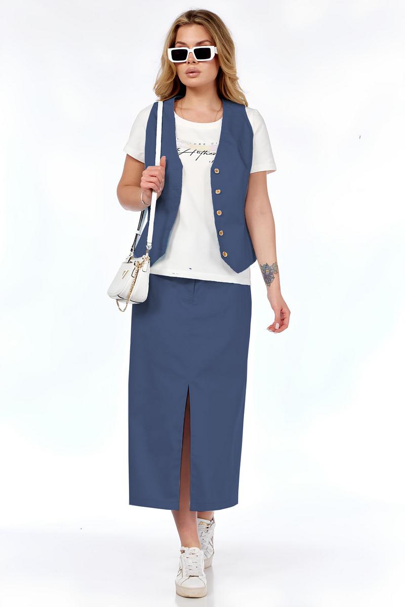 Комплект женский, состоящий из жилета, футболки и юбки. Жилет приталенного силуэта, без рукава, по переду с застёжкой на пуговицы, отделан двойными строчками. В области талии на спинке - декоративный хлястик. Футболка свободного силуэта. Округлый вырез горловины, рукав втачной, короткий. По переду декоративная печать. Юбка длинная с фиксированным поясом, застёжка на пуговицу с молнией. Имитация карманов. По переду разрез для удобства при ходьбе.
