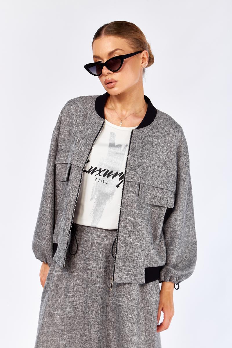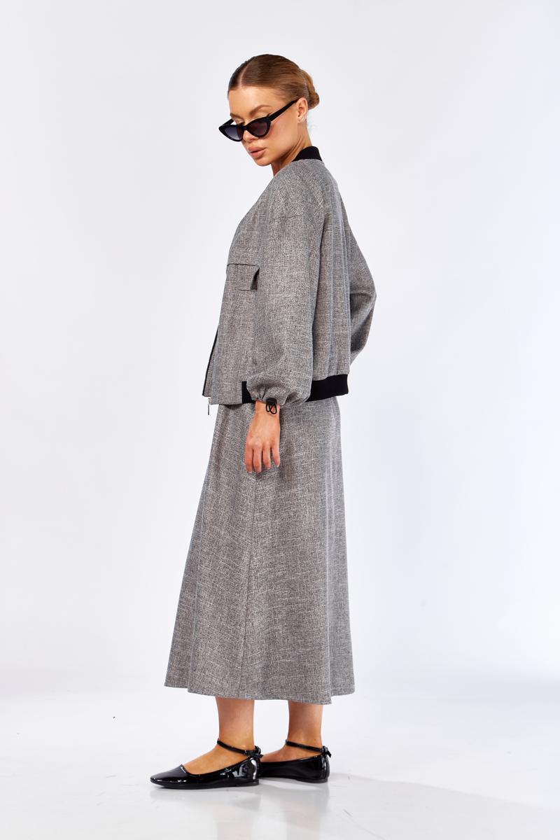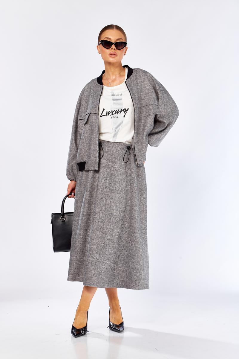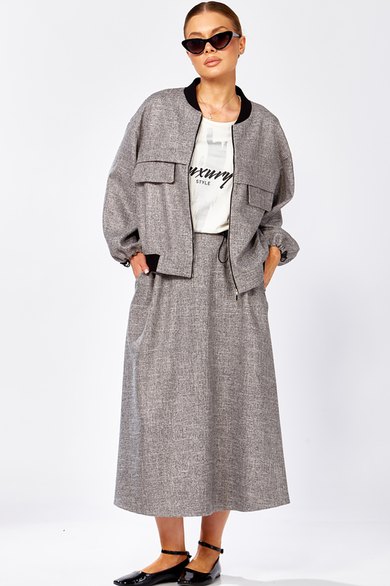 Комплект женский состоящий из 3-х предметов: бомбер, юбка и майка. Бомбер с застежкой на тесьму-молнию. Горловина и низ изделия обработаны трикотажной резинкой (кашкорсе). По переду декоративные подрезы с декоративными клапанами. Плечо спущенное, низ рукава стягивается на декоративную резинку с фиксаторами и карманами в боковых швах. Юбка А-образного силуэта, имеет боковые карманы в швах. Пояс на резинке, с добавлением декоративной резинки с фиксаторами. Майка полуприлегающего силуэта с нагрудными выточками. Горловина и проймы оформлены бейкой. На полочке имеется декоративная печать.