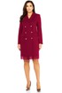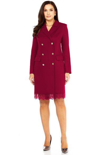 Двубортный жакет-платье, полуприлегающего силуэта, из костюмной ткани, без подкладки. Воротник-с отложными лацканами пиджачного типа, рукава – двухшовные. По переду – вытачки, прорезные карманы с клапанами и двумя листочками. Жакет имеет 6 пуговиц и одну потайную. По низу изделия и в шве рукава используется кружево, для придания романтизма классическому образу.