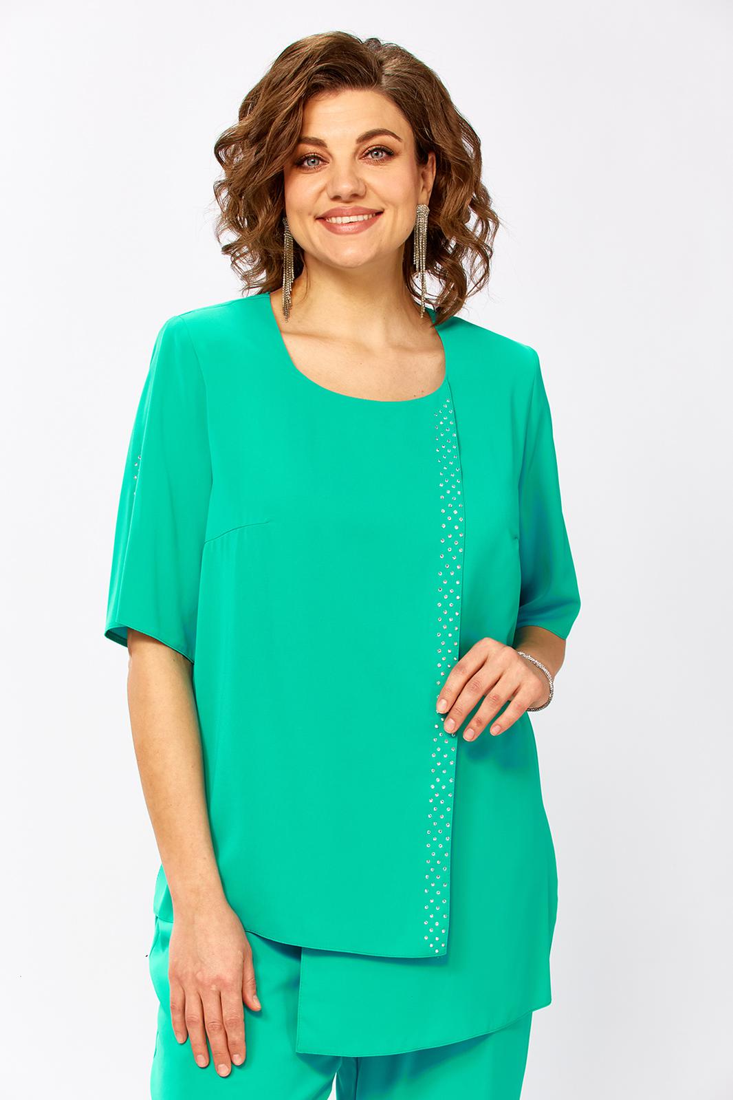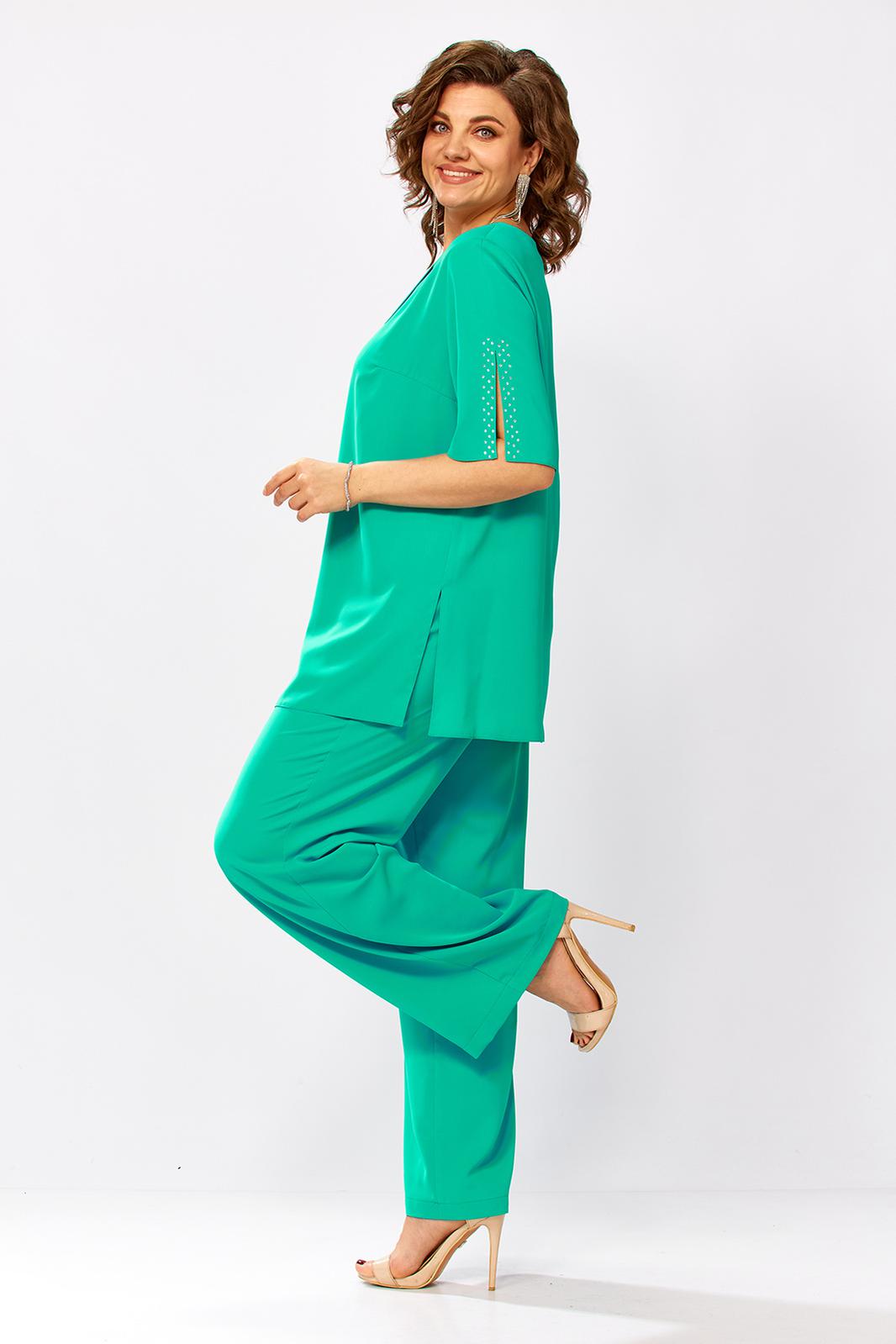 Вечерний брючный костюм больших размеров, состоящий из свободной блузки и классических брюк. Этот брючный, вечерний костюм подходит для женщин, которые ищут удобную и стильную одежду для свадьбы, на юбилей, на выпускной, на торжество, на корпоратив. Выполнен из текстиля, блуза свободного покроя, горловина округлой форме обтачке. По переду выполнены вертикальные подрезы, один край декорирован стразами, вертикальные линии прекрасно вытягивает силуэт и делает фигуру изящнее. Рукав втачной, оптимальной длины. Брюки с высокой посадкой визуально стройнят фигуру и идеально подходят для полных женщин. Верхний срез обработан поясом на резинке. Яркость ткани добавляют наряду для женщин праздничный вид, а весенние оттенки создадут праздничное настроение. Благодаря свободному крою, он обеспечит комфорт и свободу движений.