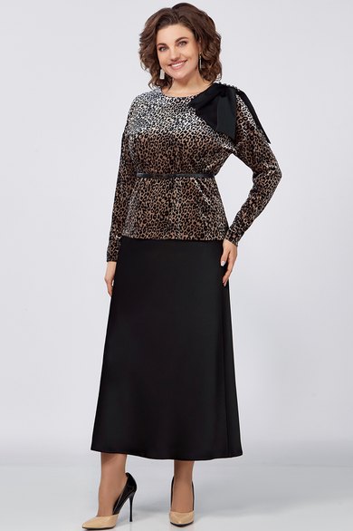 Женский комплект, состоит из блузы полу-прилегающего силуэта и юбки-годе. Блузка выполнена из велюра с принтом, горловина округлой формы, на обтачке. Спинка также из велюра с принтом, по линии талии застрочены складки. Рукав спущенный, зауженный к низу, оптимальной длины. В качестве декоративного элемента на плече блузы бант из атласа, украшен бусинами. Юбка выполнена из атласа, расклешенного силуэта, молнией в боковом шве, верхний срез на резинке. Эффектный и стильный комплект, сочетающий в себе разные фактуры ткани, отлично дополнит ваш образ! (ремень в комплект не входит!)