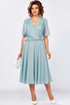 Женское платье полу-прилегающего силуэта, выполнено из шифона с блеском, на трикотажной подкладке. Лиф платья отрезное по линии талии, горловина V-образной формы. Правая часть полочки отлетная по линии талии, с перекрутом по левому боку, по линии плеча обработаны кокетки, декорированные стразами, от кокетки на полочке заложены складки. Юбка платья расклешенного силуэта, выполнена из основной ткани, на подкладке. Спинка отрезная по линии талии, со средним швом и вытачками, в среднем шве потайная молния. Рукав втачной, укороченный, из основной ткани. Эффектное платье с оригинальным конструктивным решением прекрасно скроет нюансы фигуры и подчеркнет талию.