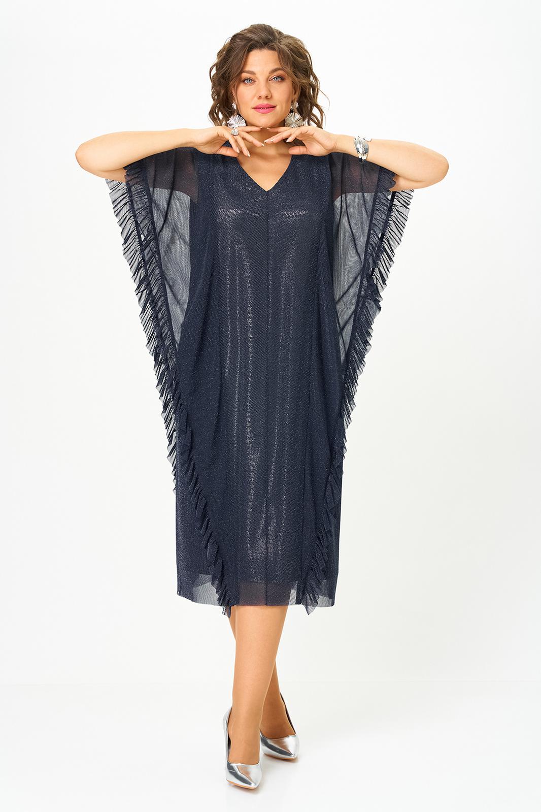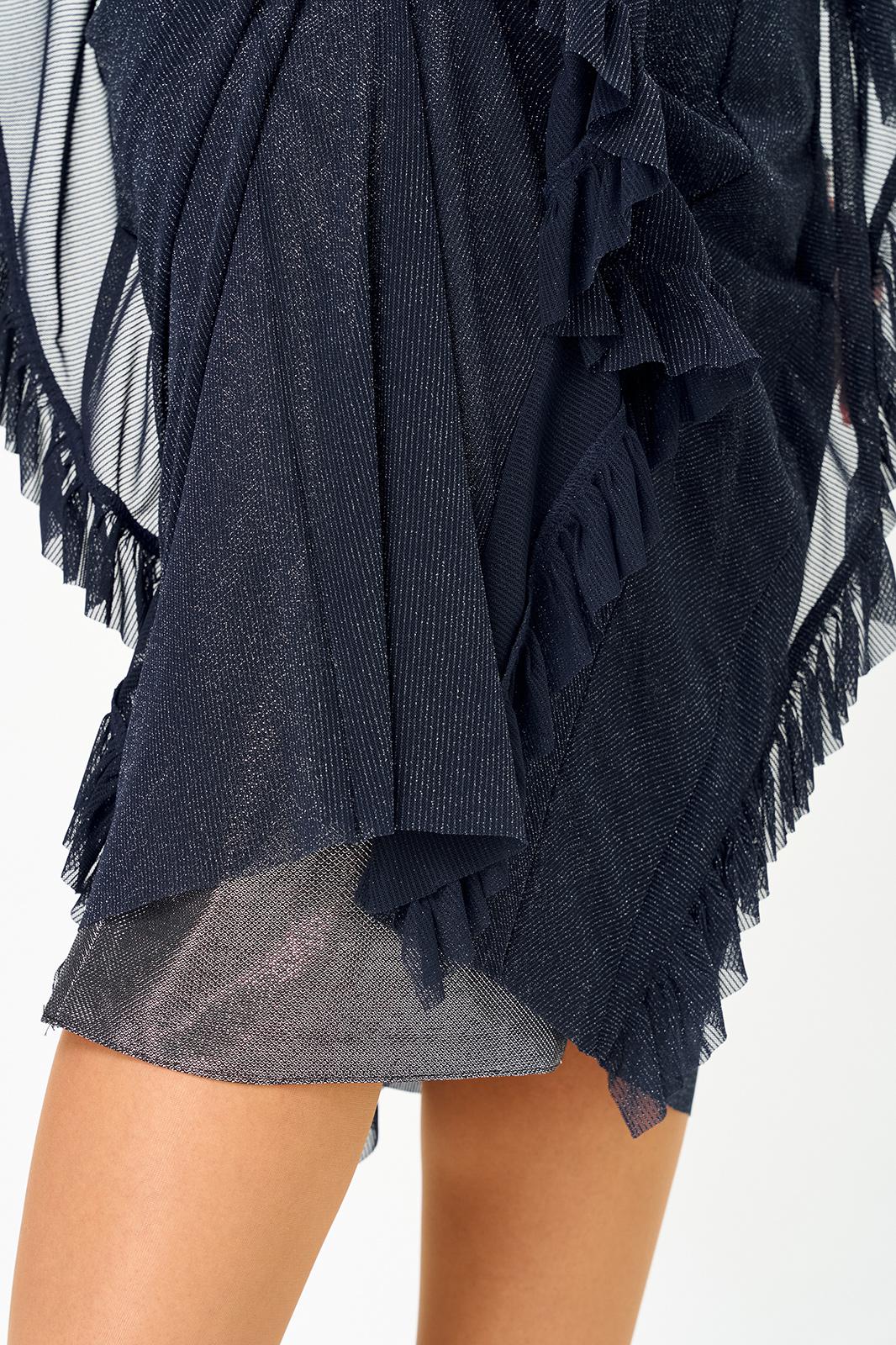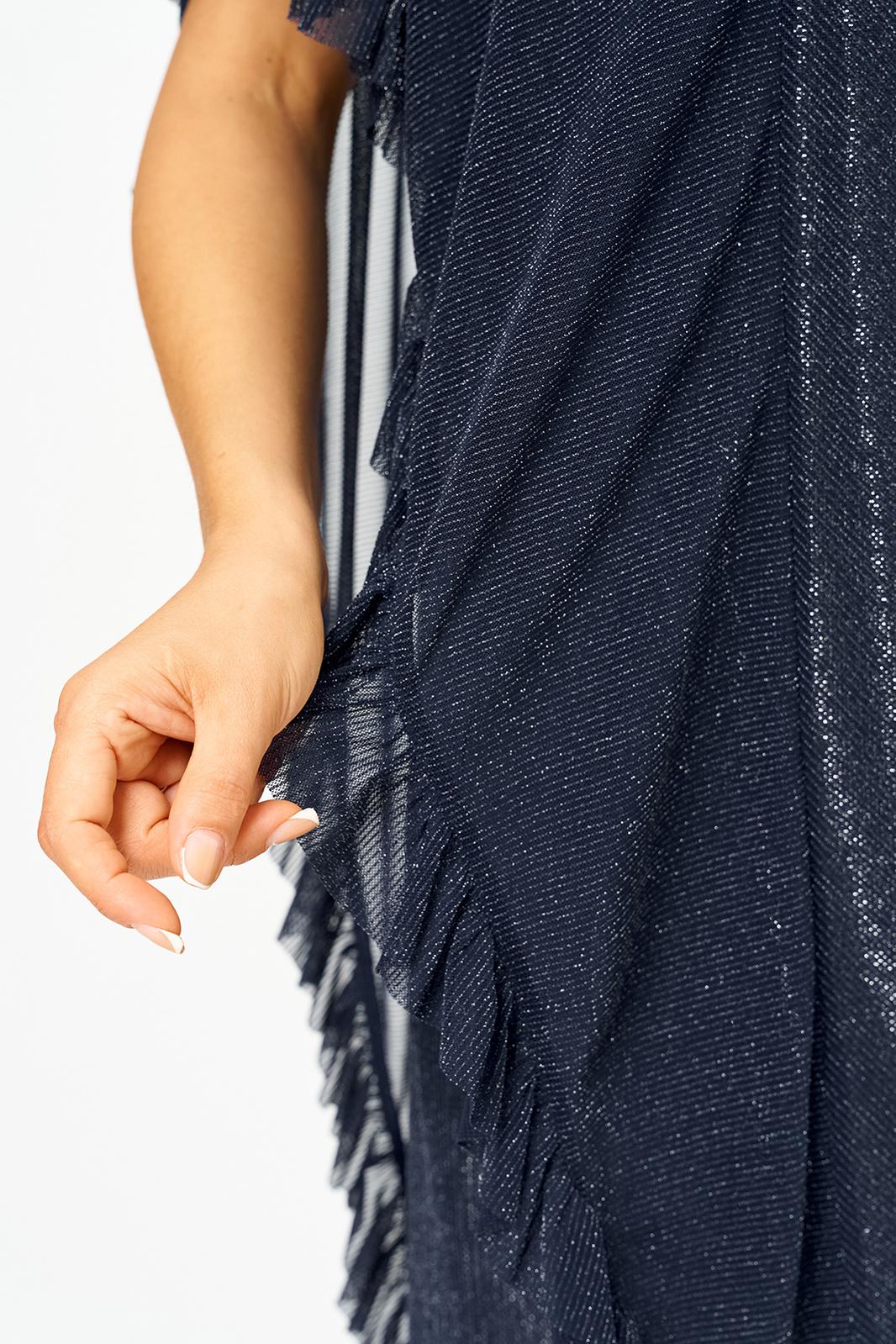 Женское платье полу-прилегающего силуэта, выполнено из сетки с люрексовой полоской с серебристой подкладкой. Горловина V-образной формы, обтачена, на полочке выполнен средний шов, также выполнены вертикальные подрезы, в них втачены отлетные детали с рюшей. Отлетные элементы по боковым подрезам прекрасно скрывают некоторые недостатки фигуры и визуально делают силуэт стройнее. Спинка идентична полочке, как и полочка, выполнена из сетки с люрексовой полоской, в качестве подкладки серебристый текстиль. Элегантное платье из эффектной ткани и оригинальным кроем отлично подчеркнёт достоинства фигуры и сделает ваш образ стильным.