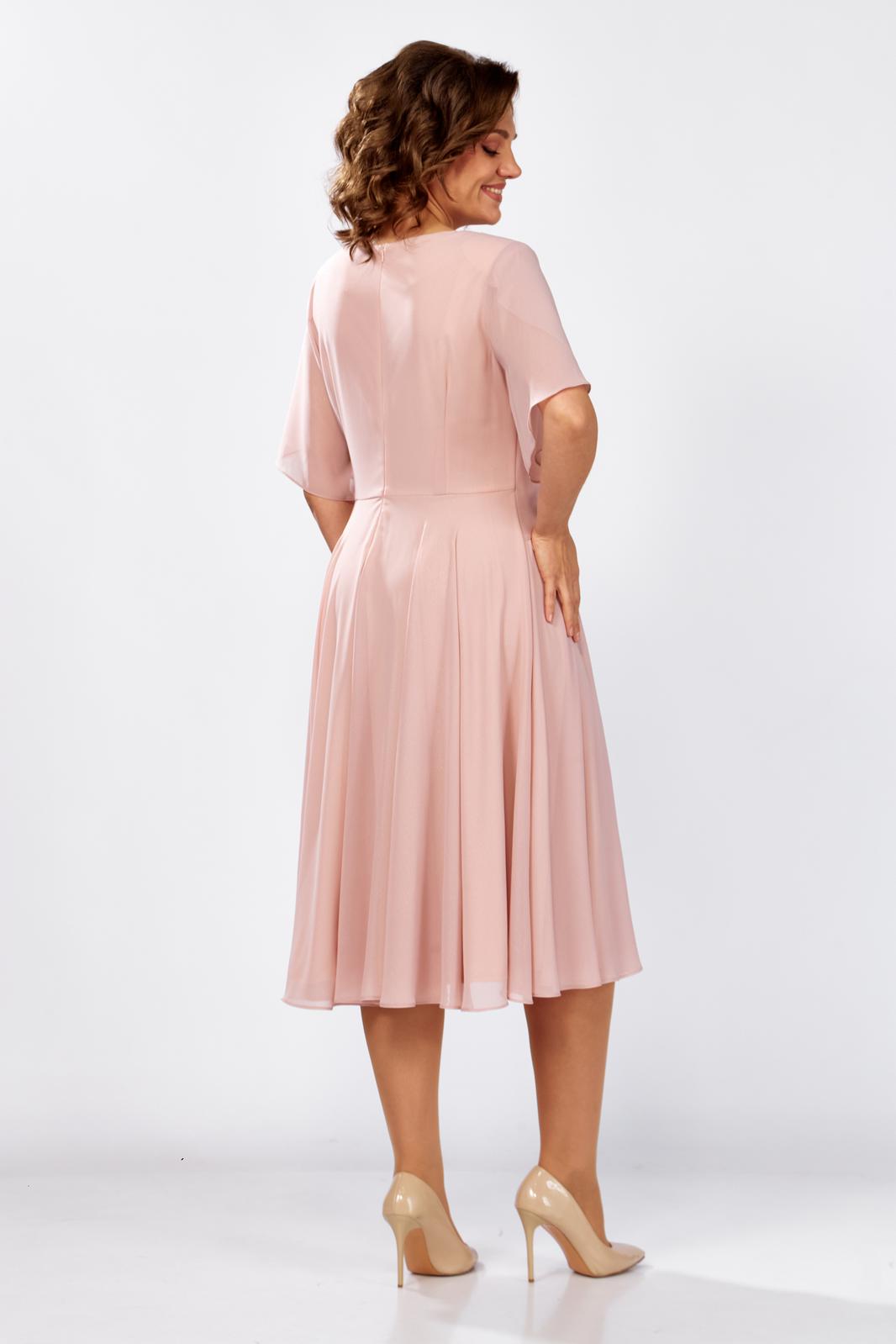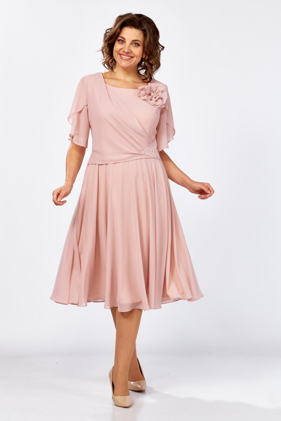 Женское платье полу-прилегающего силуэта, выполнено из шифона, на трикотажной подкладке. Лиф платья отрезной по линии талии, горловина округлой формы, на обтачке, также на лифе обработана ассиметричная, отлетная деталь со складками с одной стороны, которая уходит в боковой шов и декорирована стразами. Юбка расклешенная, выполнена из шифона, спинка со средним швом и рельефами, в среднем шве потайная молния. Рукав втачной, из шифона, расклешенный, укороченный. Нарядное платье из шифона, декорированное съемным цветком, отлично подойдет для торжественных мероприятий!