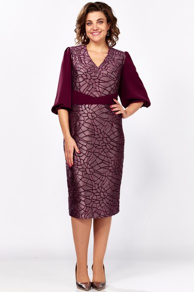 Нарядное женское платье, полуприлегающего силуэта, выполнено из ткани с вытравкой и тонкого текстиля. Горловина платья V-образной формы, на обтачке, по линии талии отрезное, с втачным поясом из тонкого текстиля, на поясе заложены складки. Юбка платья прямого силуэта, спинка выполнена из основной ткани. Рукав втачной, присборен по низу на резинку. Спинка выполнена из основной ткани, со средним швом и вытачками. Эффектное платье из нарядной ткани дополнит ваш образ!