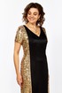 Платье полу-прилегающего силуэта, выполнено из трикотажного полотна «водолаз» и ткани в пайетки. Горловина платья V-образной формы, на обтачке, также на полочке выполнены отрезные бочки из пайеток, переходящие на спинку. Рукав втачной, выполнен из пайеток, оптимальной длины. Эффектное платье выполненное из стрейчевой ткани, отлично корректирует фигуру и дополнит ваш образ!