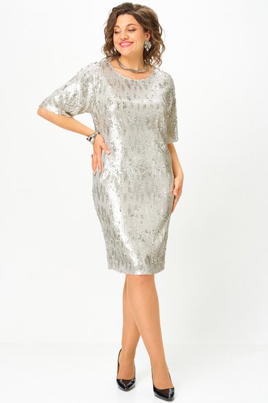 Нарядное платье из пайеток, свободного покроя. Горловина платья округлой формы на обтачке, полочка и спинка свободного покроя. Рукав втачной, укороченный, выполнен из пайеток. Простое в исполнении, но выполненное из эффектной ткани прекрасно дополнит ваш образ!