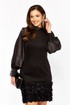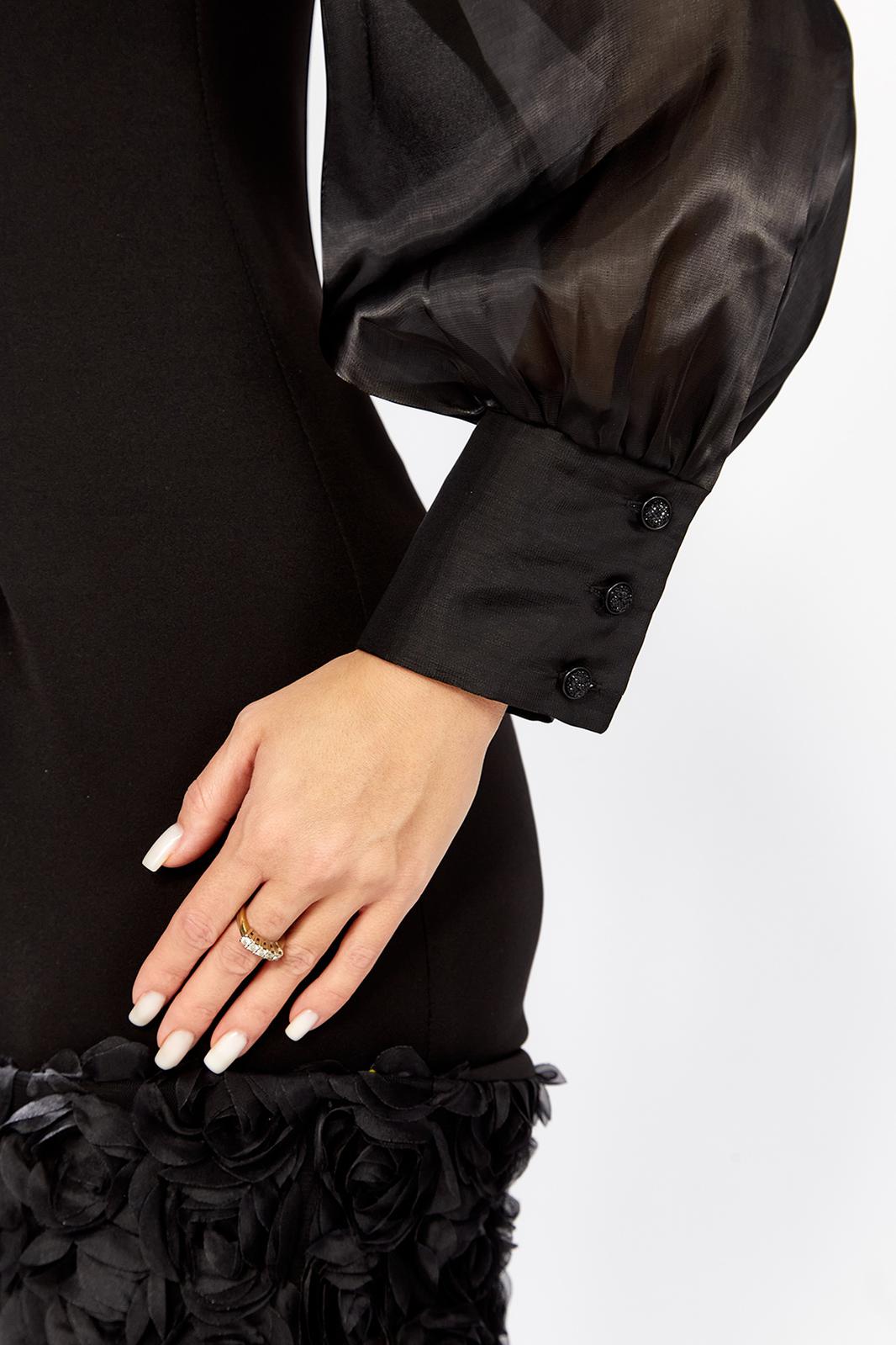 Эффектное женское платье полу-прилегающего силуэта, выполнено из трикотажного полотна и органзы. Лиф платья отрезной по линии талии, кокетка лифа выполнена из органзы, нижняя часть из трикотажного полотна, с рельефами. Юбка платья прямого покроя, выполнена из трикотажного полотна, по низу притачная планка из декоративной ткани с объемными розами. Спинка идентична полочке, со средним швом, по горловине обработана стойка из органзы, по спинке застегивается на петлю-пуговицу. Рукав на спущенной пройме, из органзы, по низу присборен на манжет с застежкой на петли-пуговицы. Стильное платье с эффектным декором отличный выбор для торжественных мероприятий!
