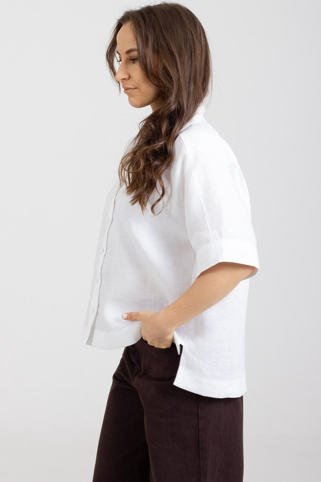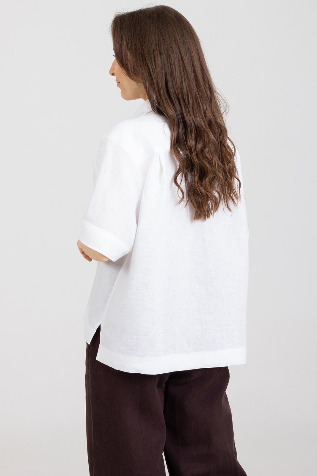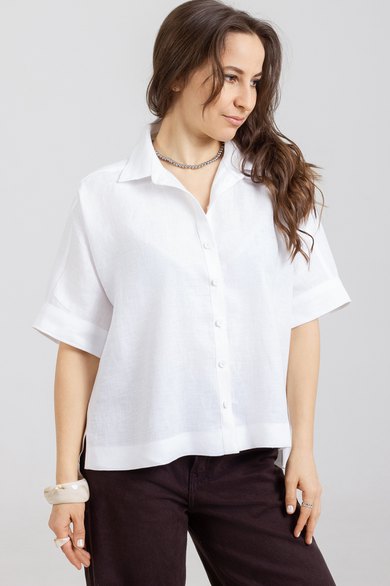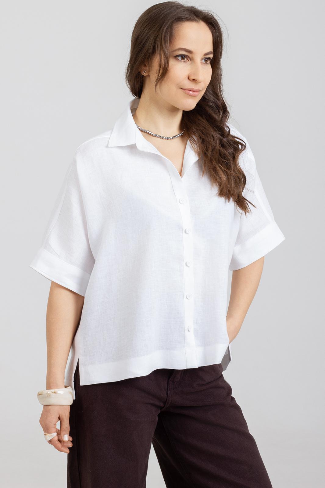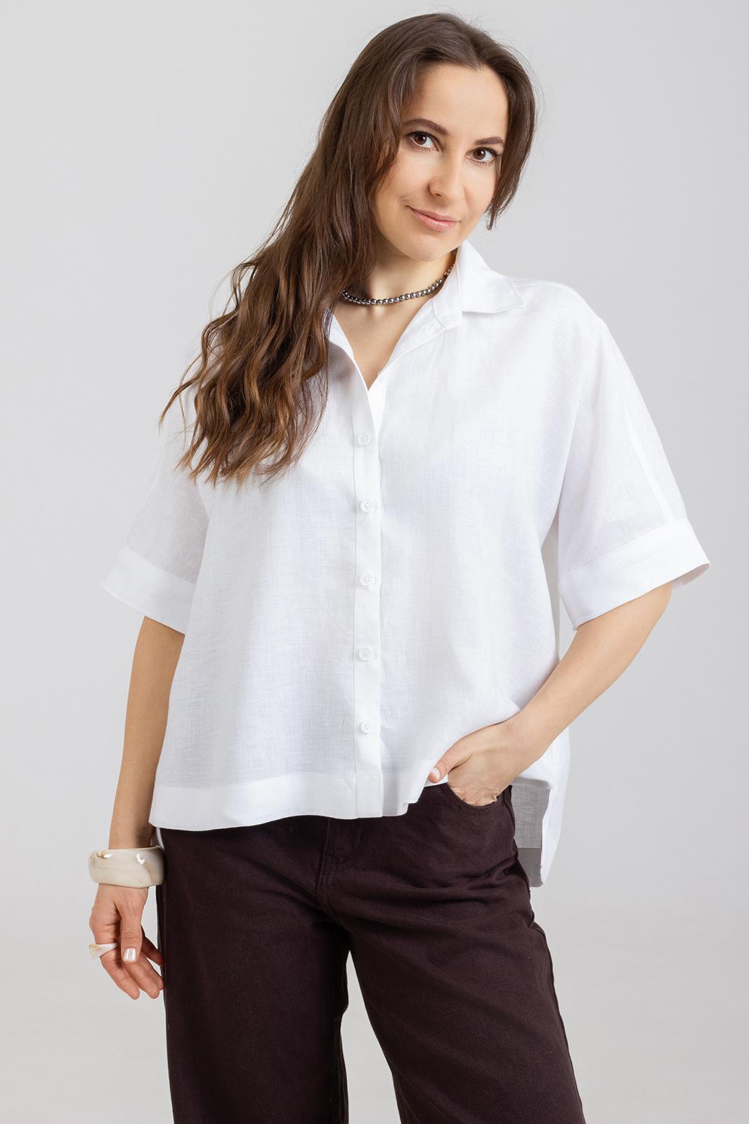 Рубашка прямого свободного кроя, выполнена из натурального мягкого льна с эффектом мятости.Воротник отложной, застёжка центральная на пуговицы, рукав спущенный свободный, с широкой манжетой . Длина рукава от края горловины 40 см. Длина от верхней точки плеча переда р-ры 44-50- 59 см, р-ры 52-54- 63см. спинки р-ры 44-50-64 см, р-ры 52-54- 68см