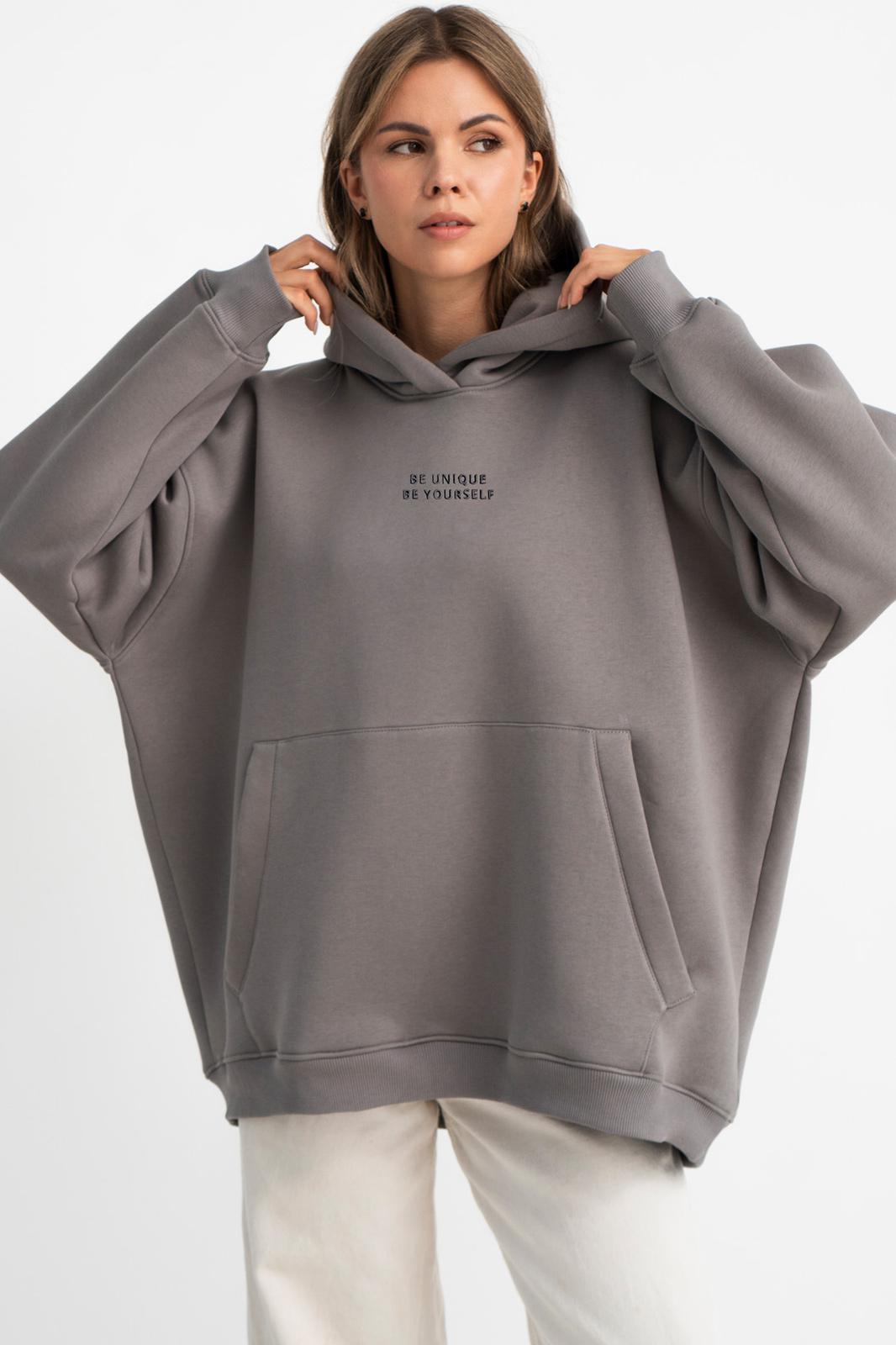 Утеплённый Худи изготовлен из качественного турецкого трикотажа. Ткань тёплая и приятная на ощупь , не пилингуется, с изнанки на флизе. Толстовка со спущенной линией плеча, свободного силуэта, с двойным капюшоном, по переду карман по типу “кенгуру”. Крой oversize позволяет чувствовать себя в нем очень комфортно и стильно! Вышивка спереди“Be unique Be yourself” (будь уникальным, будь самим собой) выделяет его среди других и выполнена с особой тщательностью. Мы примерили эту толстовку на самые разные фигуры: от 42 до 56, и она всегда выглядит великолепно.