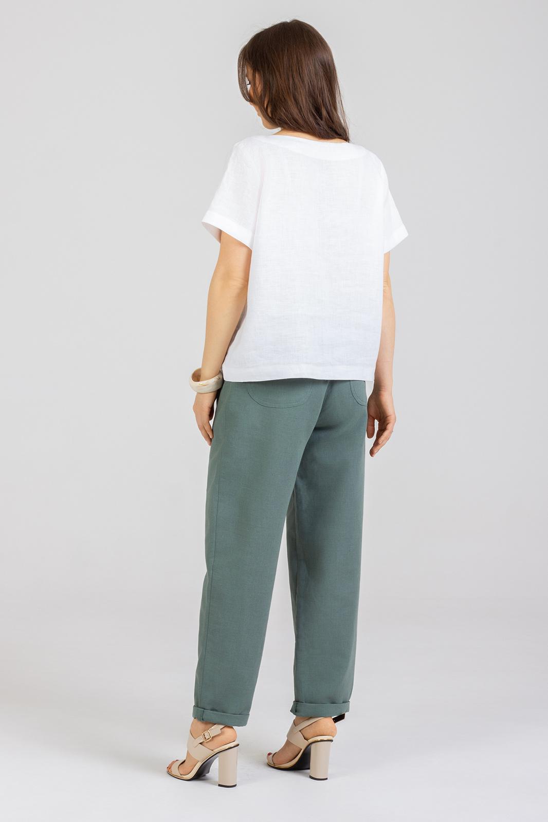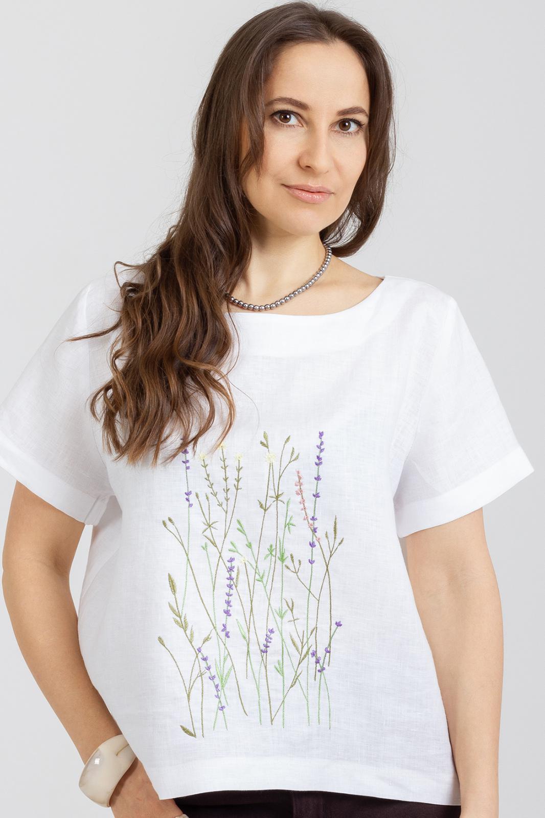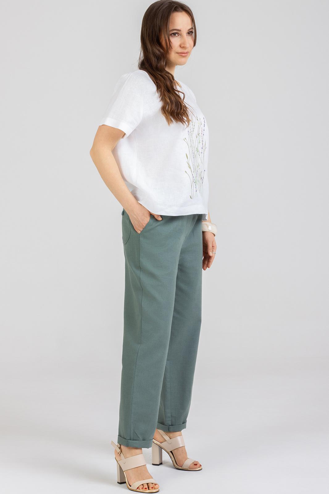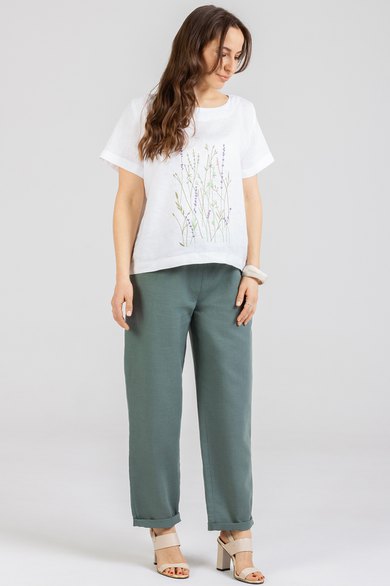 Комплект 2-ух предметный состоит из Блузки м 1277 и Брюк м 1155 . Летняя Блузка с вышивкой по переду из натурального мягкого льна с эффектом мятости свободного силуэта. Рукав втачной .