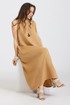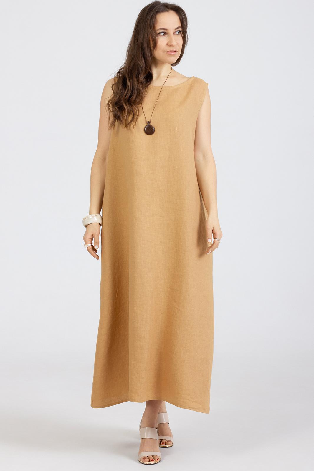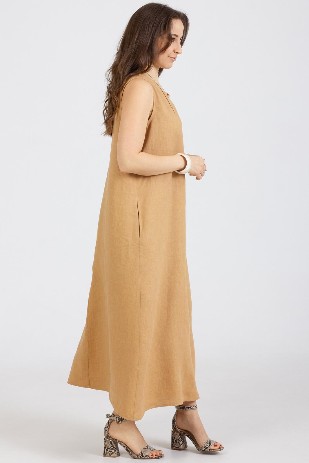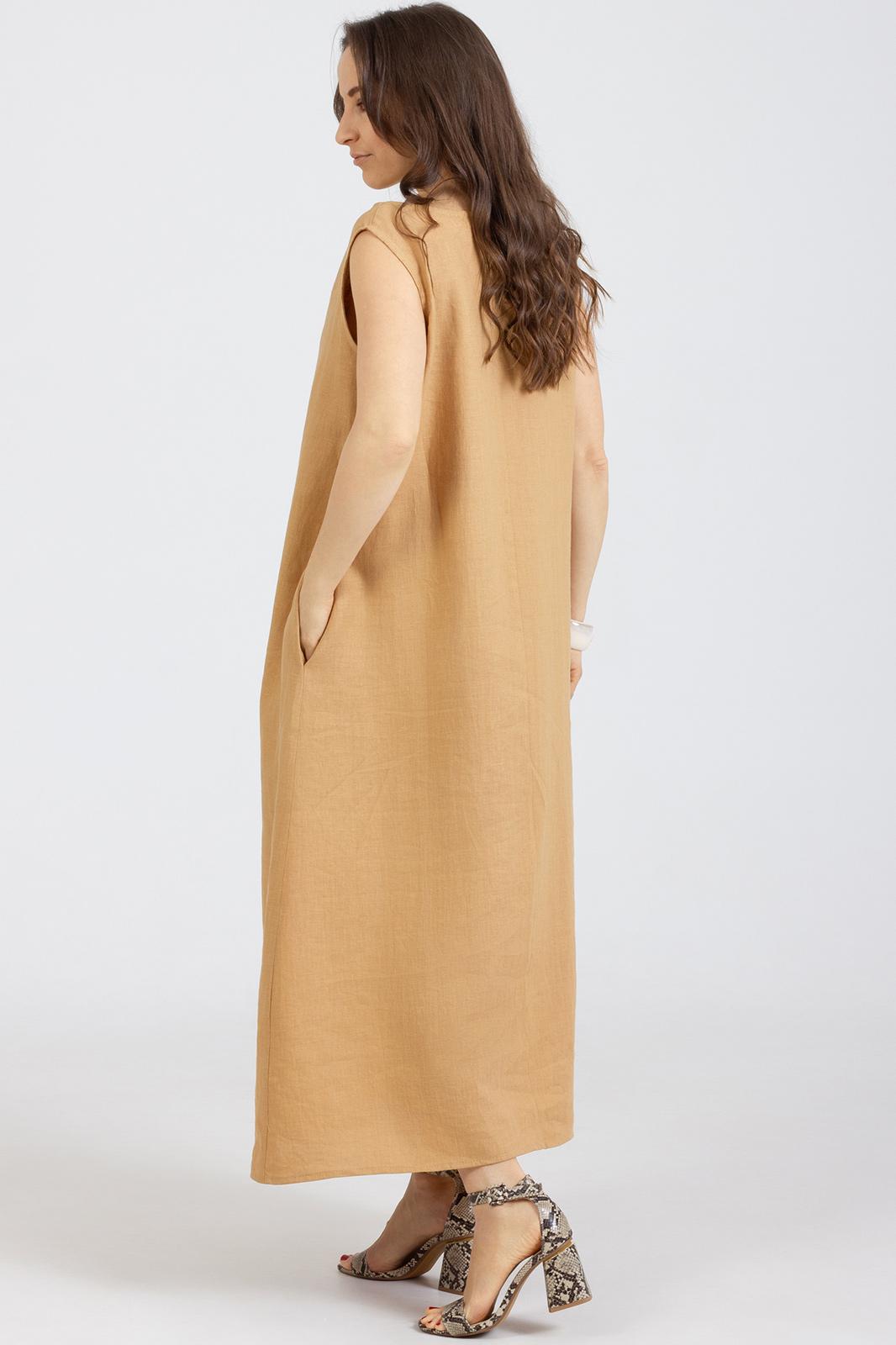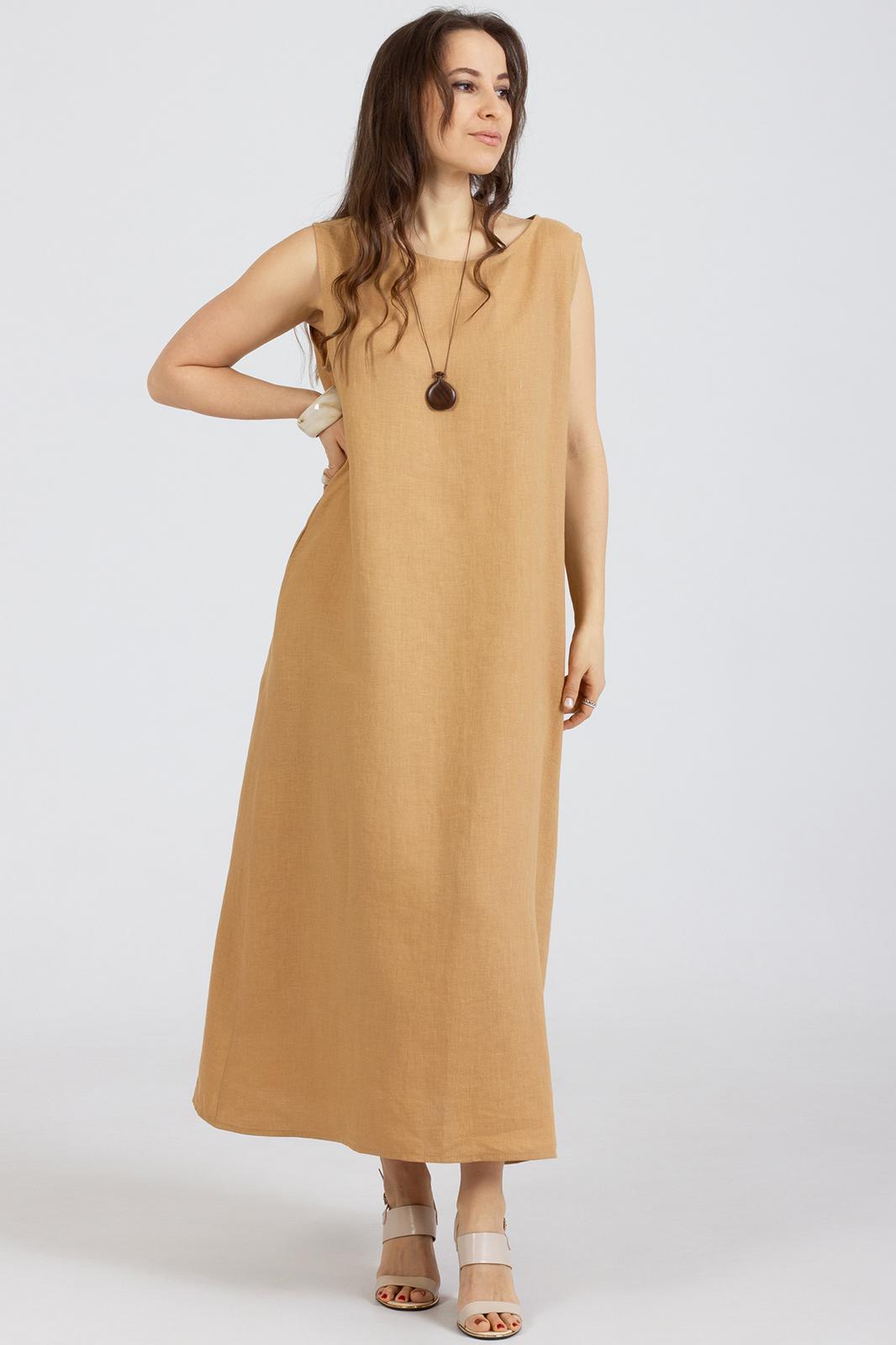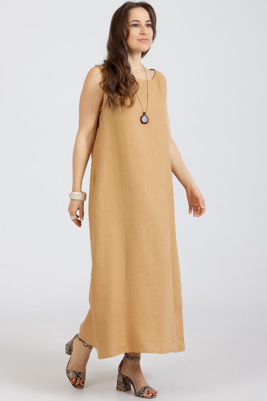 Платье прямого свободного кроя выполнено из натурального мягкого льна с эффектом мятости , без рукавов, вырез горловины круглый, горловина и проймы окантованы . В боковых швах карманы.