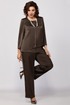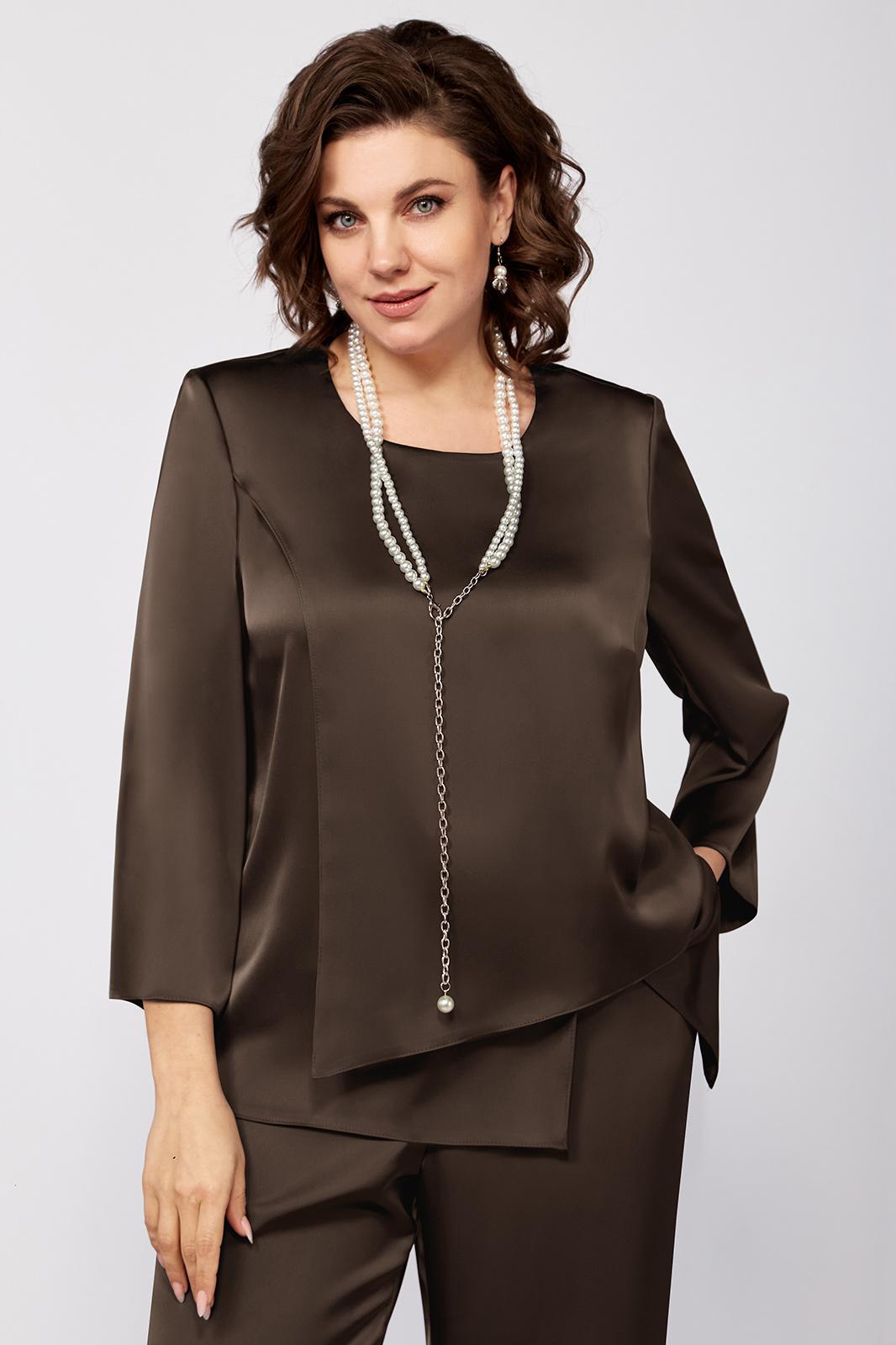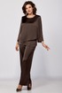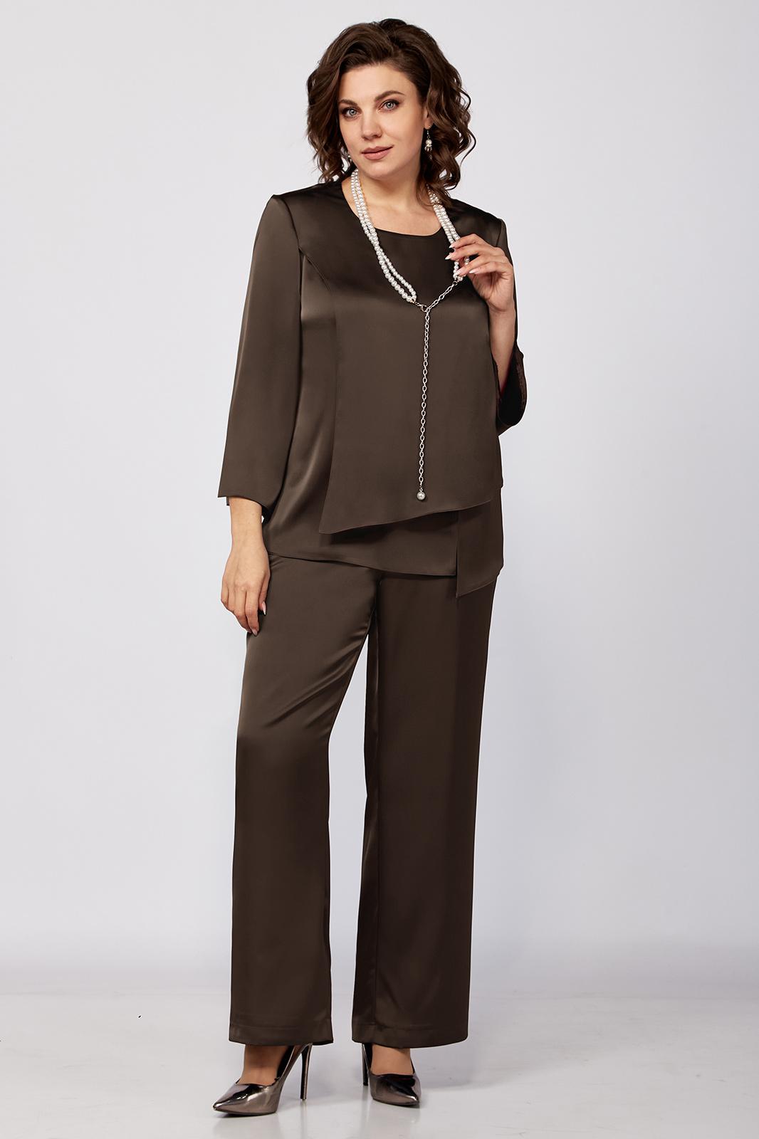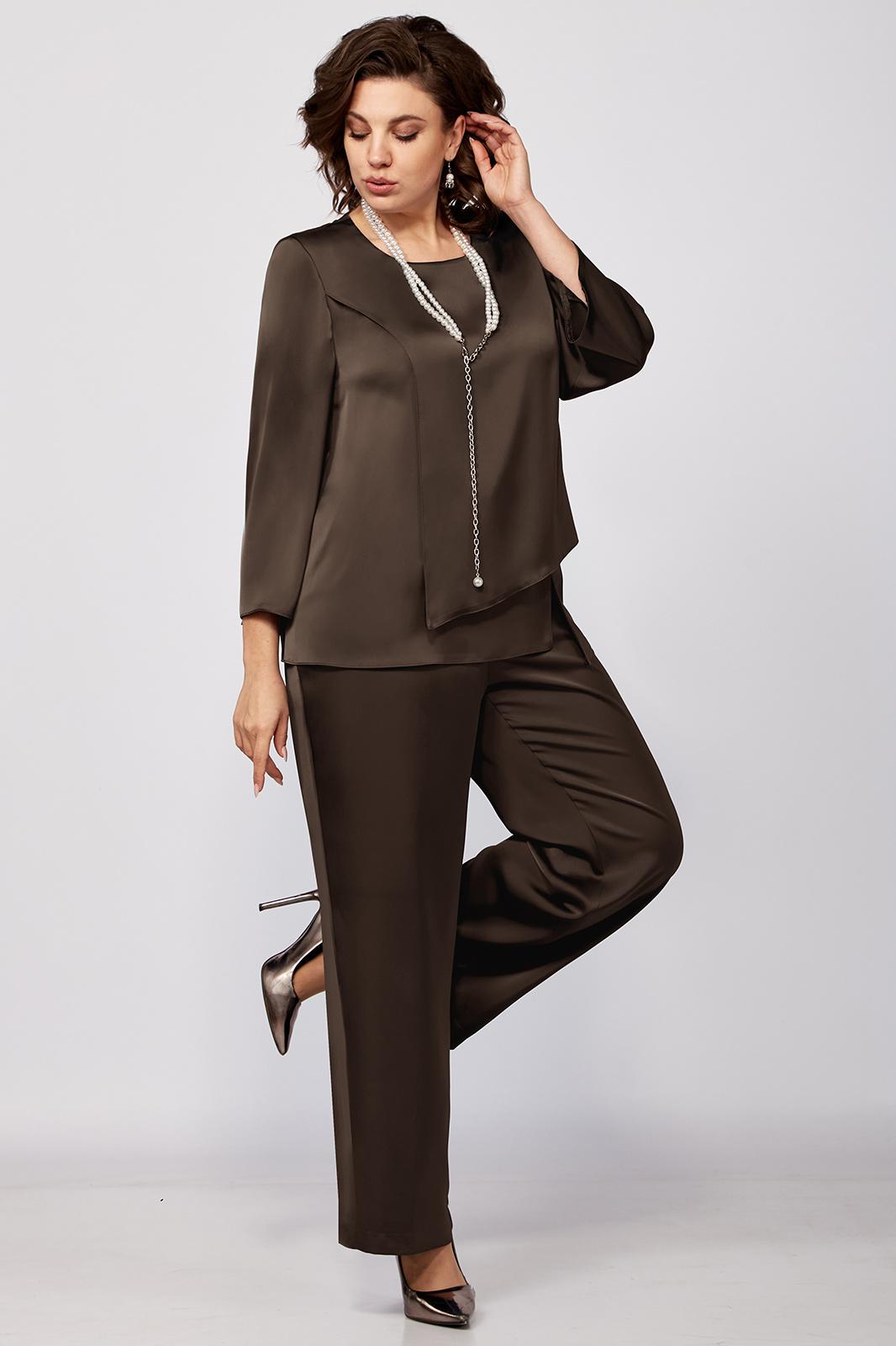 Элегантный женский комплект прямого силуэта из легкой струящейся ткани.Туника прямого силуэта. Перед состоит из нижней детали и с боковым подрезом и шлицей с левой стороны, нагрудные вытачки идут от плечевого среза . Верхняя деталь переда ассиметричной формы. Спинка со средним швом и застежкой на потайную тесьму-молнию. Округлый вырез горловины. Рукав втачной одношовный. Брюки прямого силуэта на притачном поясе, с посадкой на талии, с застежкой на тесьму- молнию и 1 пуговицу и петлю, с боковыми наклонными карманами на передних половинках брюк . По передним половинкам брюк заутюжены стрелки. Для лучшего прилегания брюк в области талии в поясе со стороны спинки вставлена резинка. Укарашение в комплект не входит.