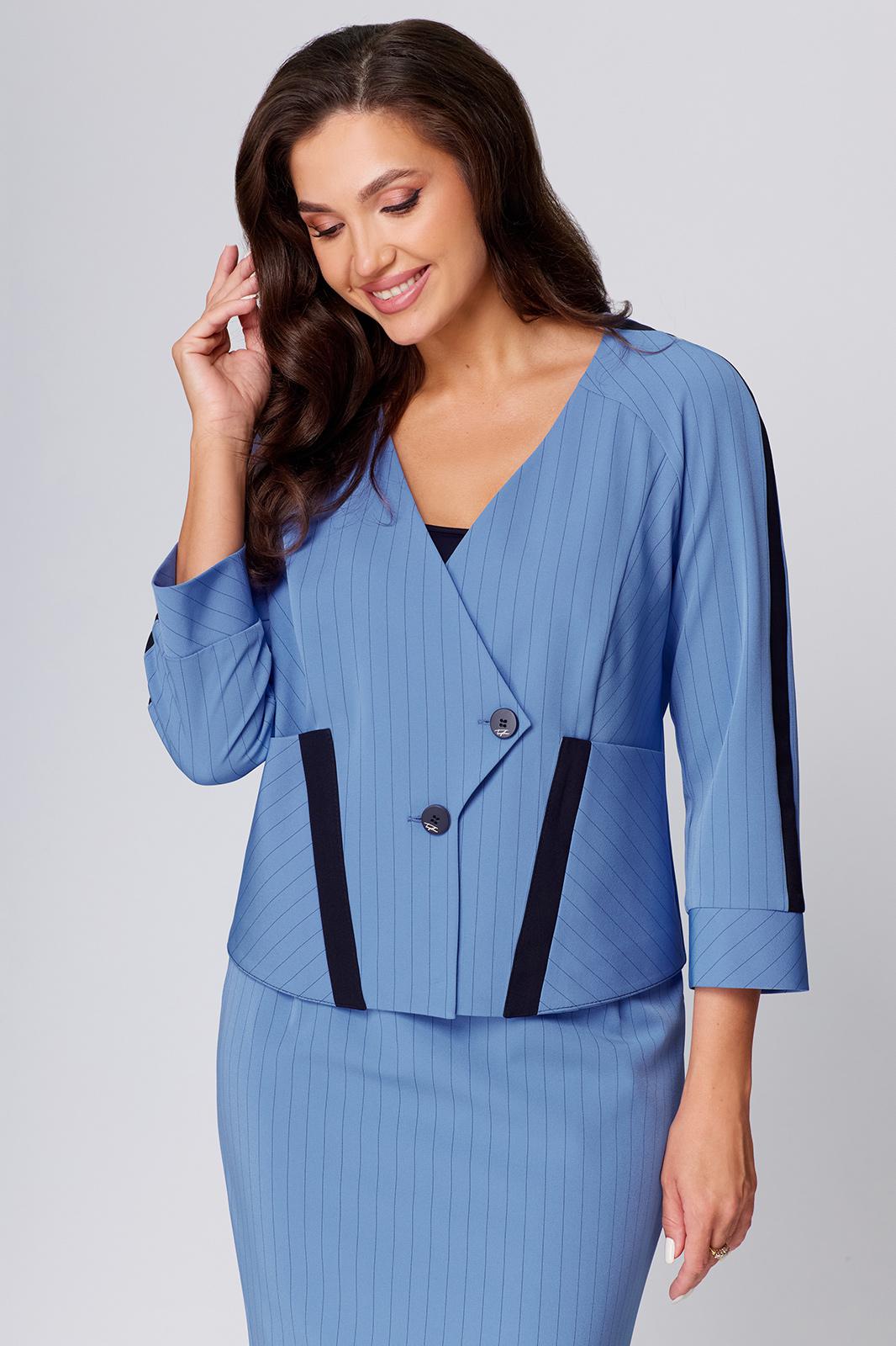 Комплект женский, двухпредметный, состоящий из жакета и юбки. Жакет полуприлегающего силуэта, рукав реглан с контрастной вставкой и манжетой. Горловина с V-ым вырезом и застежкой фигурной на две петли и пуговицы. Передняя часть с рельефом, накладными карманами с контрастной отделкой. Спинка со средним швом и талиевыми вытачками. Юбка прямого силуэта, с завышенной талией на обтачке, по заднему полотнищу разрез и потайная молния. Длина жакета по спинке 53см. Длина рукава от горловины 61см. Длина юбки по боковому шву с поясом 70см.