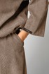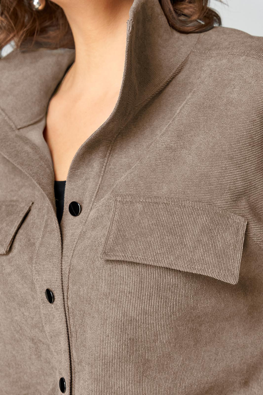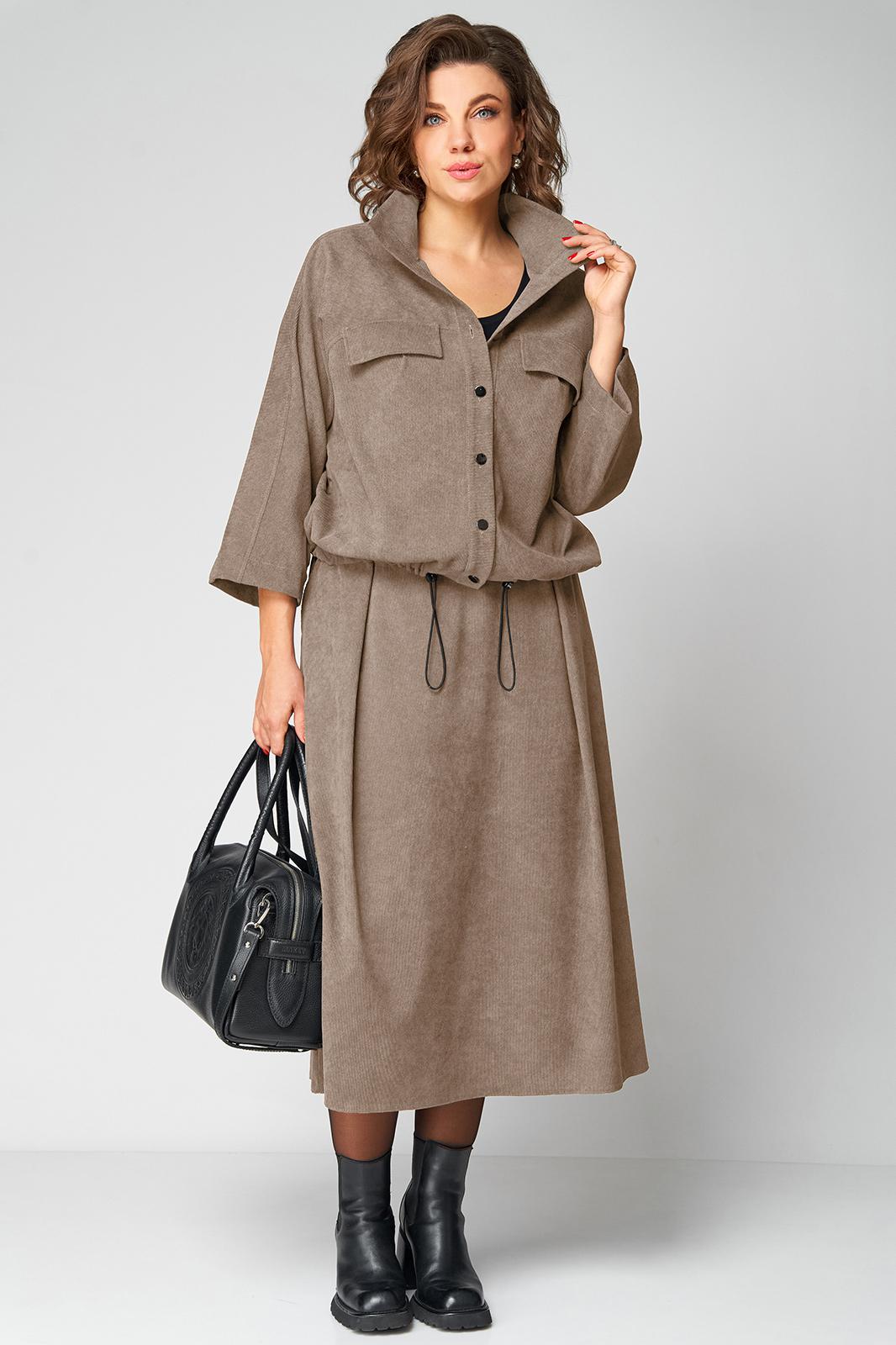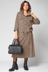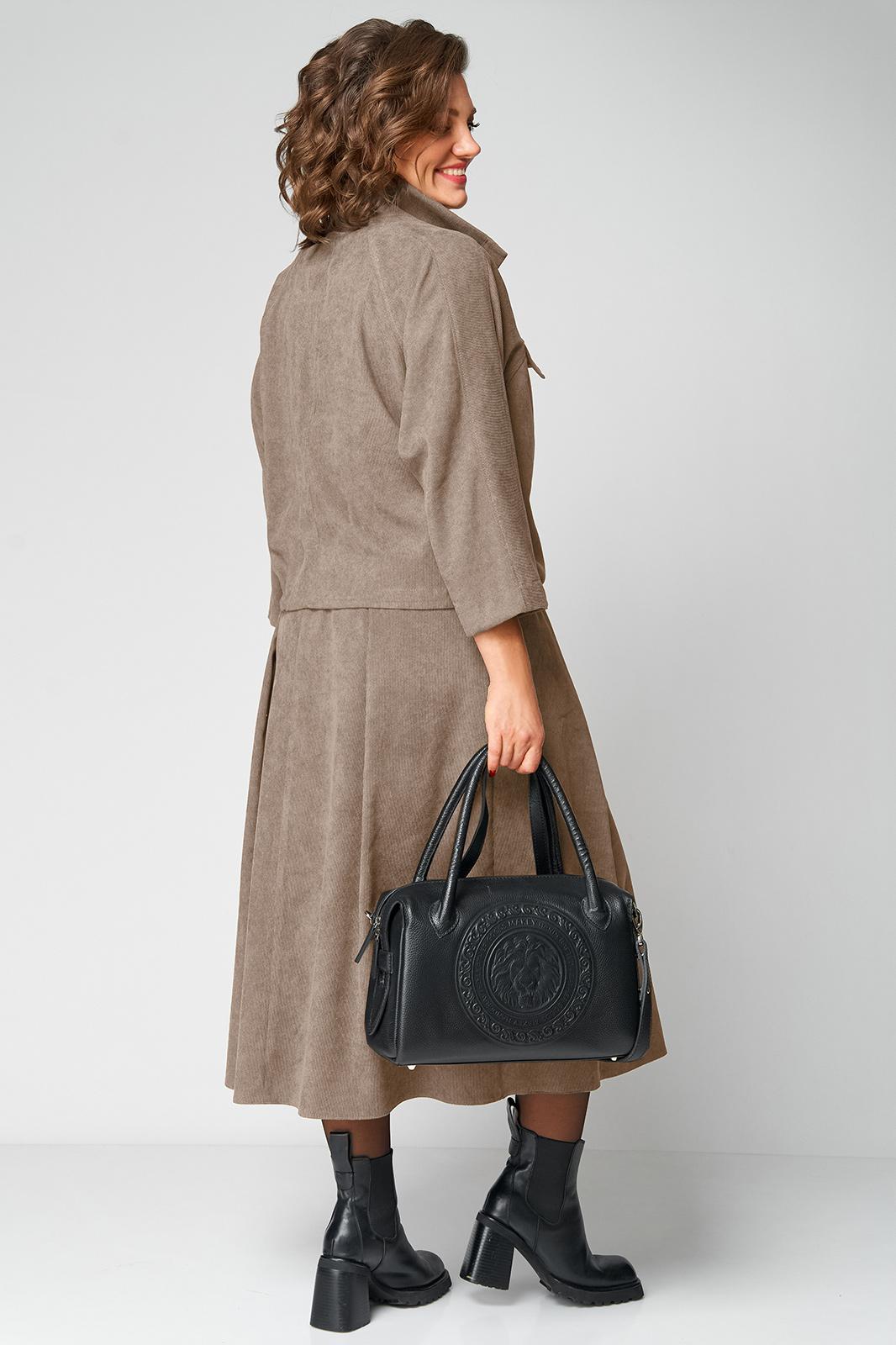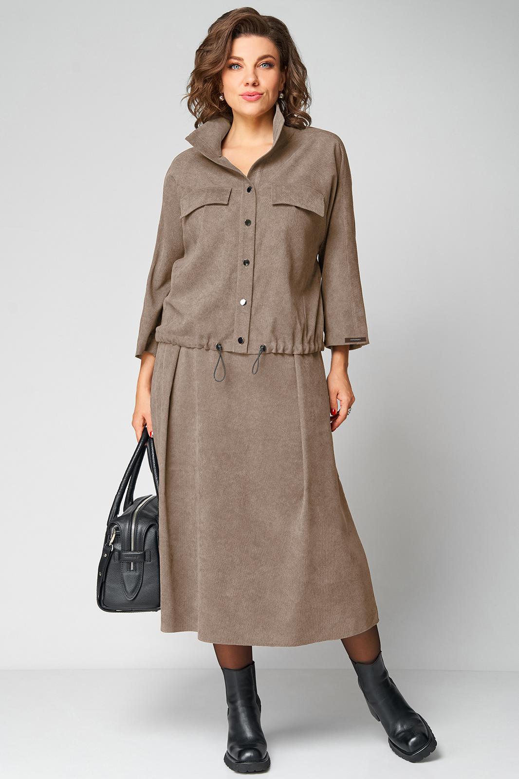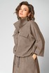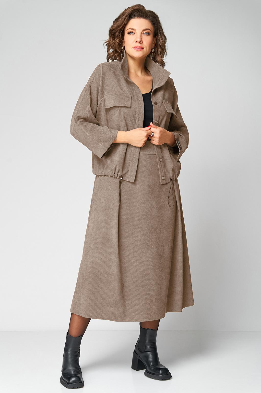 Комплект женский 2-ух предметный, состоящий из жакета и юбки. Жакет со спущенной линией плеча и цельнокроеным рукавом. По переду отрезная кокетка, воротник- стойка, рукава и планки. По переду настрочены нагрудные клапаны. Синка со средним швом. На левом рукаве о низу настрочена нашивка. Центральная застежка по планкам на 5 пуговиц и петель. Низ жакета можно регулировать с помощью эластичного шнура и фиксатора. Жакет без подкалки. Юбка на широкой обтачке А- силуэта, на подкладке. По переднему и заднему полотнищу заложены складки. По бокам расположены наклонные карманы. Застежка сзади на потайную тесьму-молнию.