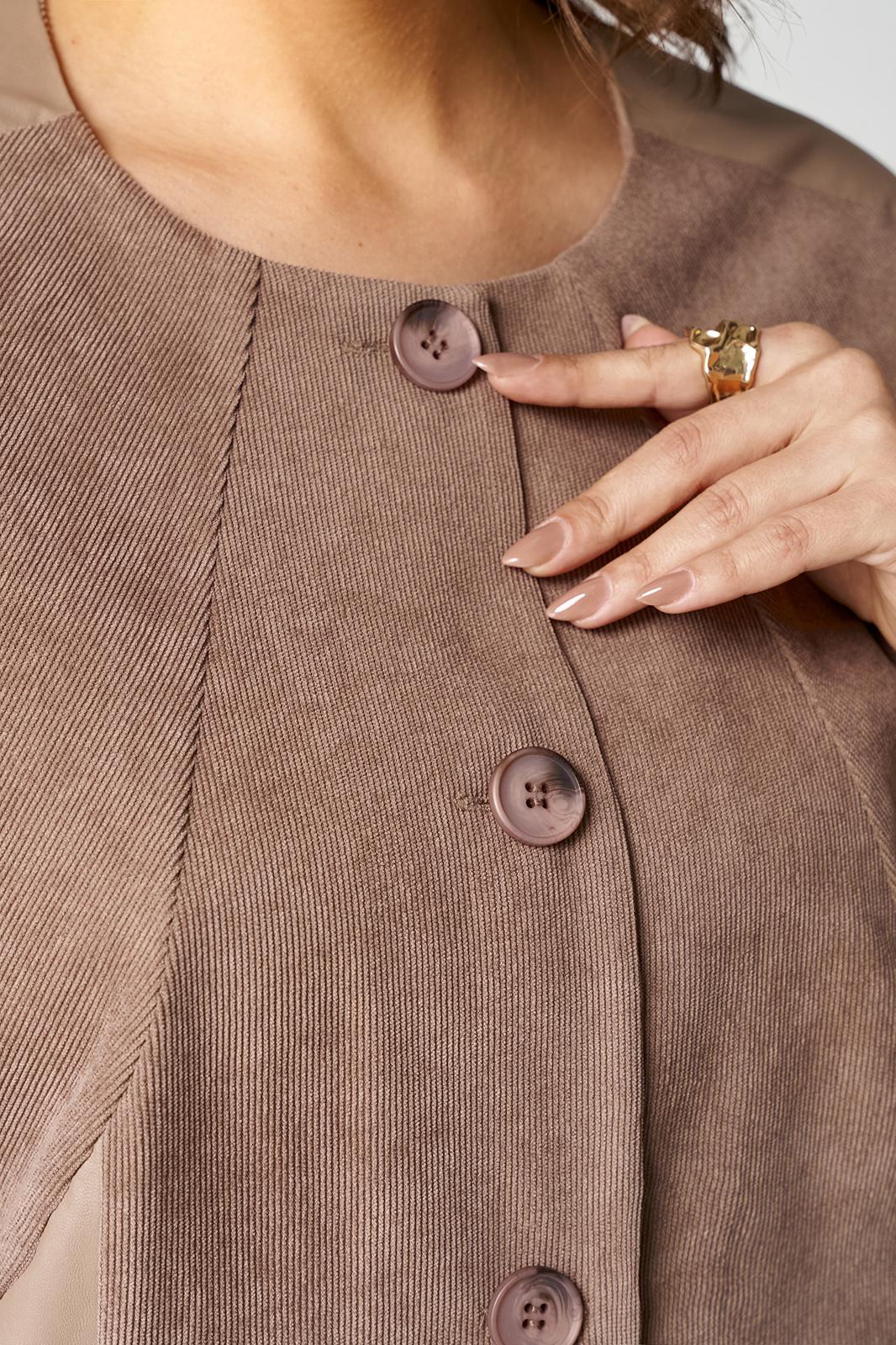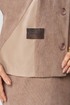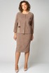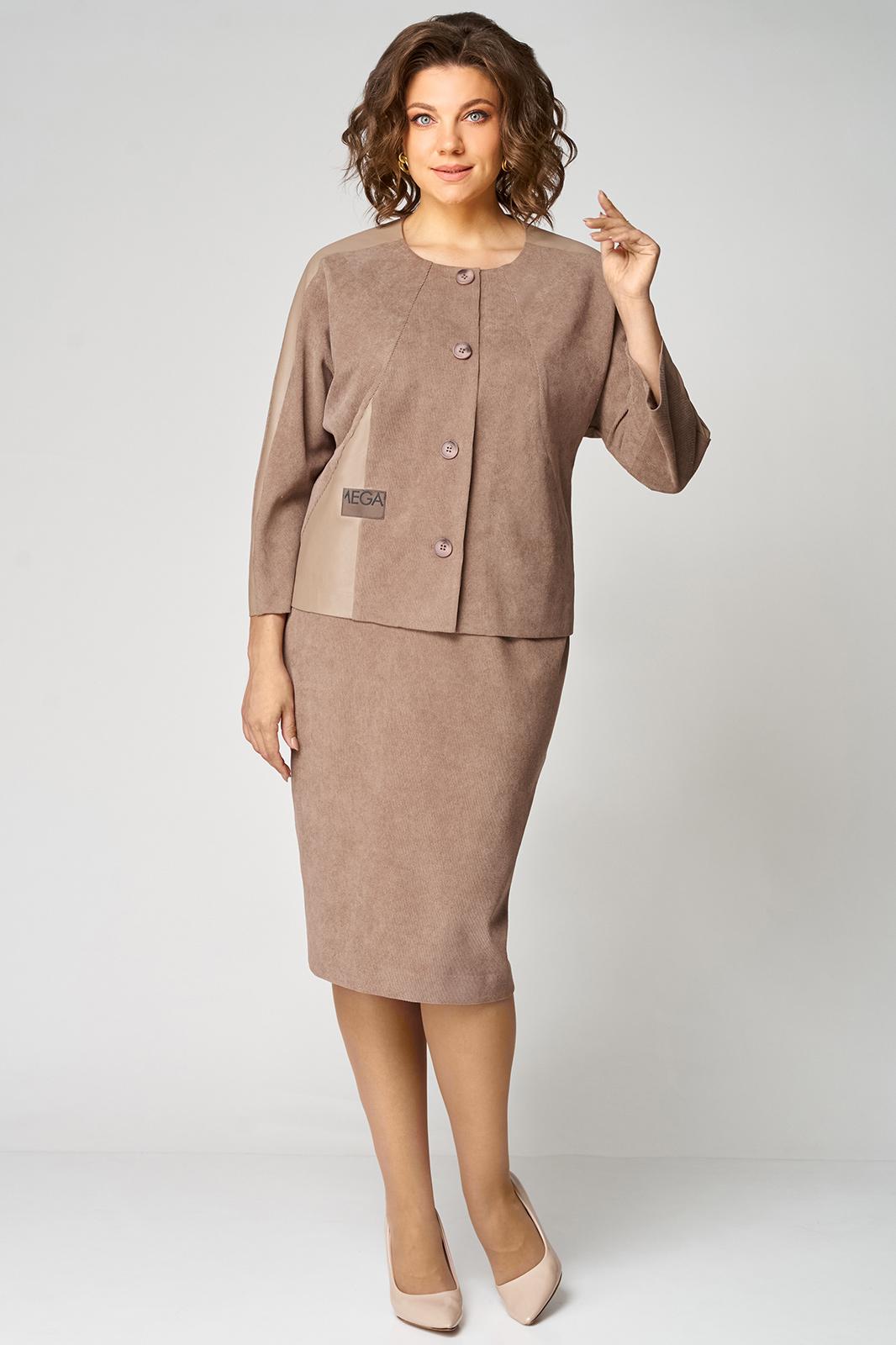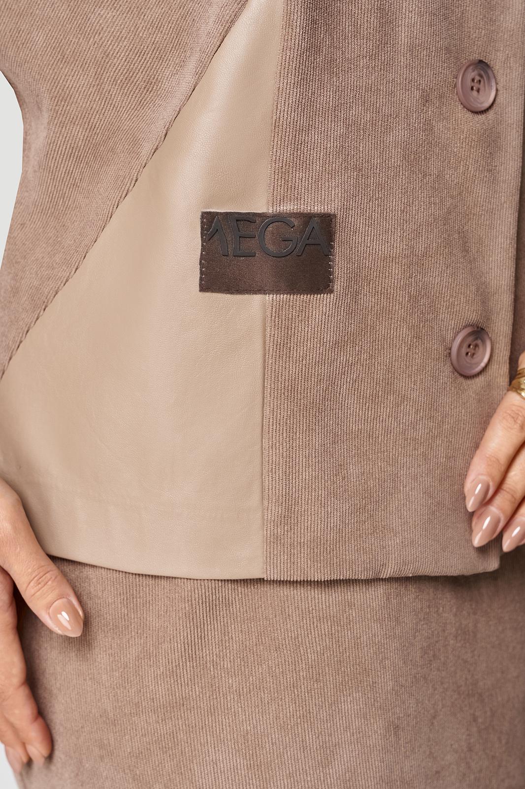 Костюм состоит из жакета и юбки. Жакет полуприлегающего силуэта, с цельнокроеным рукавом длиной 7/8. От плеча до низа рукава отделочная вставка из эко-кожи. По переду- фигурные наклонные рельефы. По правой стороне вставка из эко-кожи, настрочена нашивка контрастного цвета. Застёжка центрально-бортовая на 4 петли и 4 пуговицы. Юбка прямая, слегка зауженная к низу, на притачном поясе, по бокам с резинкой. Застёжка на 1 петлю и 1 пуговицу, и потайную молнию сзади в среднем шве, по низу шва разрез. Юбка на подкладке.