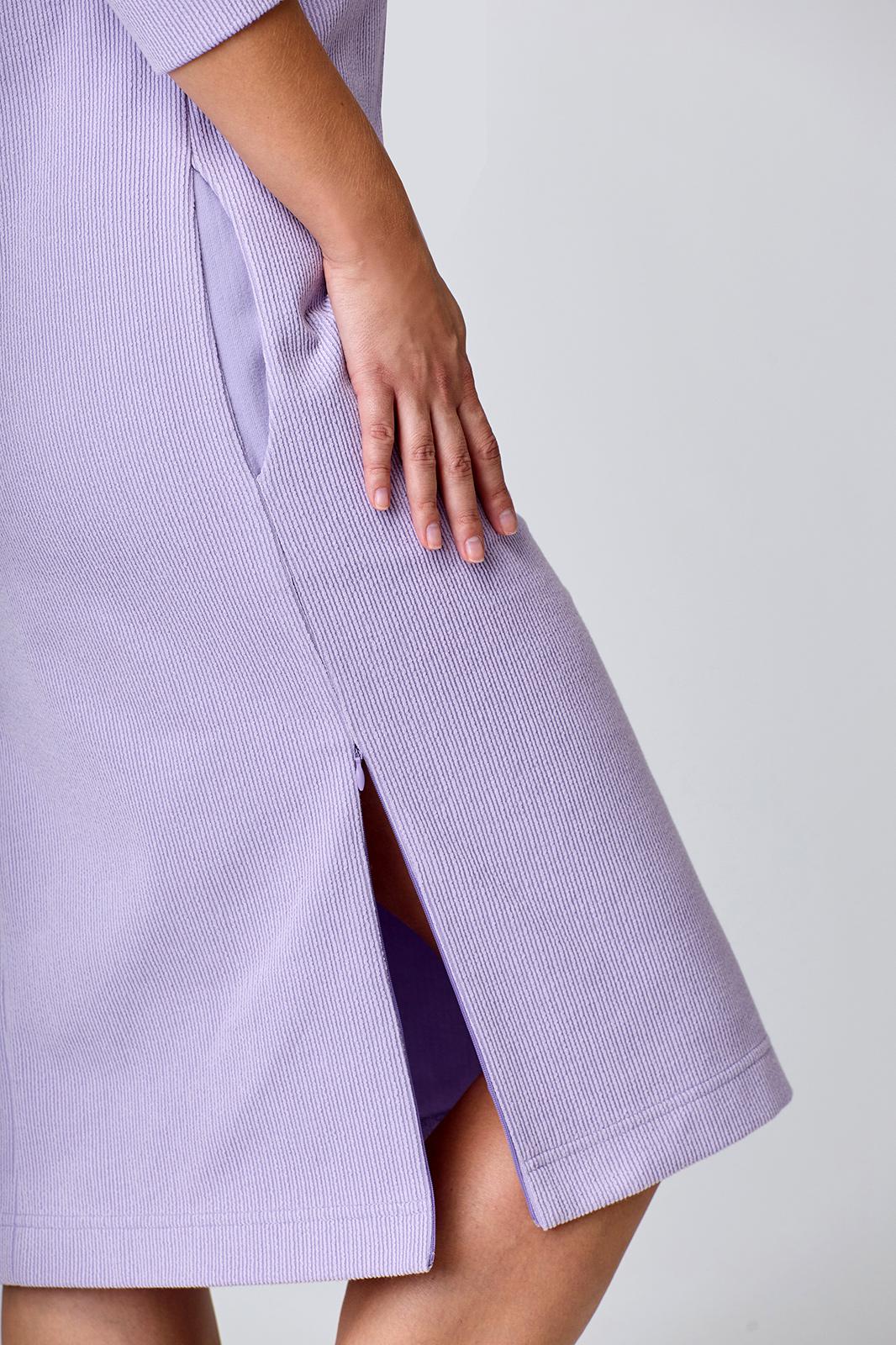 Платье прямого силуэта со спущенной линией плеча, по переду клапан с насточными декоративными алиментами. Спинка со средним швом и потайной застежкой молнией в среднем шве. Верхняя часть рукава декорированы отделочной тканью. Рукав с манжетой по низу. В левом боковом разрез с молнией. В боковых швах карманы. Длина платья 106 см, длина рукава от горловины 64 см