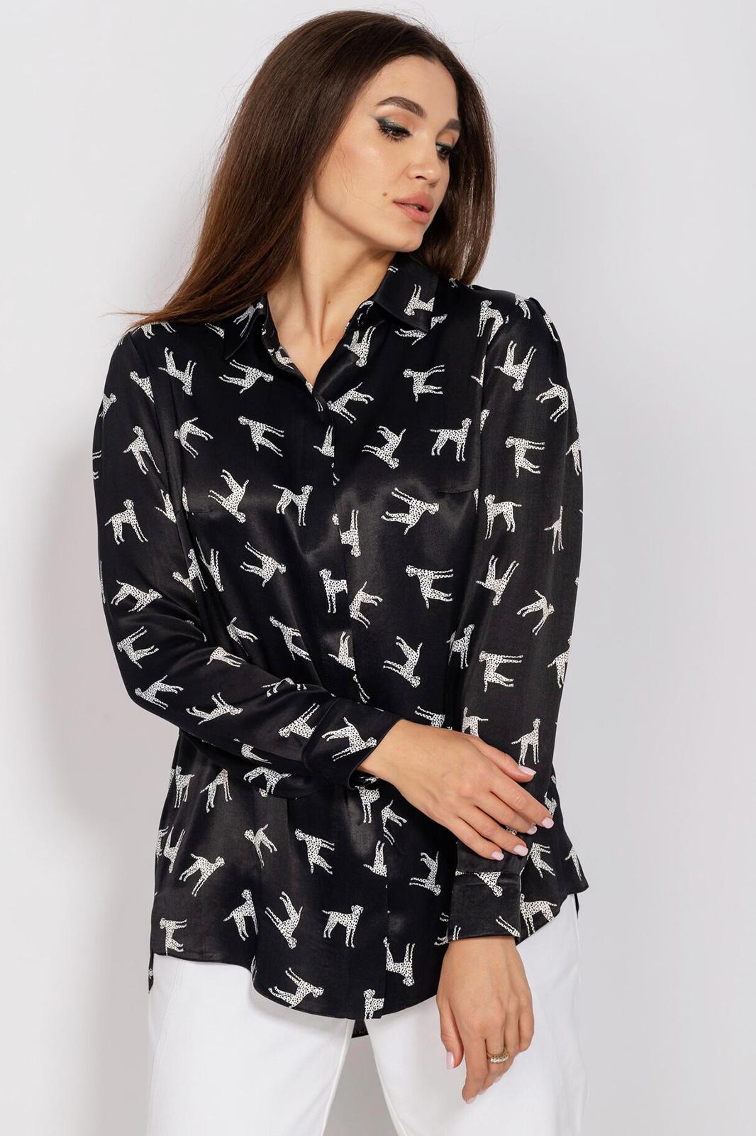 Блуза прямого силуэта с центральной потайной застежкой. Воротник стоячий отложной с отрезной стойкой. Перед с нагрудными вытачками. Спинка с отрезной кокеткой и встречной складкой по центру от кокетки. Рукав втачной, одношовный, рубашечного типа. По низу рукава обработанный разрез, две складки и притачная манжета с застежкой на две пуговицы. У блузы фигурный низ.