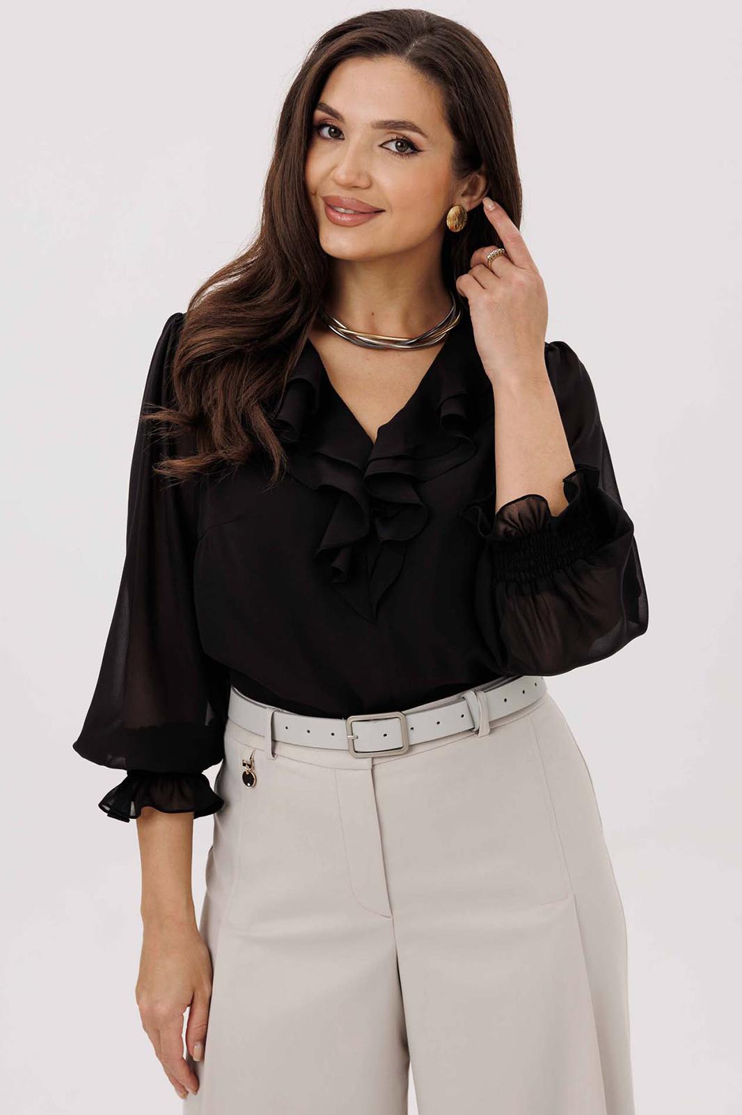 Блуза женская, рукав втачной со сборкой по окату. Рукав расширяется к низу. V-образный вырез с двойным воланом. Низ рукава обработан манжетой на венгерке. В комплекте топ хлопка(100%) на регулируемых бретелях.