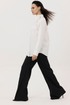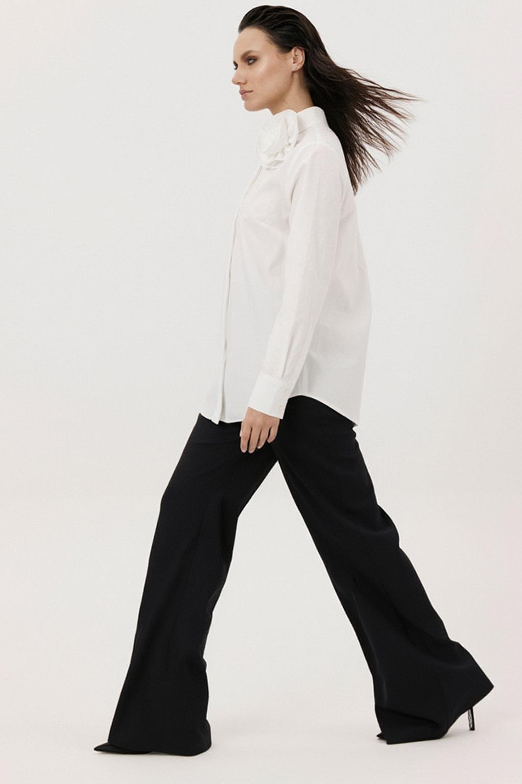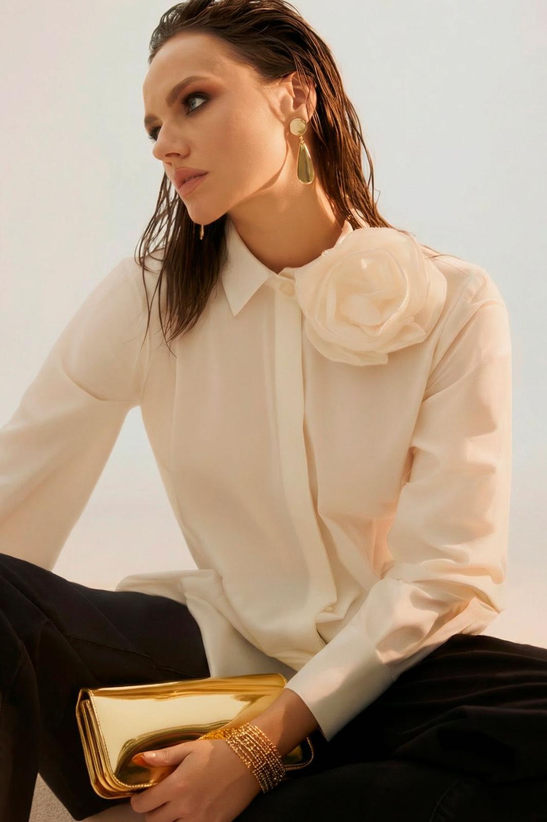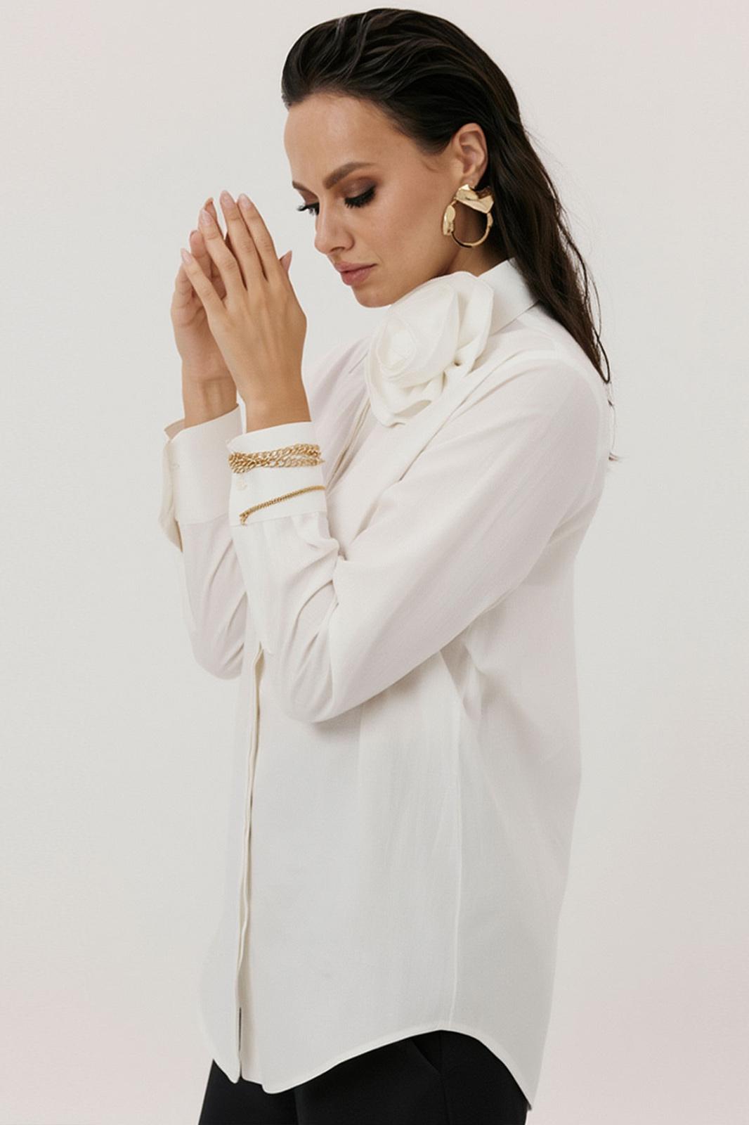 Блуза женская, прямого силуэта с потайной застежкой. Перед с нагрудными вытачками. Спинка с отрезной кокеткой. Воротник рубашечного типа, с отрезной стойкой. Рукав тачной, одношовный, с манжетой по низу. Низ фигурный. Декоративный цветок (съемный, пуговица)