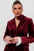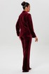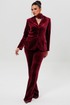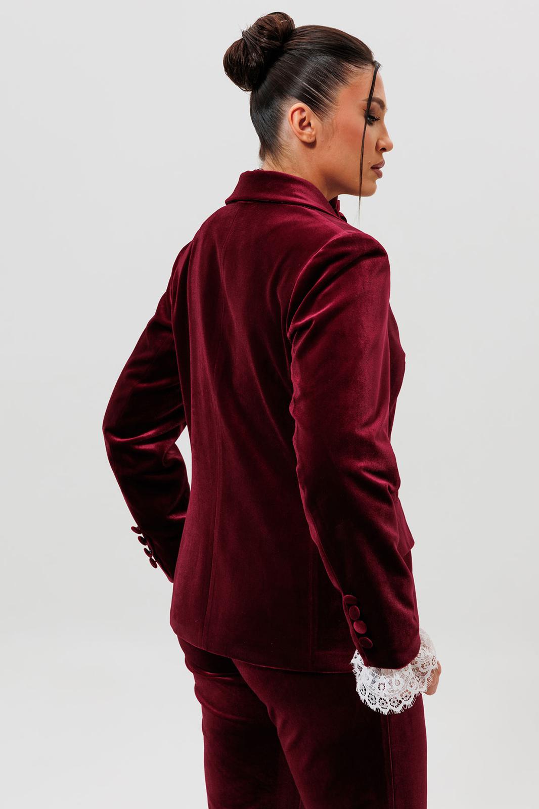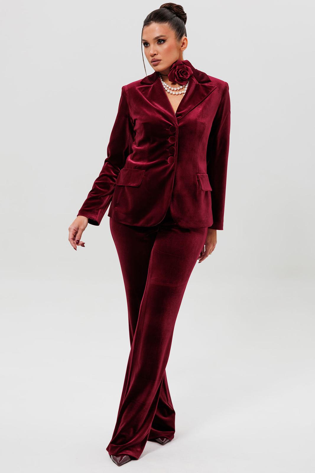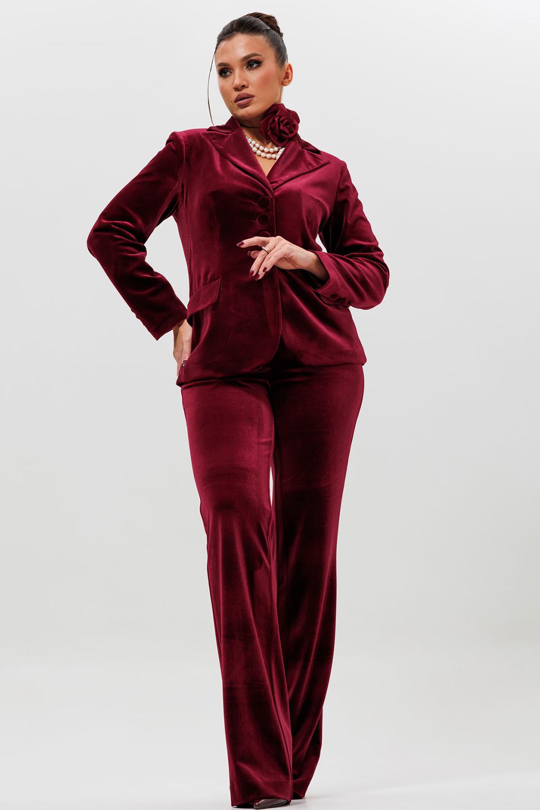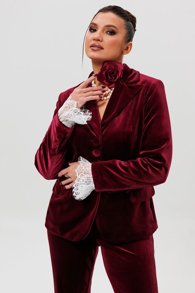 Роскошный бордовый бархатный костюм сотоит из жакета, кружевных манжет и брюк. Модель состоит из полуприлегающего жакета на подкладке и эффектных брюк, которые плавно расклешены к низу, создавая женственный и динамичный силуэт. Жакет с отложным воротником и декоративными пуговицами на рукавах подчеркивает стройность фигуры. Его можно носить отдельно с джинсами или юбками, делая образ универсальным. Брюки с притачным поясом удобно сидят по фигуре. Этот праздничный костюм бордового цвета — идеальный выбор для главной ночи года, который подарит вам уверенность и комфорт. Дополняют модель кружевные манжеты, которые фиксируются по руке на резинку