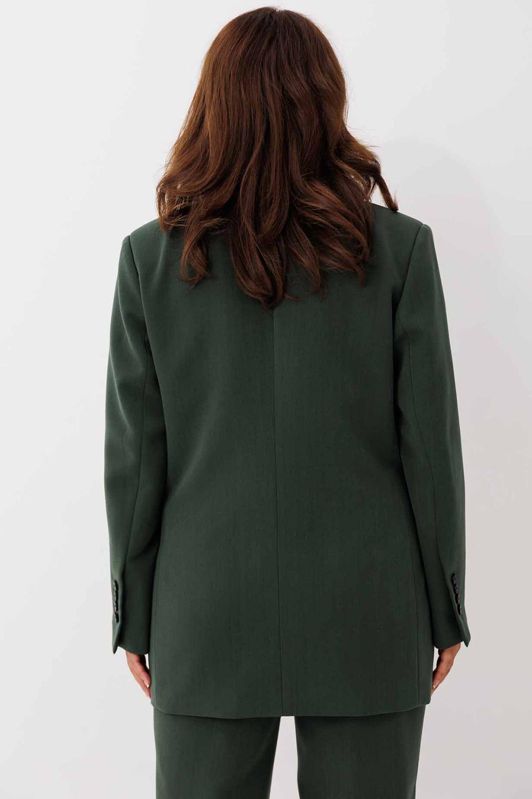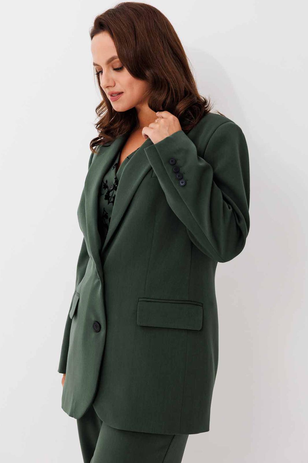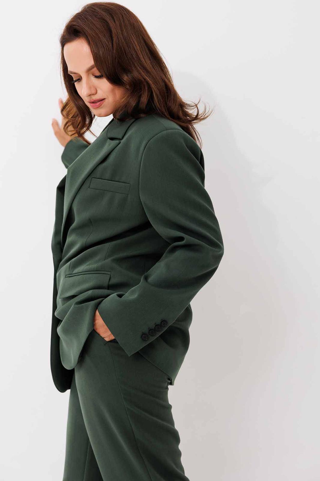 Элегантный женский костюм, состоящий из жакета и прямых брюк, выполнен из костюмной однотонной ткани. Жакет однобортный, на петлях и пуговицах, с английским воротником и клапанами по бокам. Рукав втачной, длина — полная. Посадка свободная, что обеспечивает комфорт и стильный силуэт. Брюки прямого кроя, на частичной резинке по поясу для удобной посадки и идеального прилегания. Костюм на подкладке, лёгкий, приятный к телу и подходит как для повседневной носки, так и для офиса или торжественного выхода.