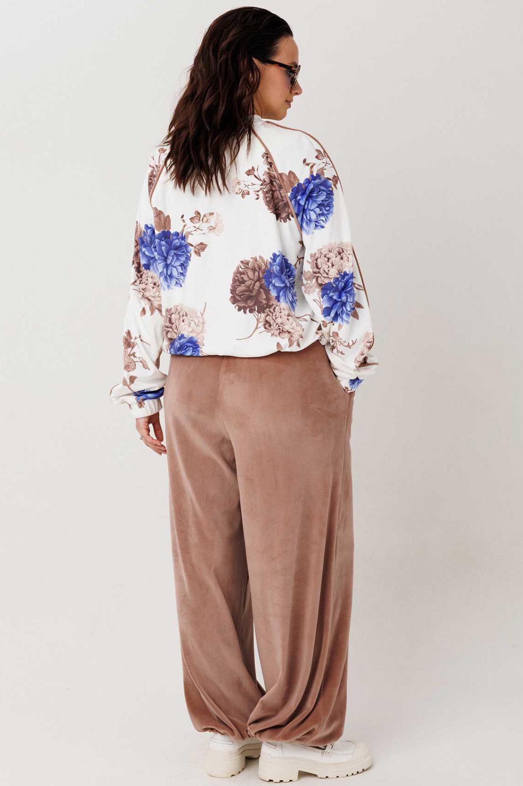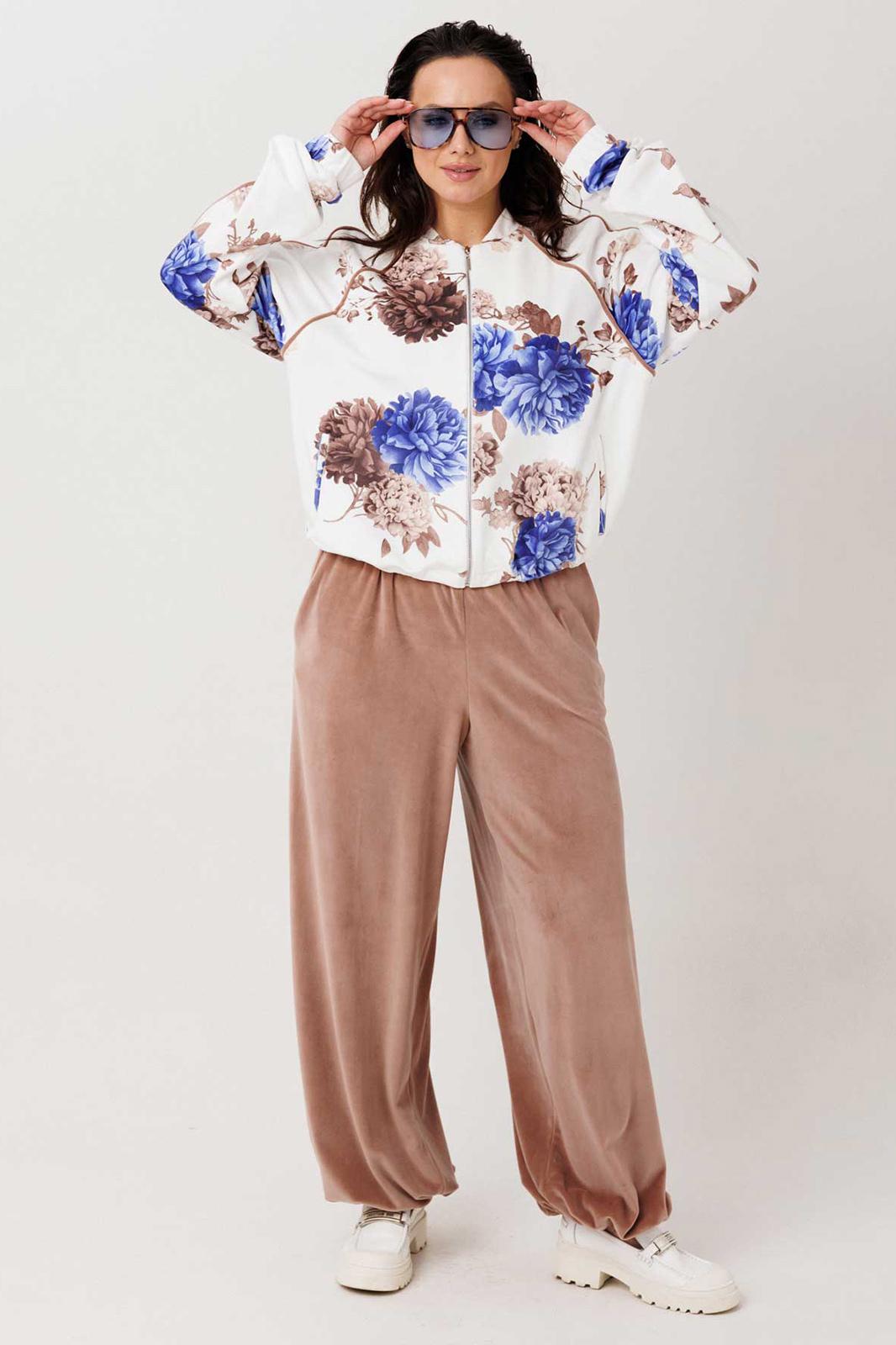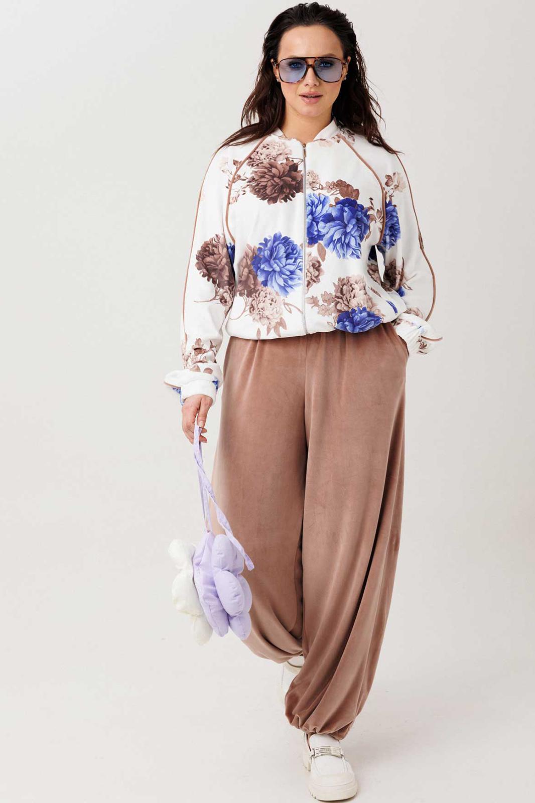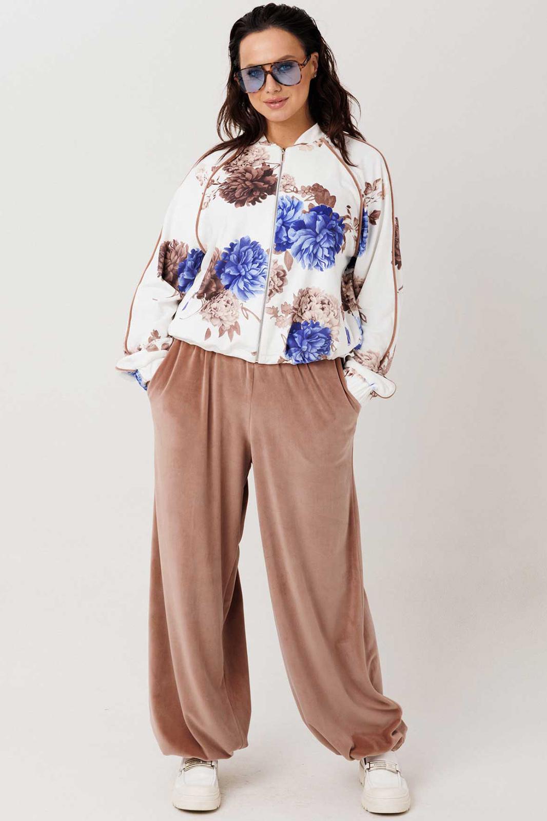 Мягкий, приятный к телу костюм из велюра, в котором хочется оставаться весь день. Лёгкое благородное сияние ткани добавляет образу ухоженности, а свободный крой делает его максимально комфортным для повседневной носки. Бомбер с застёжкой на молнию дополнен удобными карманами и регулируемой резинкой по низу — можно менять посадку и создавать более собранный или расслабленный силуэт. Широкие эластичные манжеты на рукавах обеспечивают комфорт и аккуратную посадку. Брюки свободного кроя с мягкой резинкой по талии не сковывают движения, а карманы добавляют практичности. Низ брюк также регулируется резинкой, позволяя варьировать форму — от более прямой до слегка собранной. Модель без подкладки — лёгкая, дышащая и идеально подходит для повседневных образов.