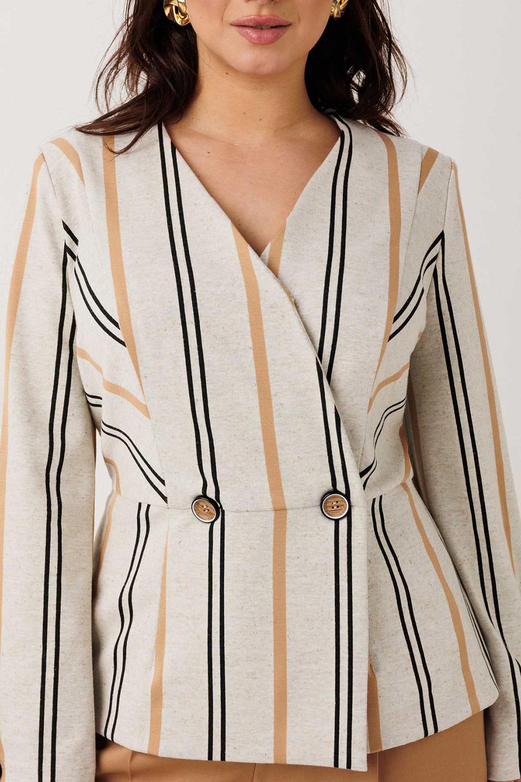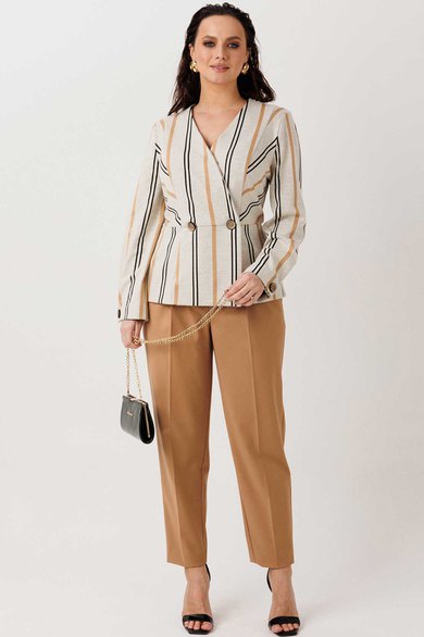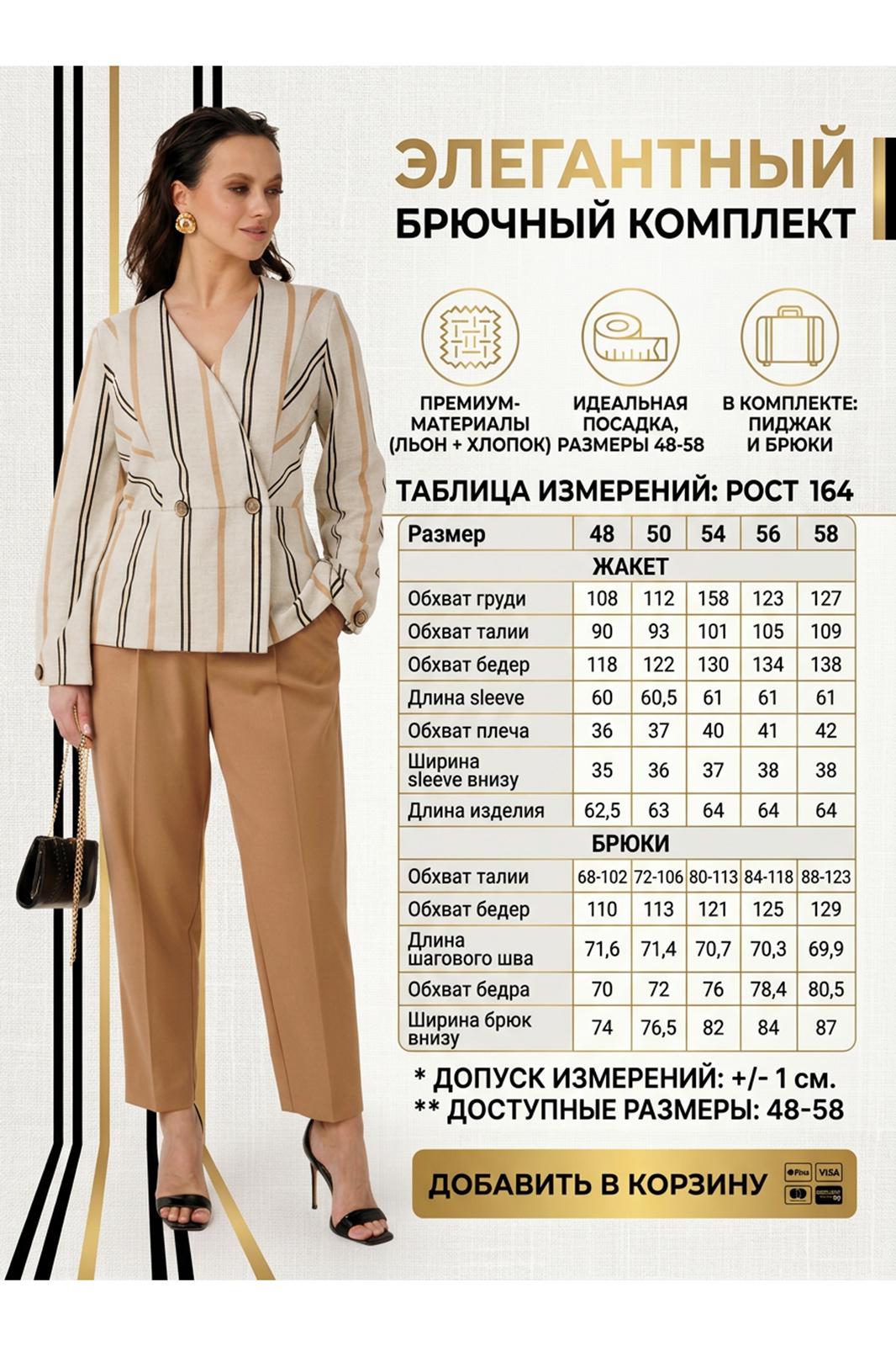 - Тип ткани: трикотаж+костюмная ткань - жакет: полиэстер 64%, вискоза 33%, спандекс 3%; брюки: полиэстер 100%
